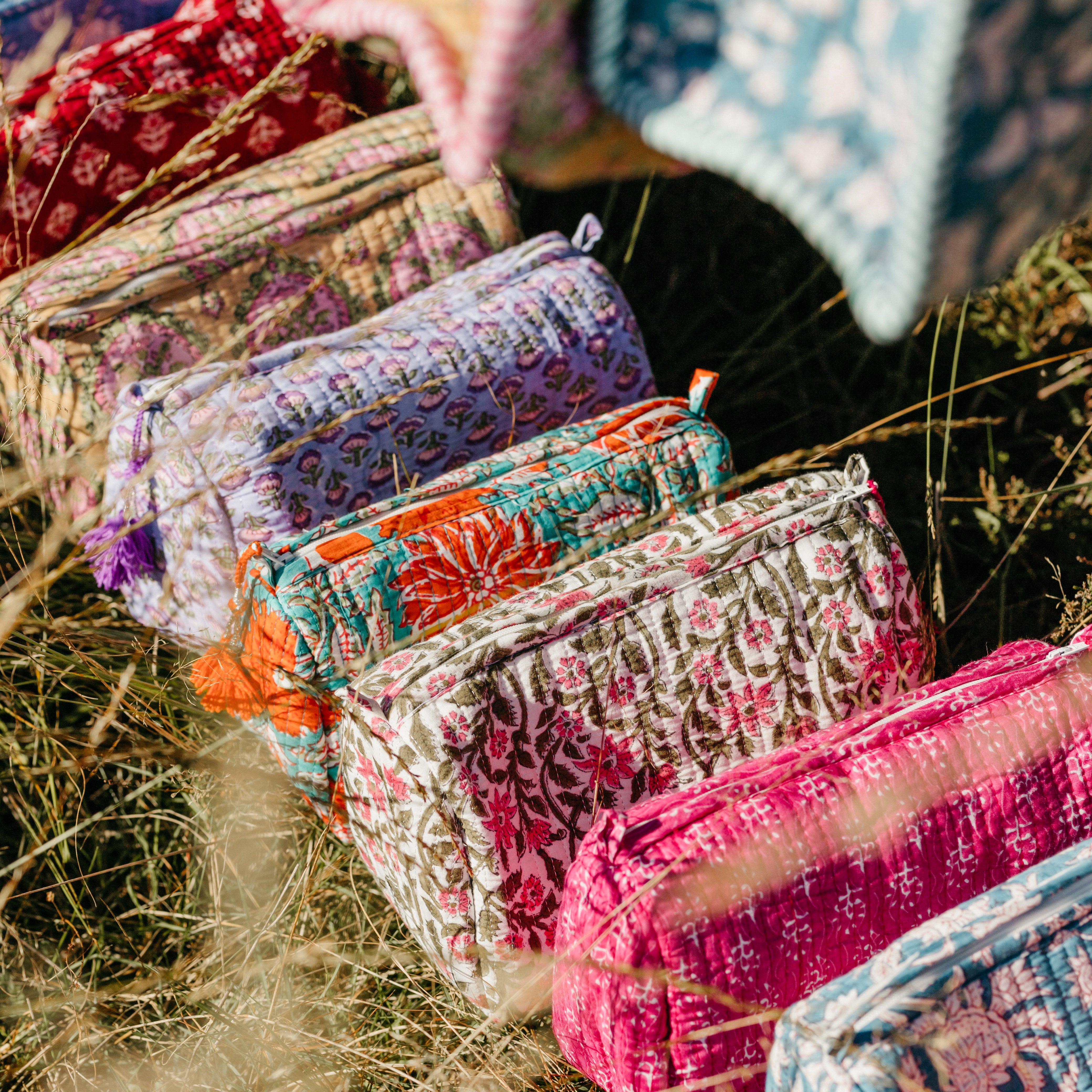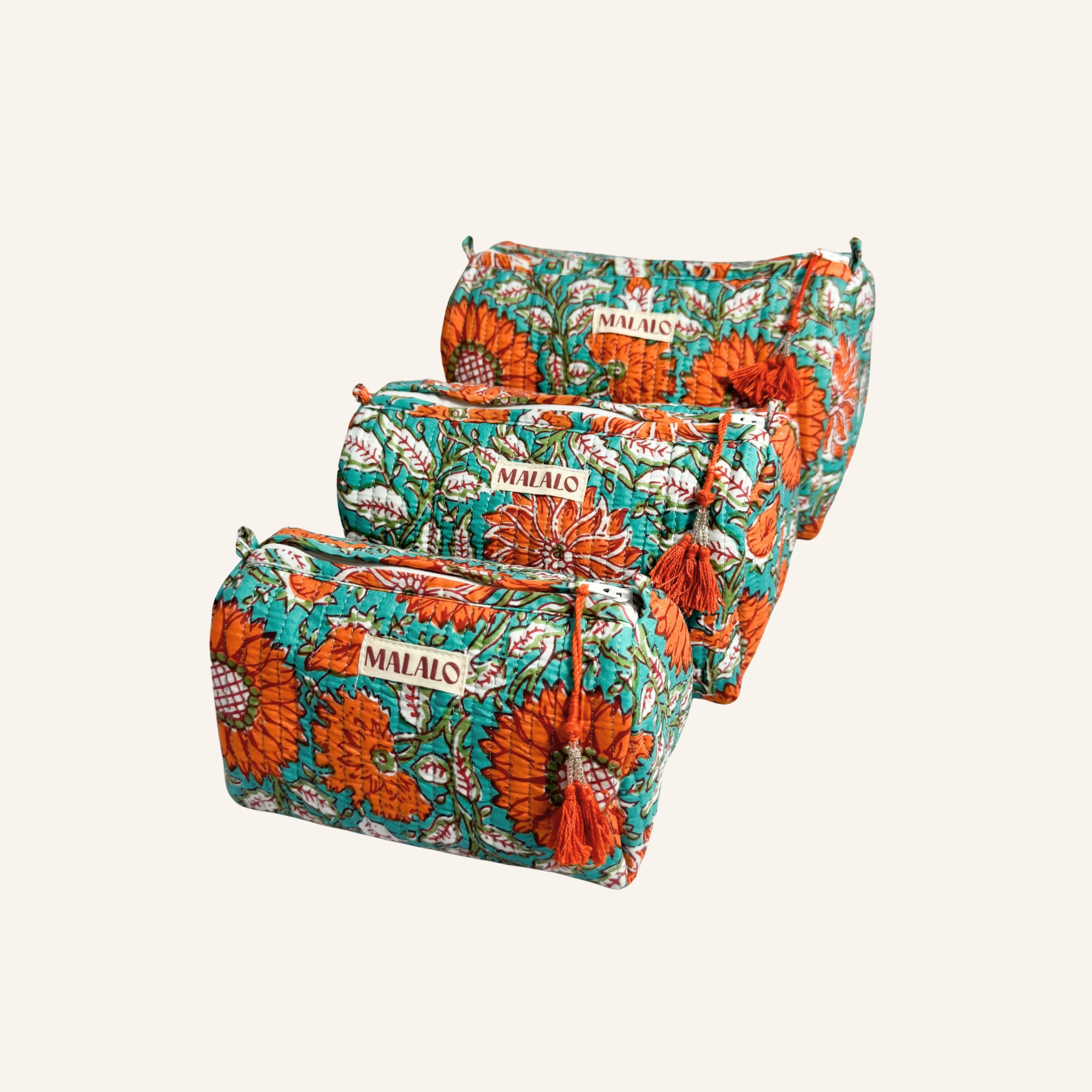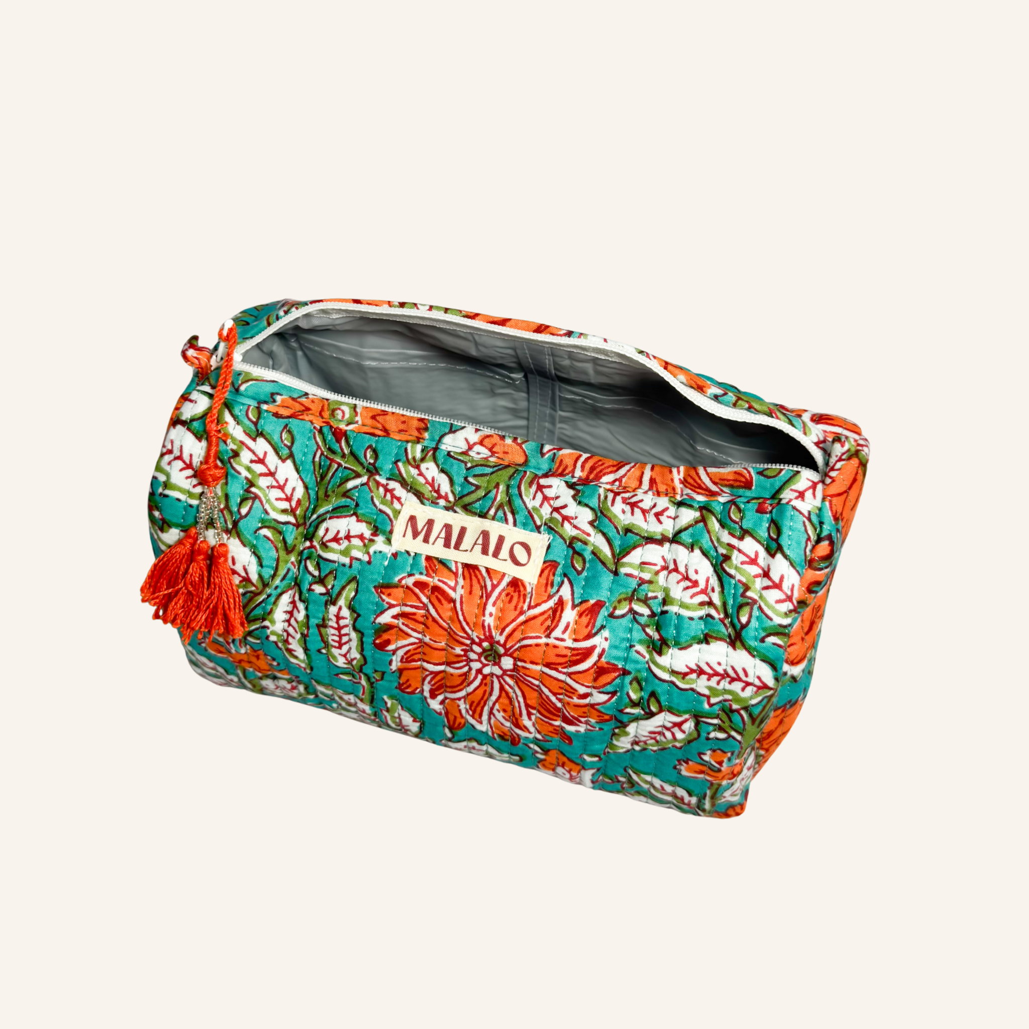 Refresh availabilityBreng kleur in je routine met deze katoenen toilettas met levendige bloemenprint in turquoise en oranje. Verkrijgbaar in drie maten – klein, middel en groot – en los of als set te bestellen. Dankzij de zachte katoenen stof, stevige voering en praktische ritssluiting is deze toilettas ideaal voor reizen of dagelijks gebruik. Perfect om make-up, verzorgingsproducten en accessoires overzichtelijk op te bergen. De vrolijke print en het speelse kwastje maken van elke tas een echte eyecatcher die stijl en functionaliteit combineert.