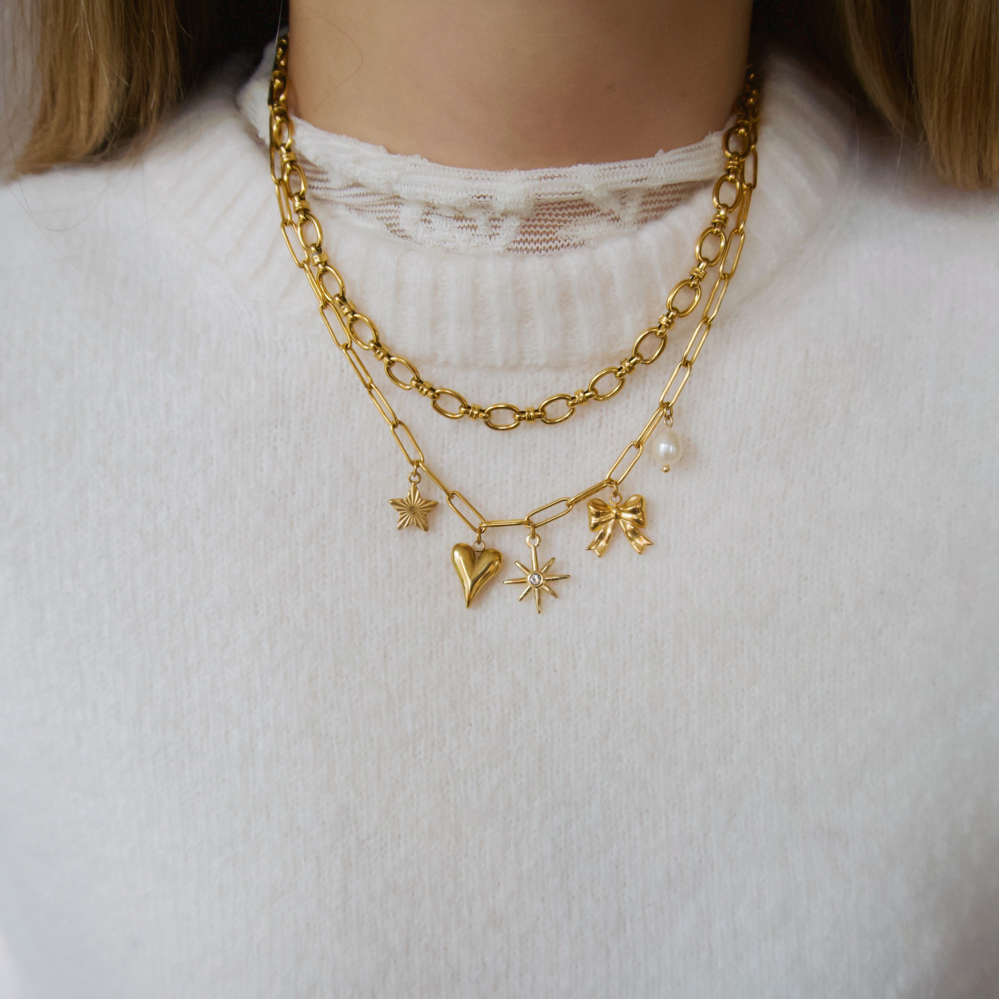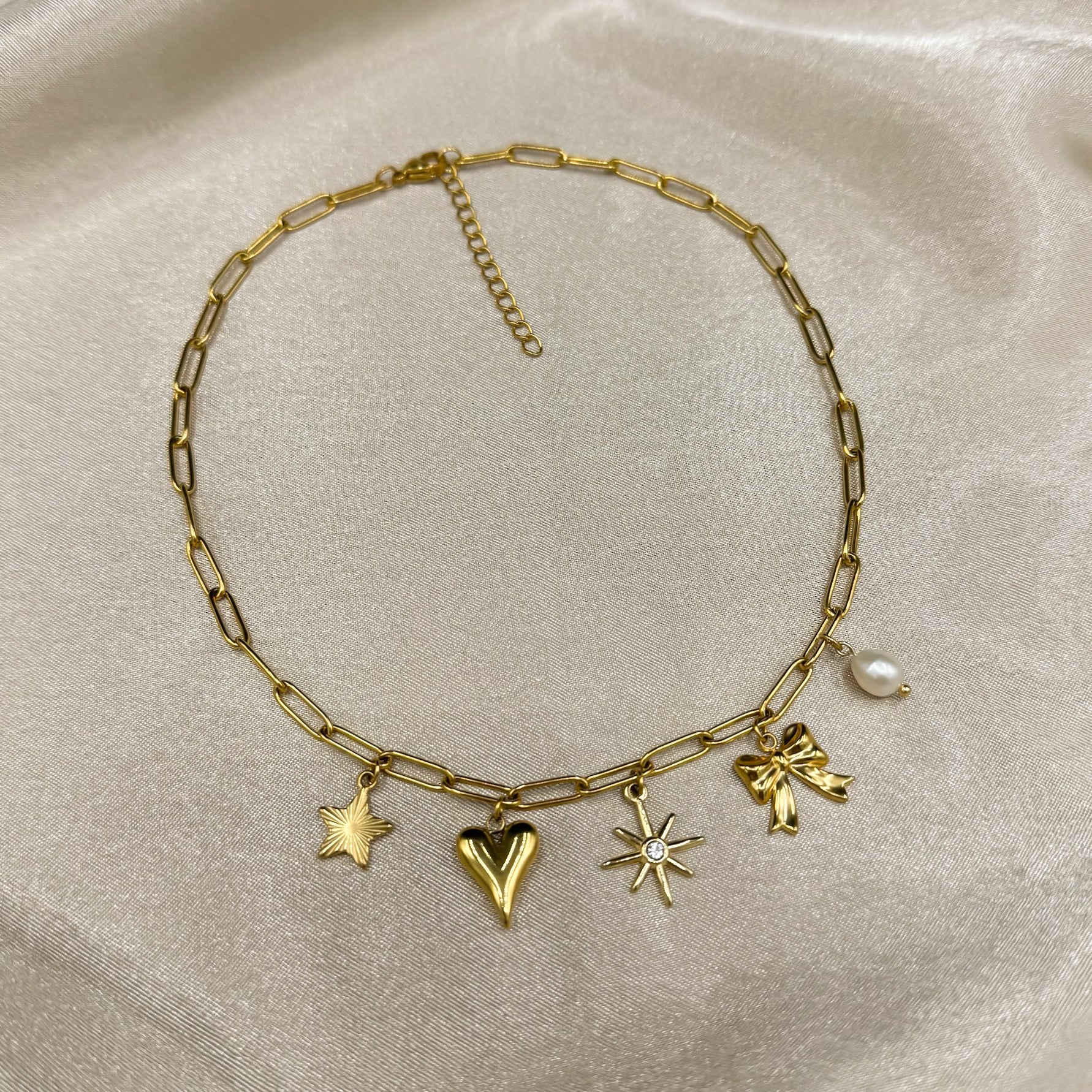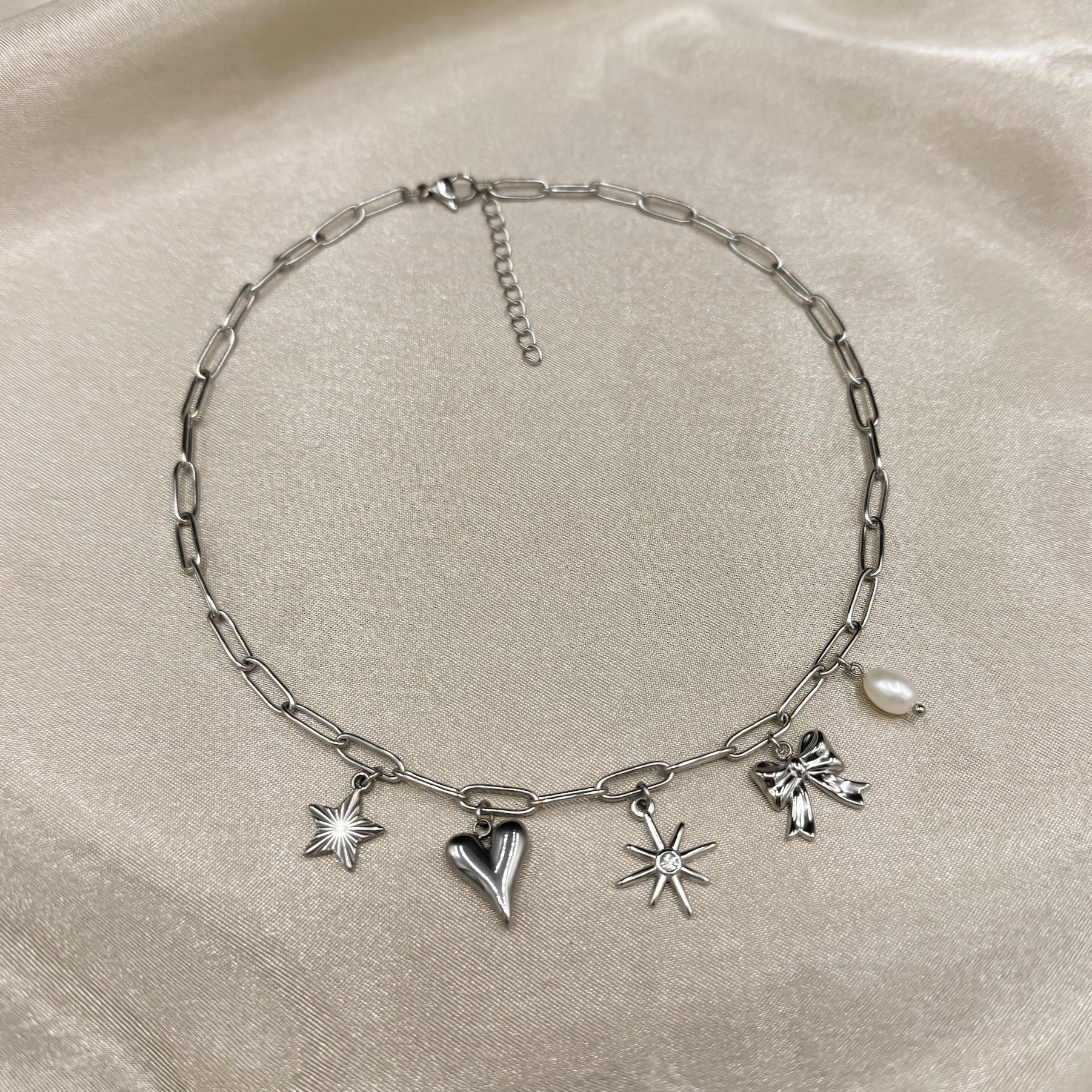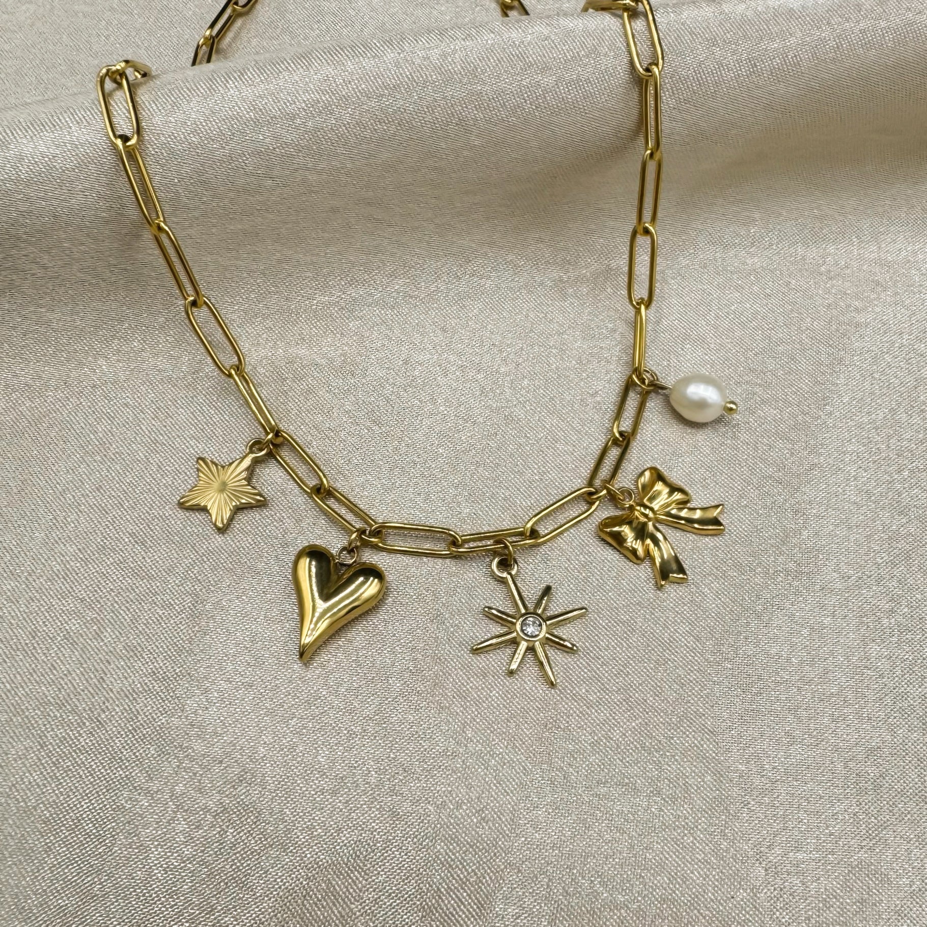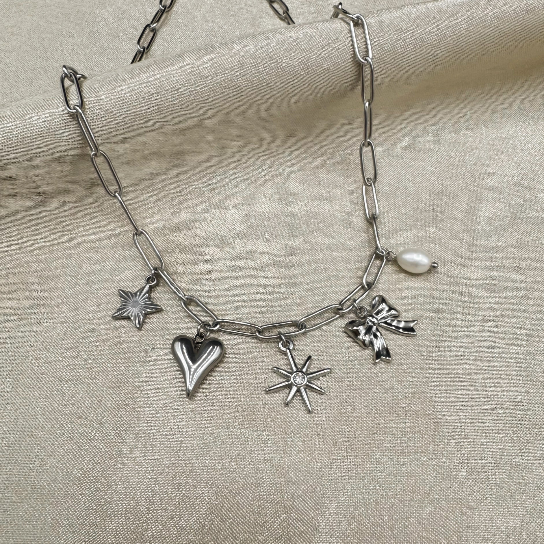 Met de Bowtiful Necklace geef je je look meteen een boost. Vijf verschillende bedels dansen speels aan de schakels, allemaal gemaakt van roestvrij staal (stainless steel) en verkrijgbaar in goud en zilver. Verstelbaar voor de perfecte fit, deze ketting past iedereen en voegt nét dat beetje extra glamour toe. De bijzondere details maken dit sieraad geschikt voor elke gelegenheid.