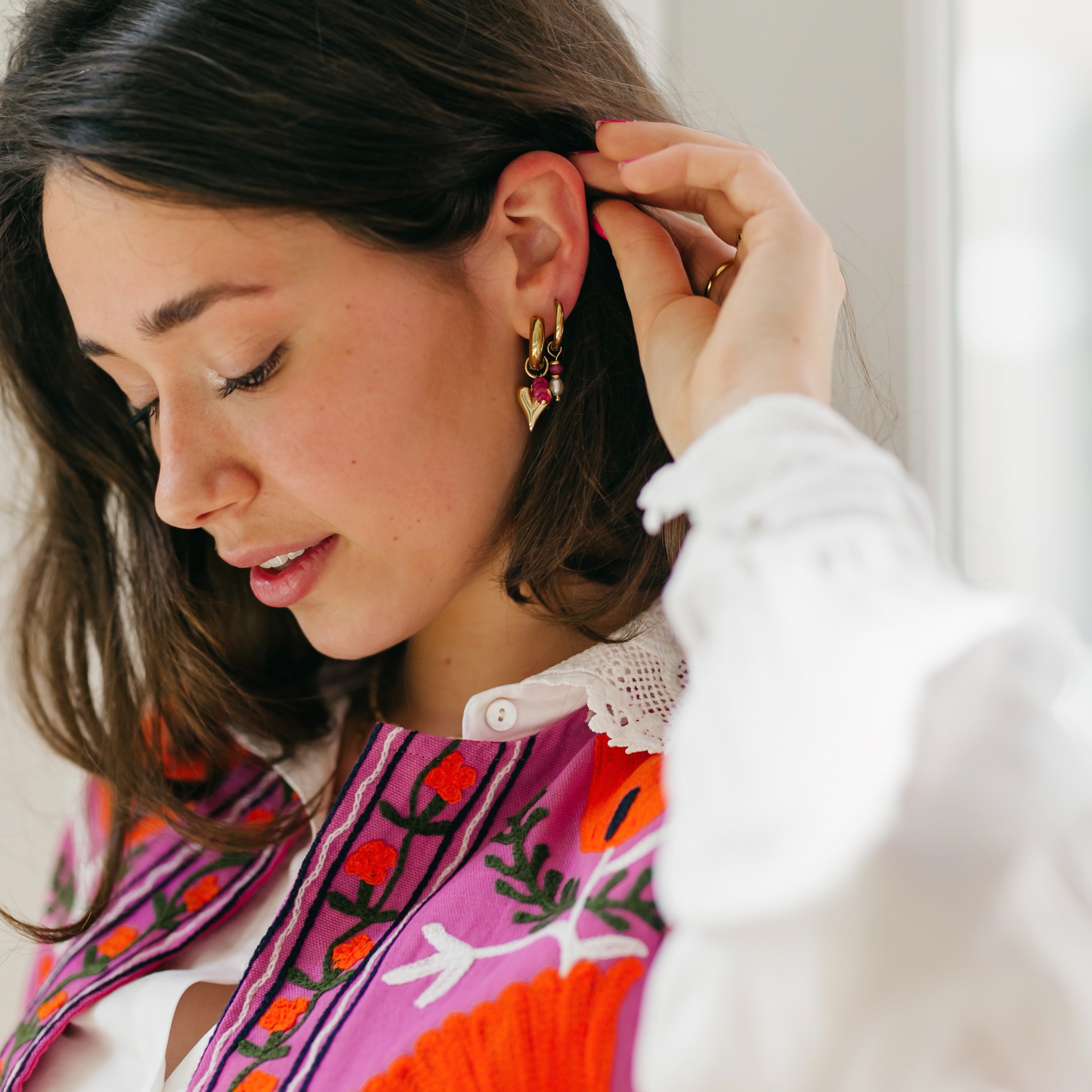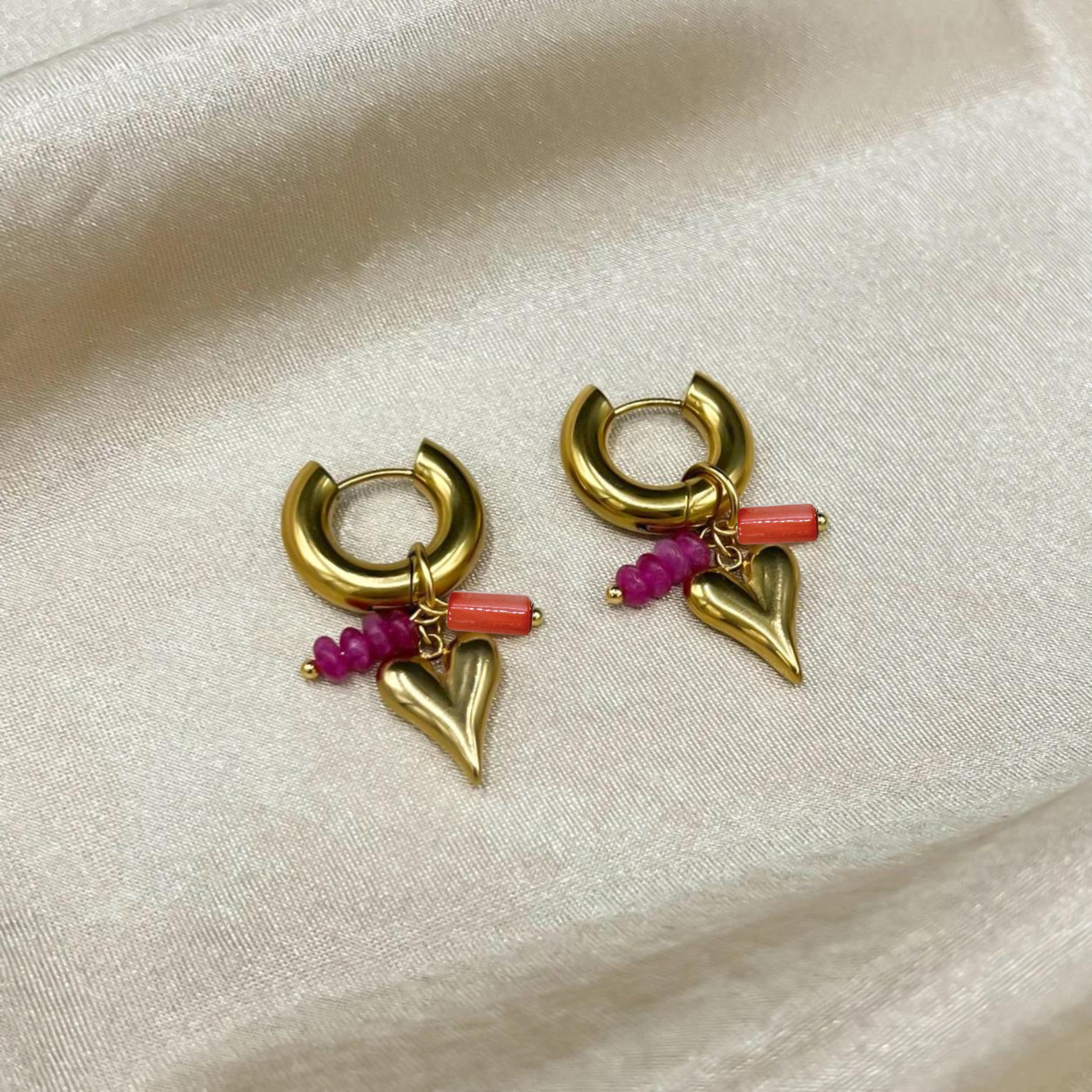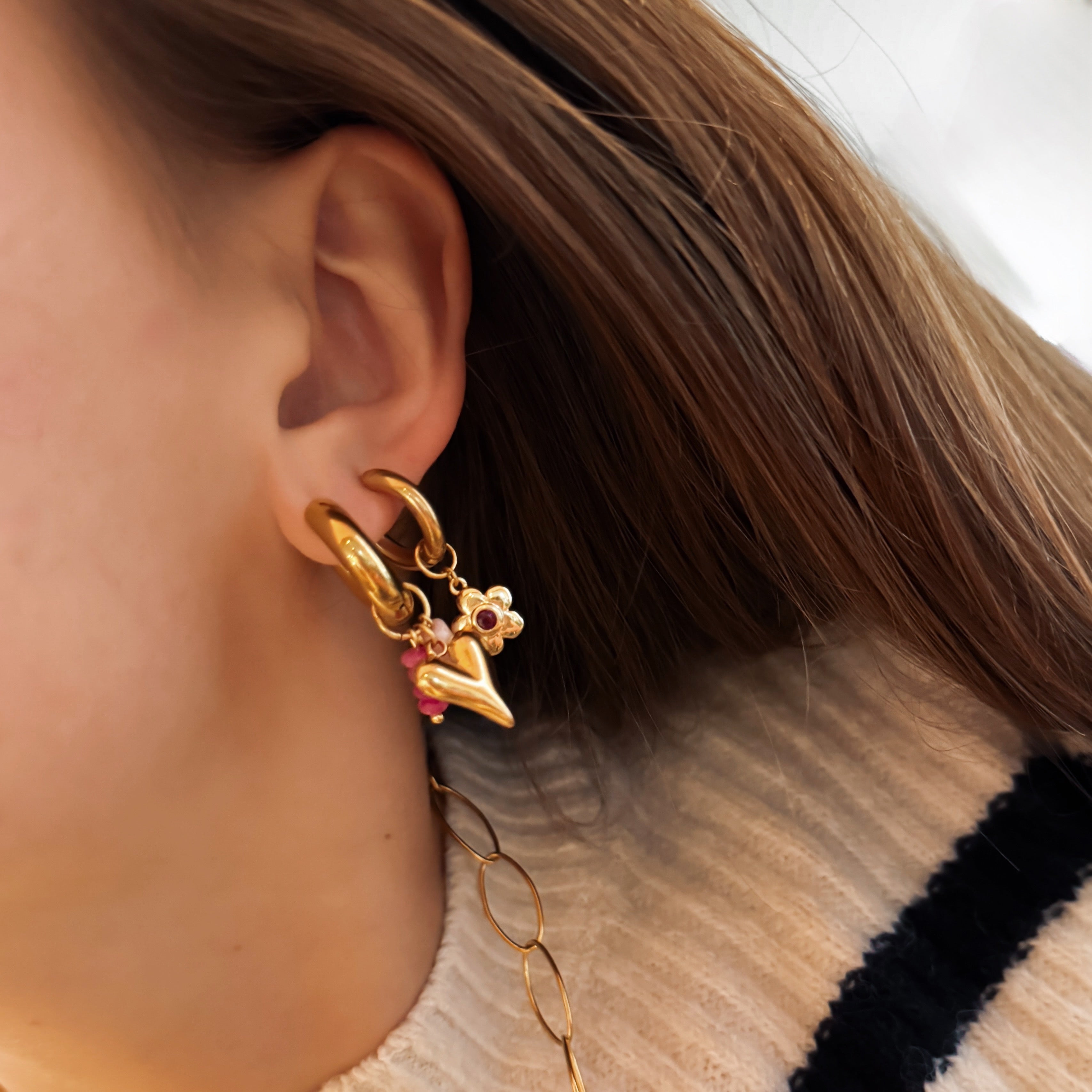 De Cheerful Earrings maken elke look net wat vrolijker. Deze chunky hoops van roestvrij staal (stainless steel) zijn verkrijgbaar in goud en zilver, en afgewerkt met kleurrijke bedels – waaronder een goud hartje en roze glaskralen. Perfect om mee te shinen op zonnige dagen of om je outfit een speels accent te geven. Combineer ze met onze bijpassende armband en ketting voor een complete look die niet onopgemerkt blijft.