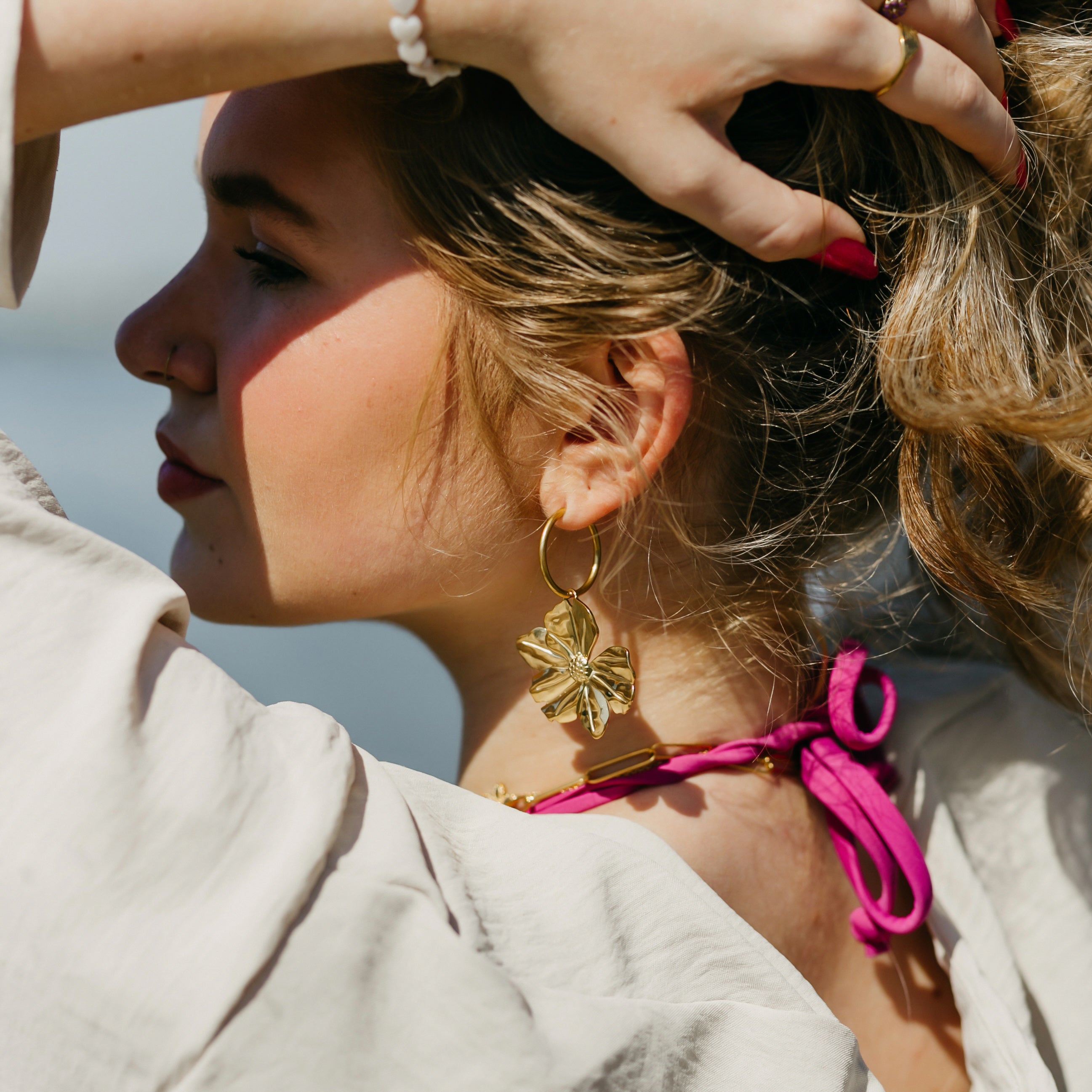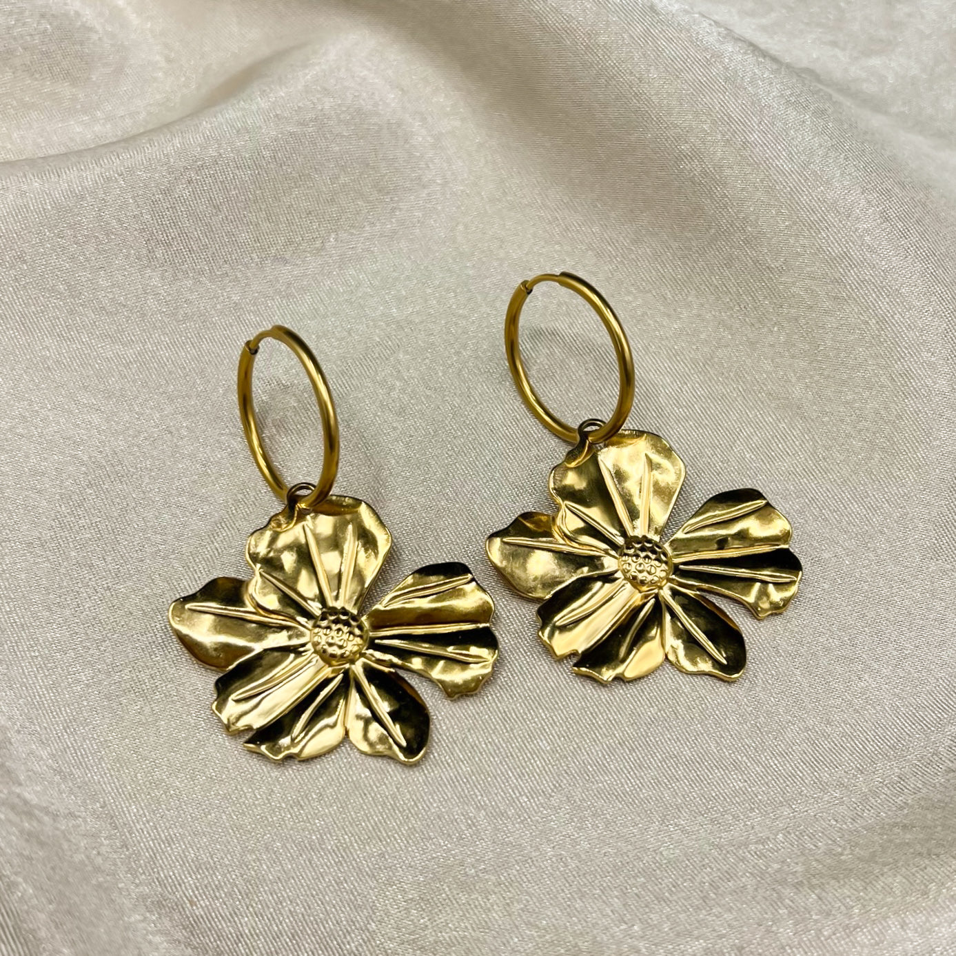Met de Flora Earrings steel je moeiteloos de show. Deze opvallende oorbellen met grote bloemhangers geven elke outfit een frisse, statement touch en laten je shinen op elk moment van de dag. Draag ze op zomerse dagen of tijdens een feestje – ze maken elke look net wat specialer. Gemaakt van roestvrij staal (stainless steel) en verkrijgbaar in zowel goud als zilver. Ze worden per paar verkocht.