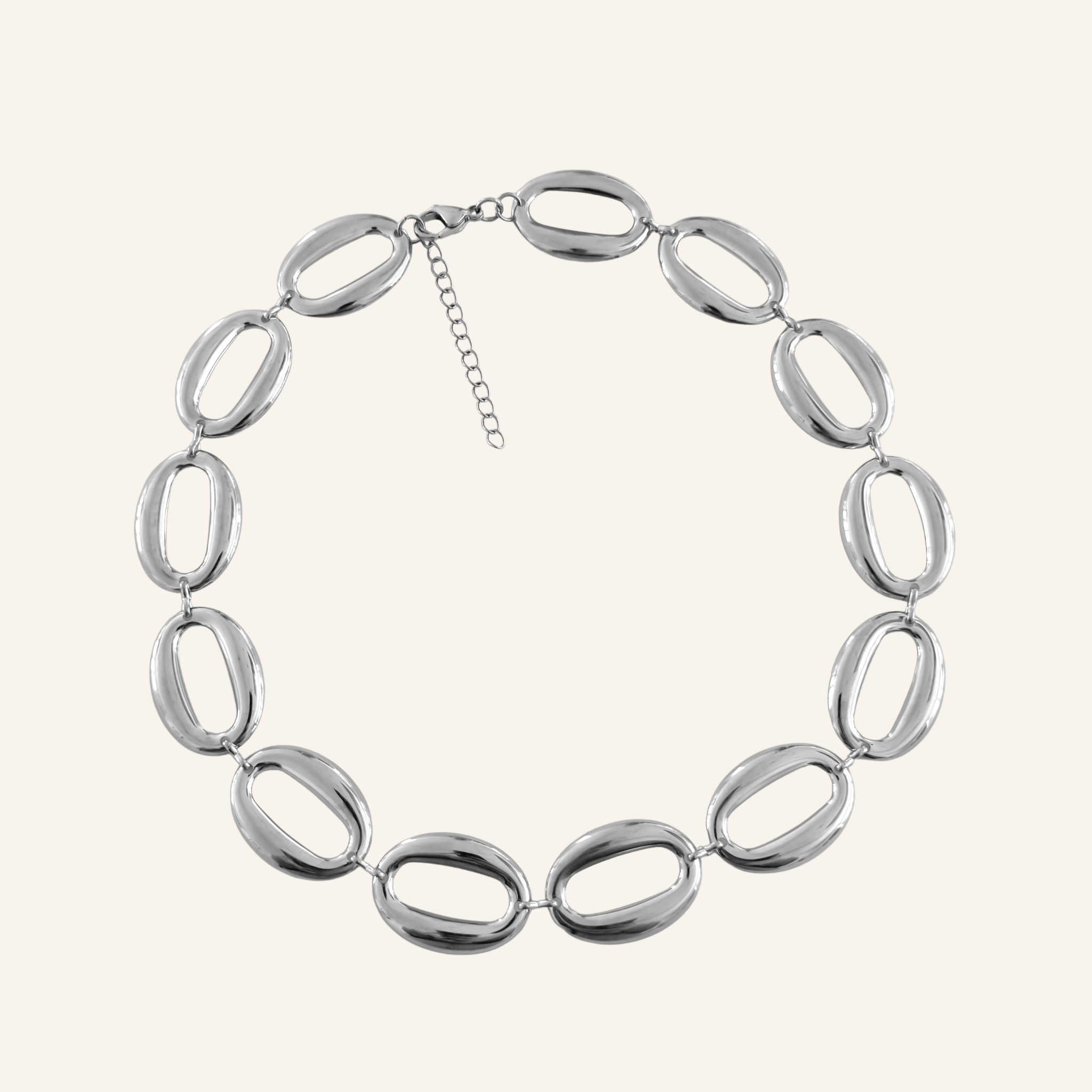 Grote open ovale schakels zijn dé trend voor wie zoekt naar een opvallende statement ketting met een classy uitstraling. Deze bold necklace van roestvrij staal, verkrijgbaar in goud en zilver, is gedurfd. De aaneengesloten ovals zorgen voor een krachtige look die je outfit direct naar een hoger niveau tilt. Perfect om solo te dragen of te combineren met de bijpassende Noval Essence bracelet of Noval Ring voor een complete set.
