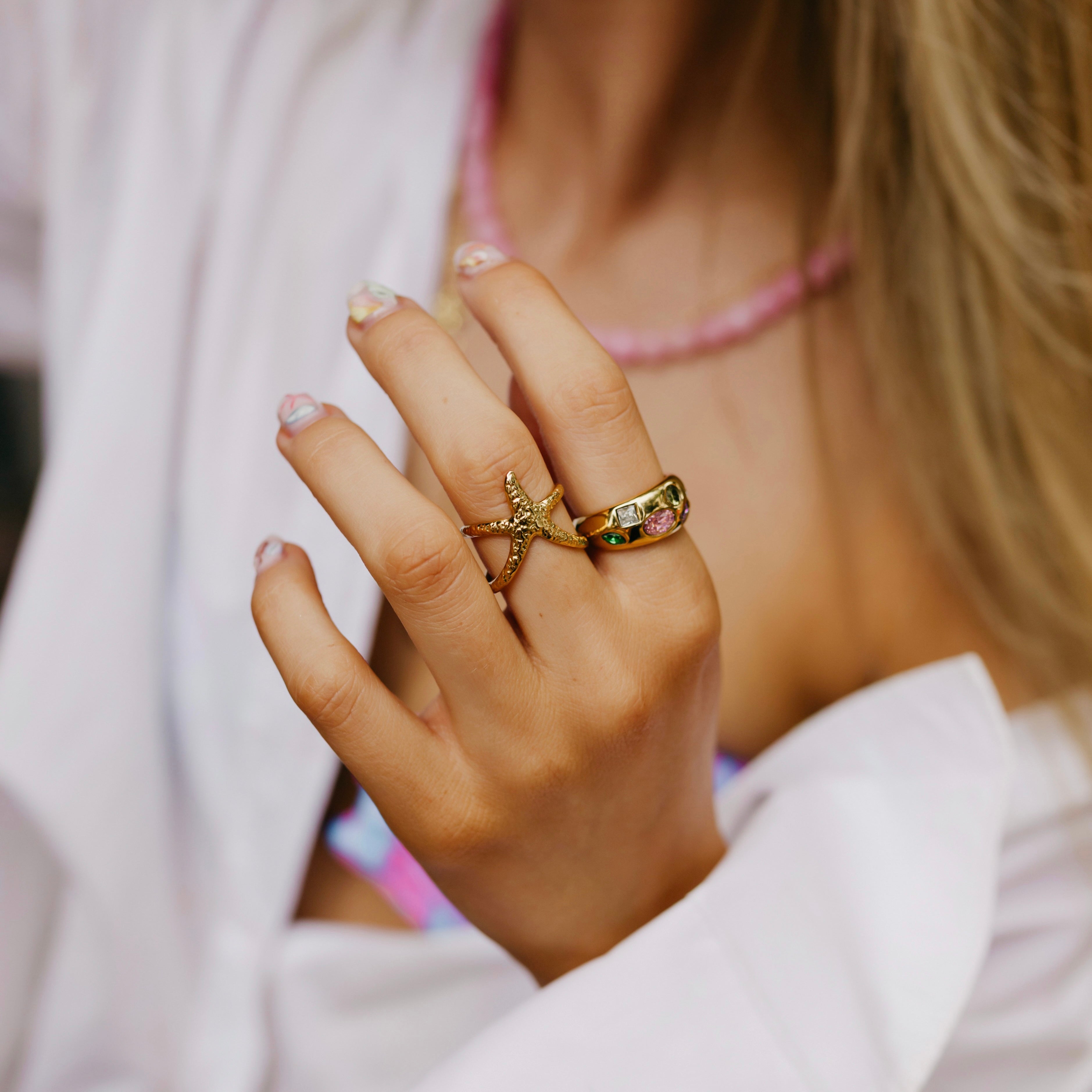 Refresh availabilityDraag de zomer altijd bij je met deze verstelbare Starfish Ring van roestvrij staal. De sierlijke zeester doet denken aan zonnige stranddagen en zoute zeewind, perfect voor een vleugje zeegevoel. Verkrijgbaar in goud en zilver, en ideaal om te combineren met andere beachy sieraden voor een effortless summer look. Of je nu schelpen zoekt aan de kust of droomt van de oceaan op kantoor, deze ring brengt de zee naar je vingertoppen.