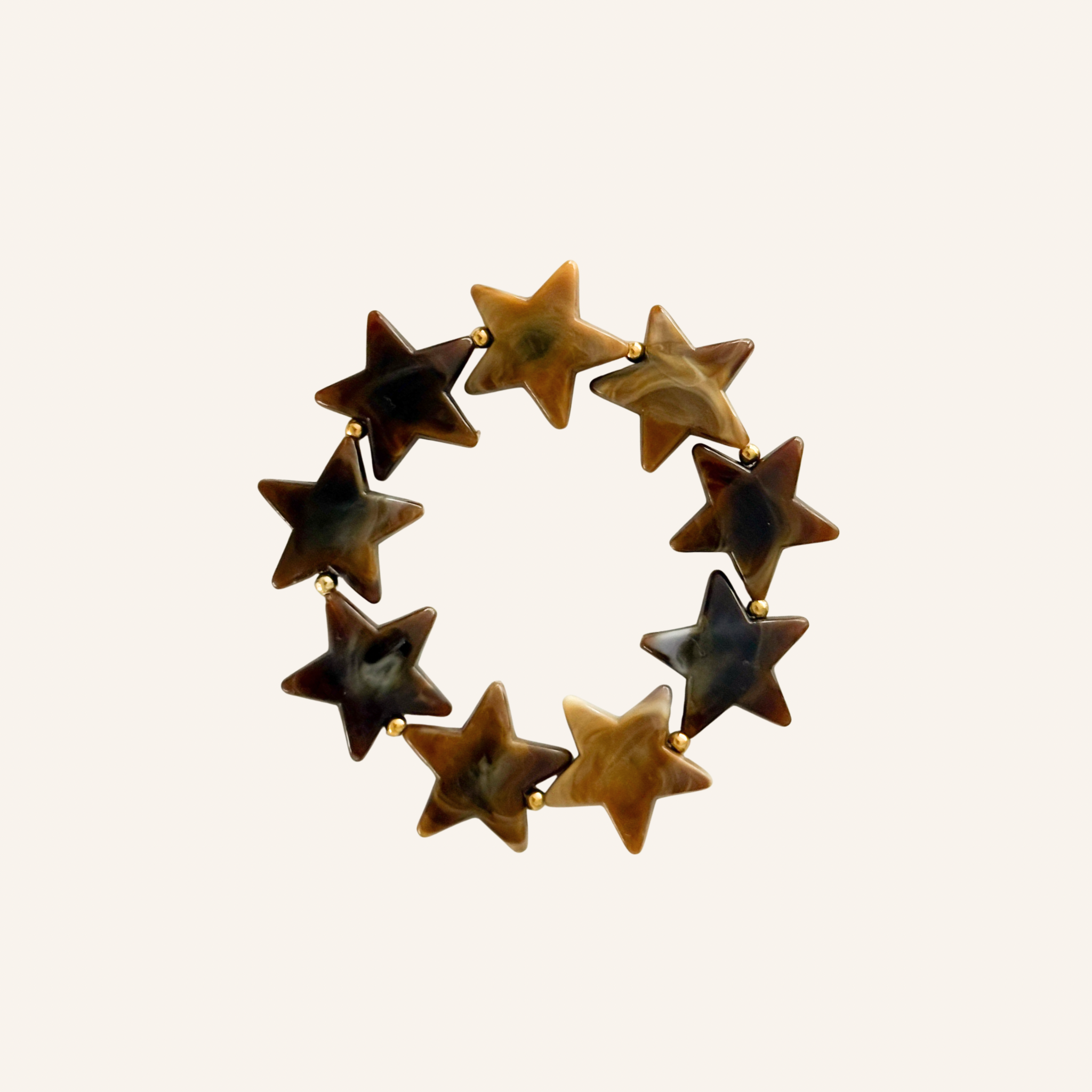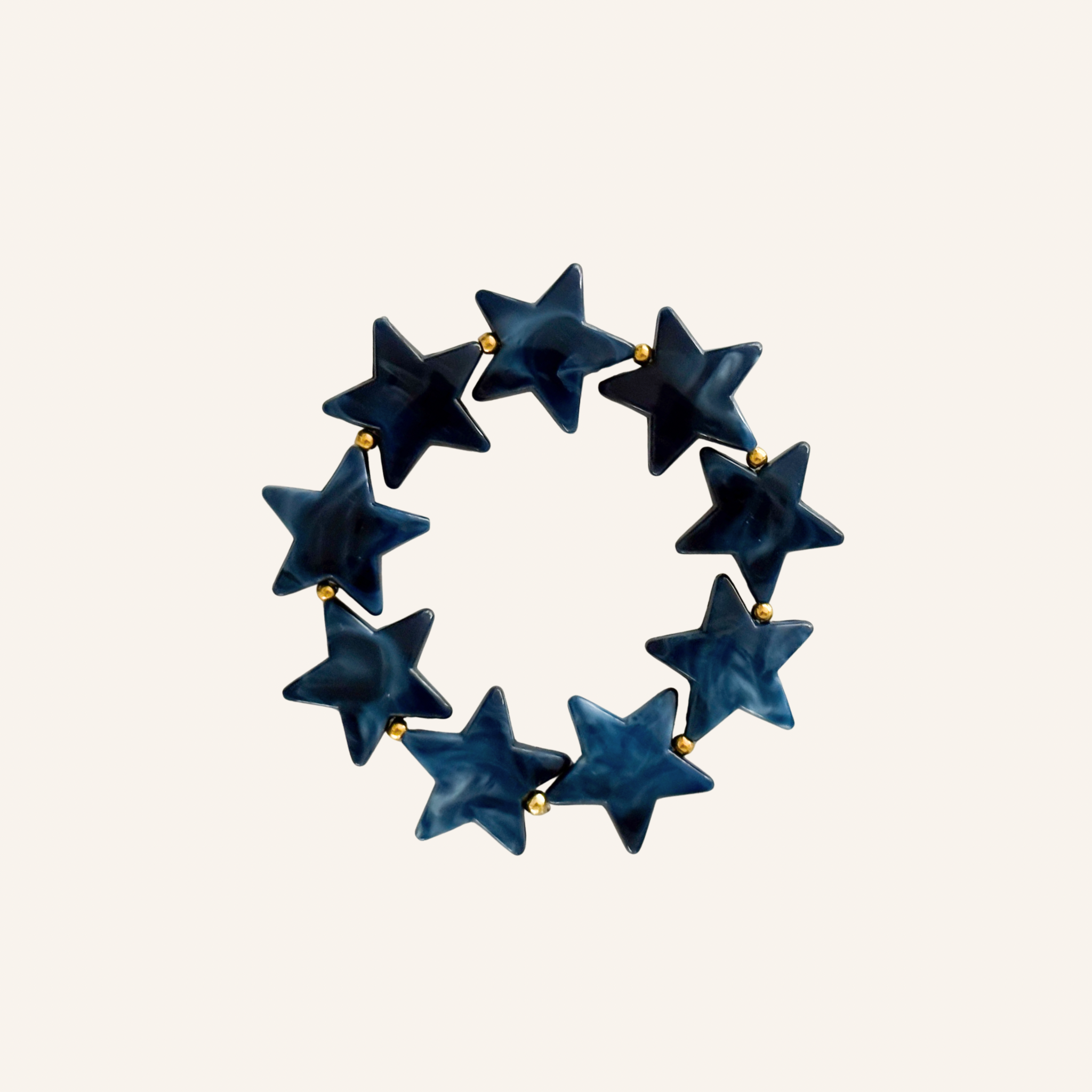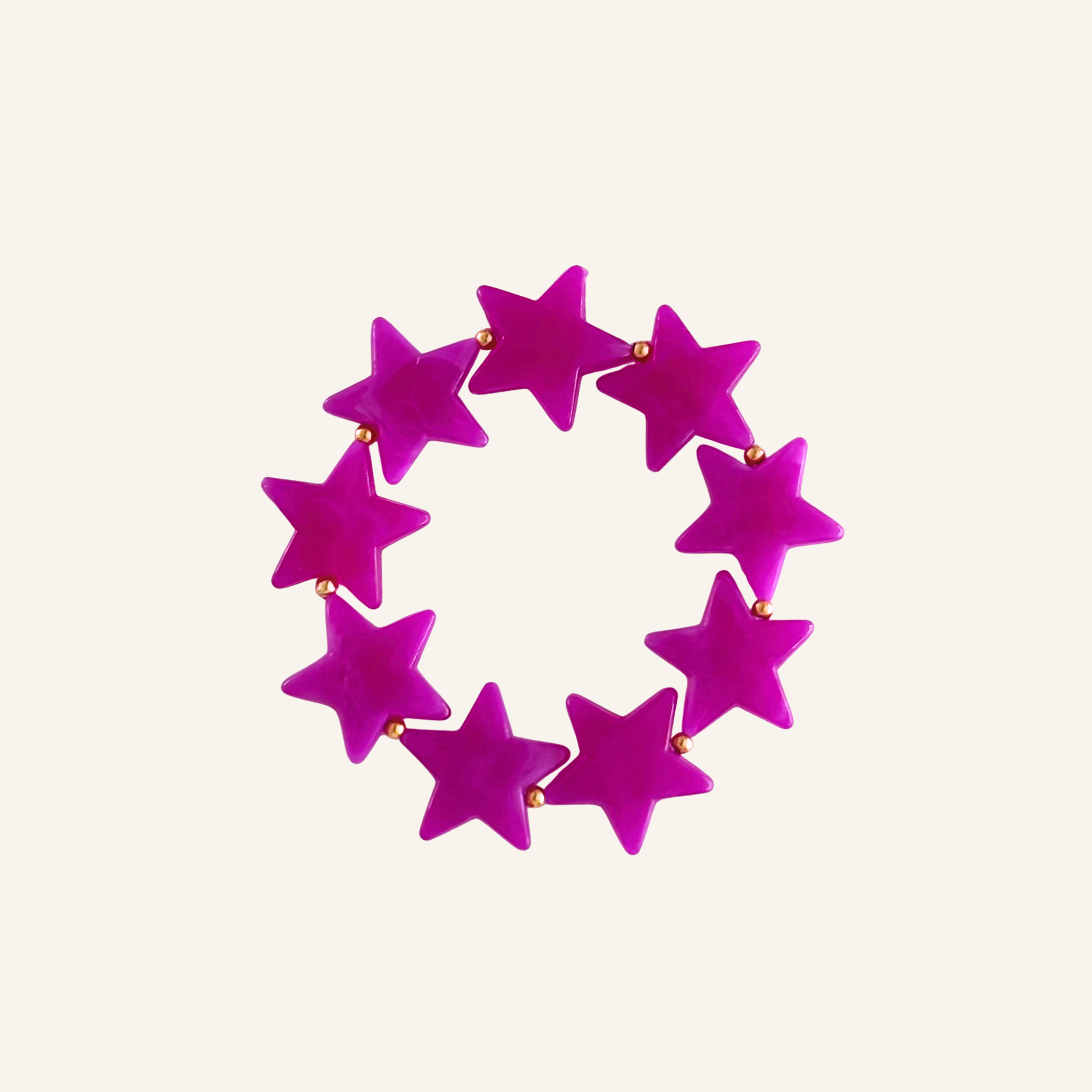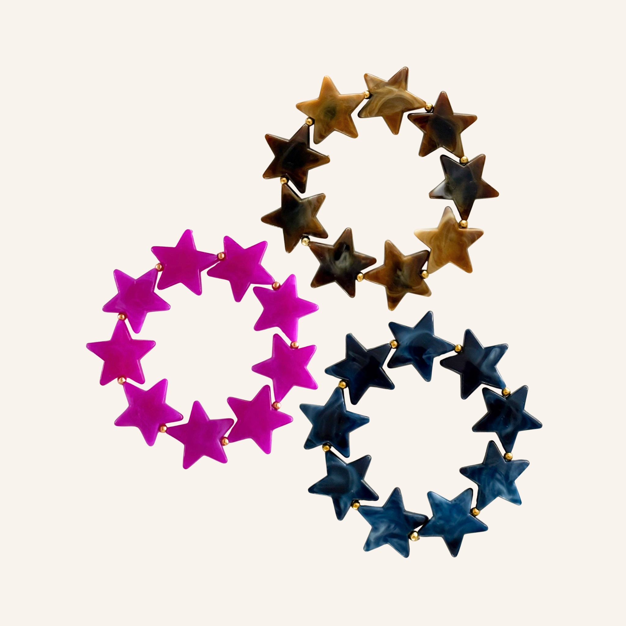 Deze opvallende armband met chunky sterrenkralen in fuchsia/paars, donkerblauw of bruin is helemaal on-trend. De gouden of zilveren details van roestvrij staal geven hem een luxe touch. Draag hem solo voor een subtiel statement of combineer met de Supernova Necklace voor een bold, kleurrijke party look!