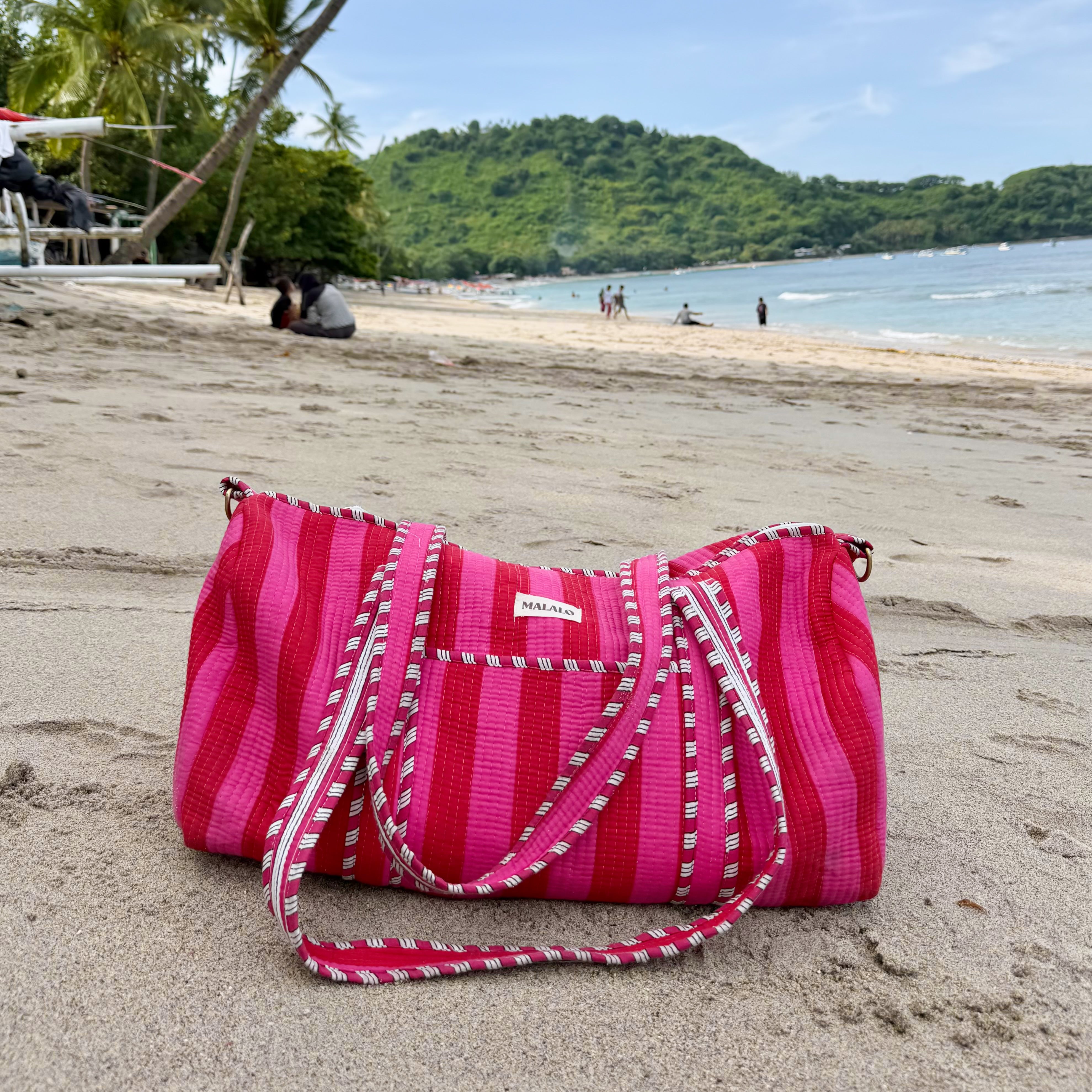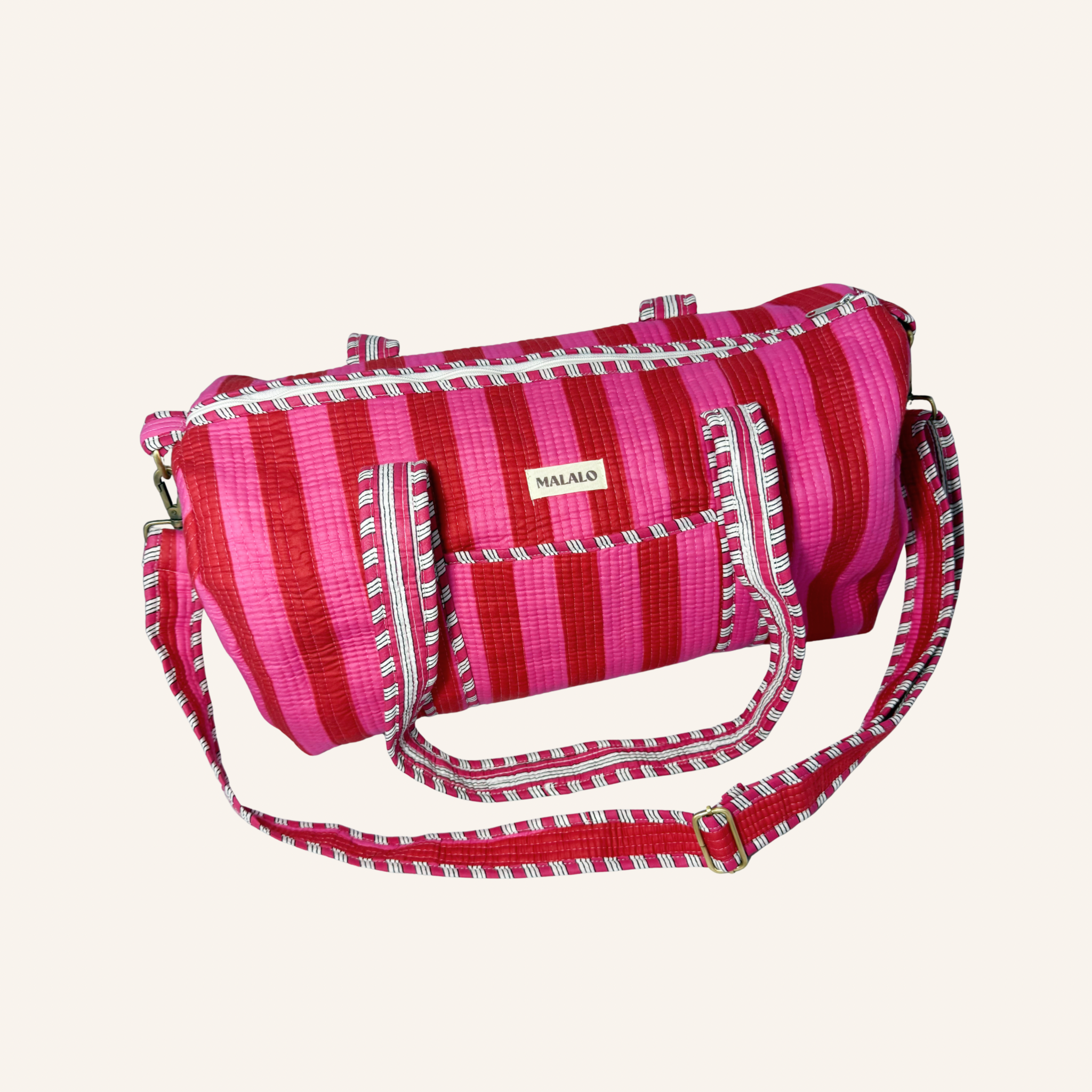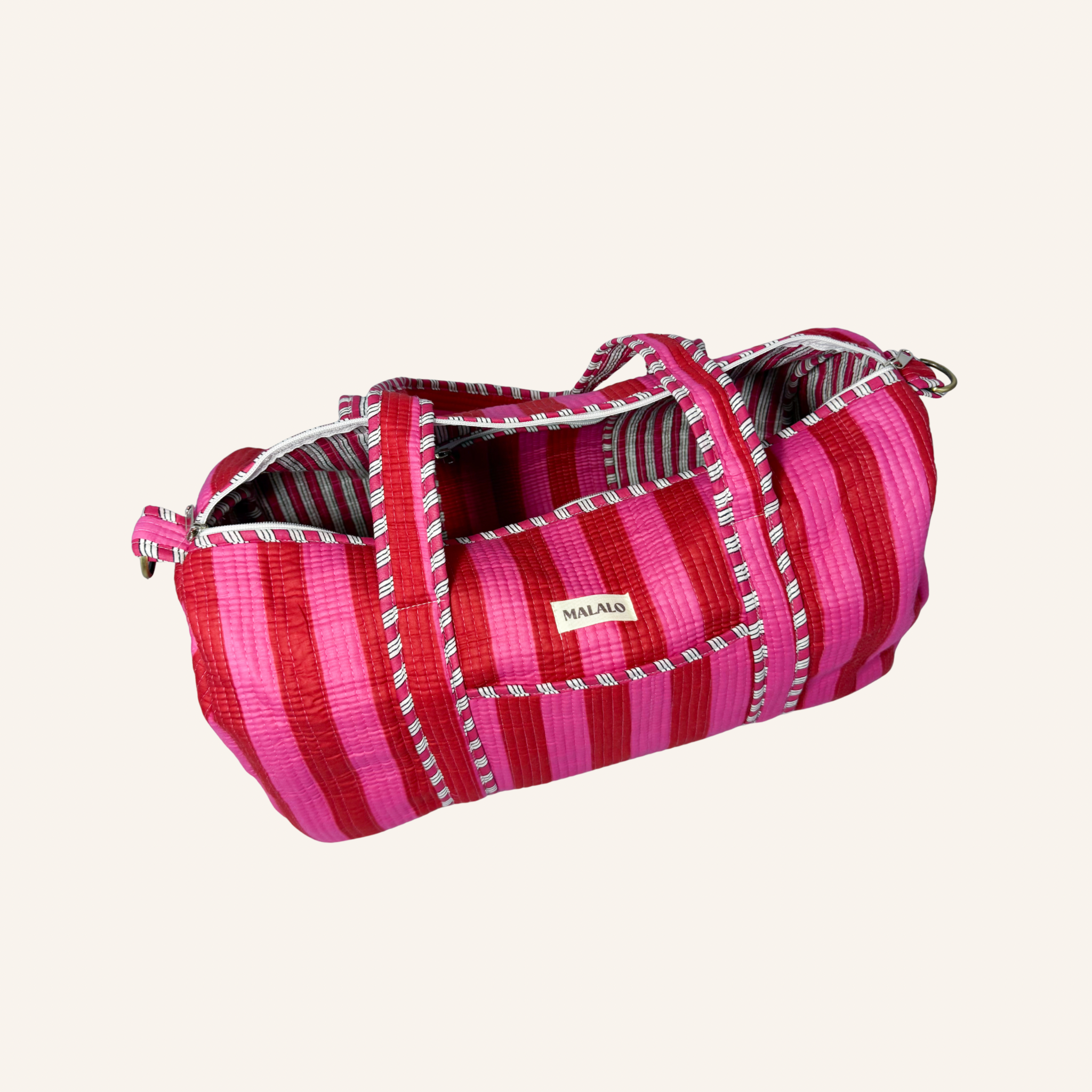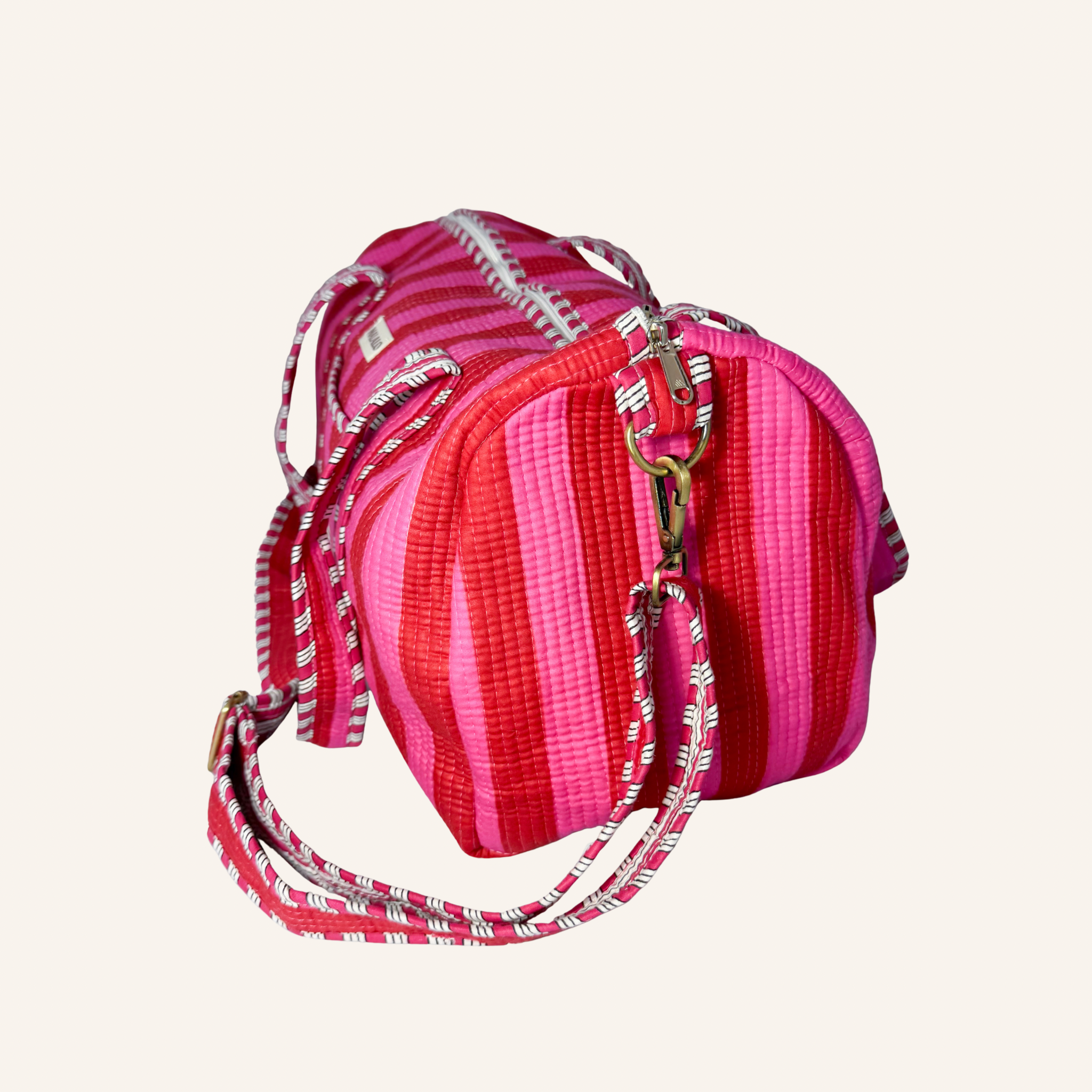 Beschikbaarheid vernieuwenEen kleurrijke weekendtas of sporttas met rood en roze strepen die stijl en functionaliteit combineert! De dikke rood en roze verticale strepen maken deze tas opvallend en trendy, zonder in te leveren op gemak. Dankzij de ritssluiting blijven je spullen veilig opgeborgen. Draag ‘m in de hand, op je schouder of crossbody met het verstelbaar hengsel. Het kleine binnenvakje helpt je georganiseerd te blijven, terwijl het extra vak aan de buitenkant zorgt voor snelle toegang tot je must-haves.