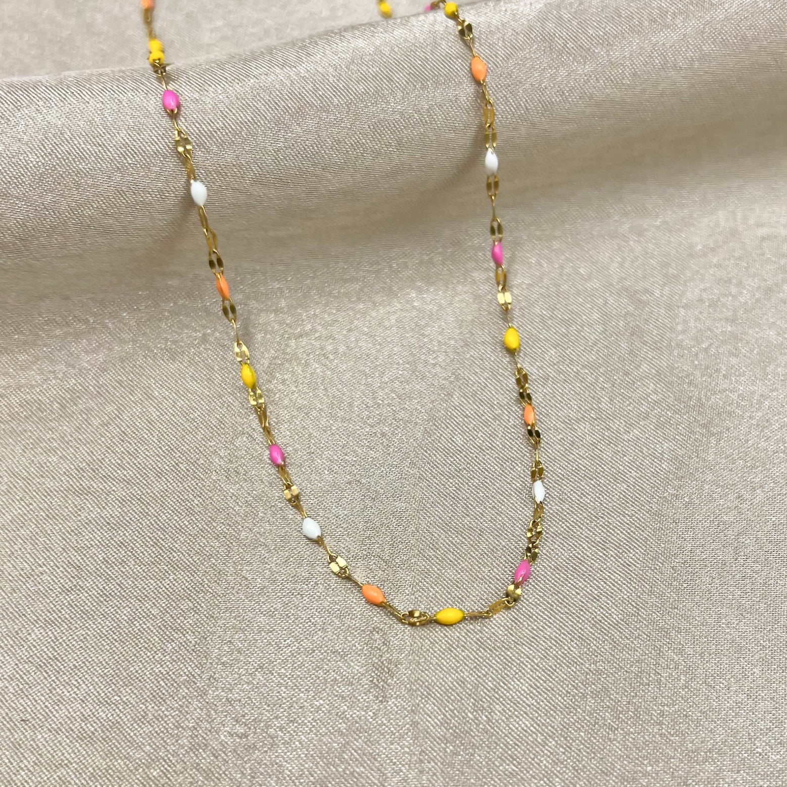 Deze gouden Citrus Splash Necklace combineert minimalisme met een vrolijke twist dankzij de kleurrijke bolletjes in geel, wit en oranje. Verstelbaar en gemaakt van stainless steel, is deze ketting perfect voor wie een subtiele zomerse uitstraling wil creëren, ook in de andere seizoenen. Mix & match ‘m met onze bedels voor een eigen, unieke look. Fris, trendy en vol kleur—een kleine splash die je outfit laat stralen.