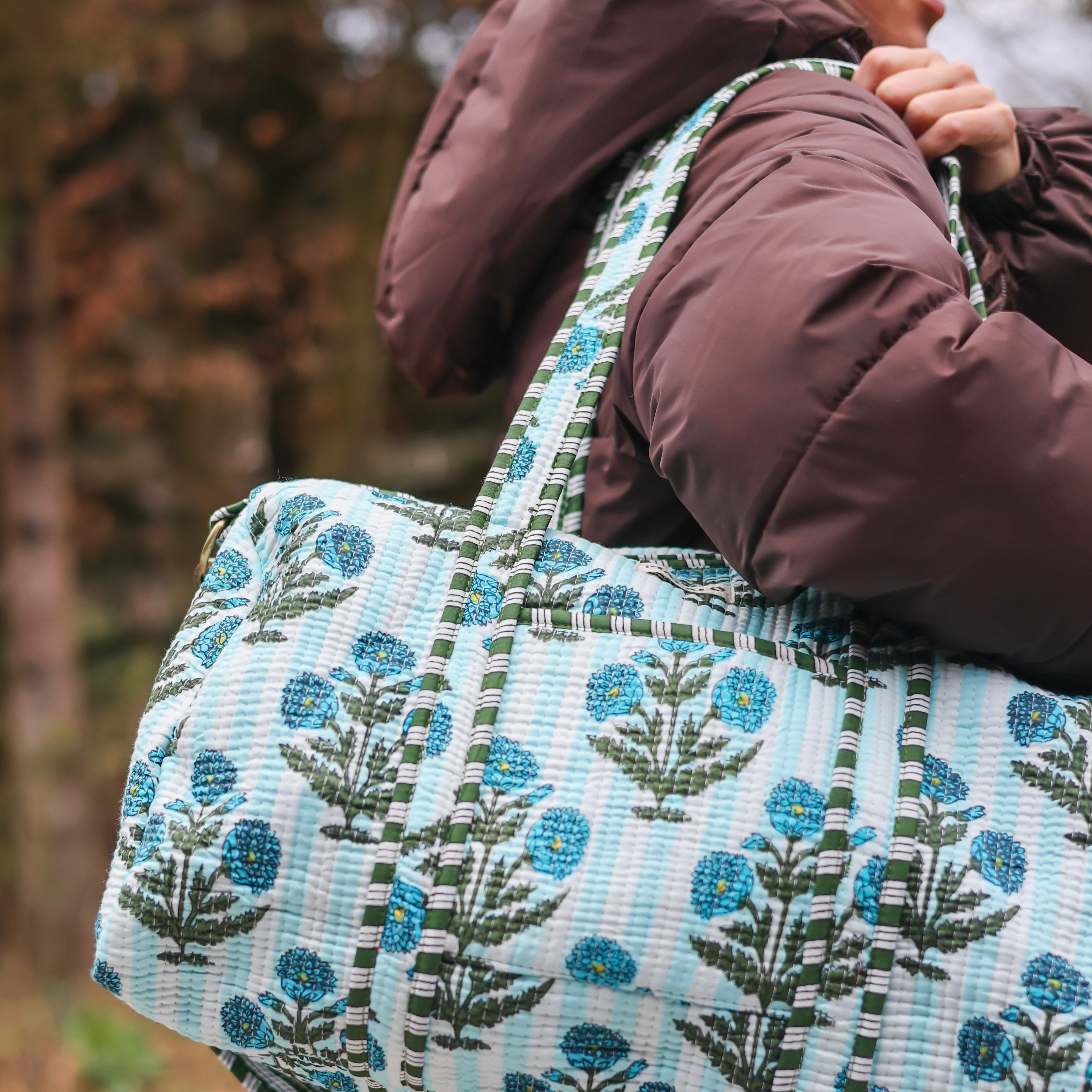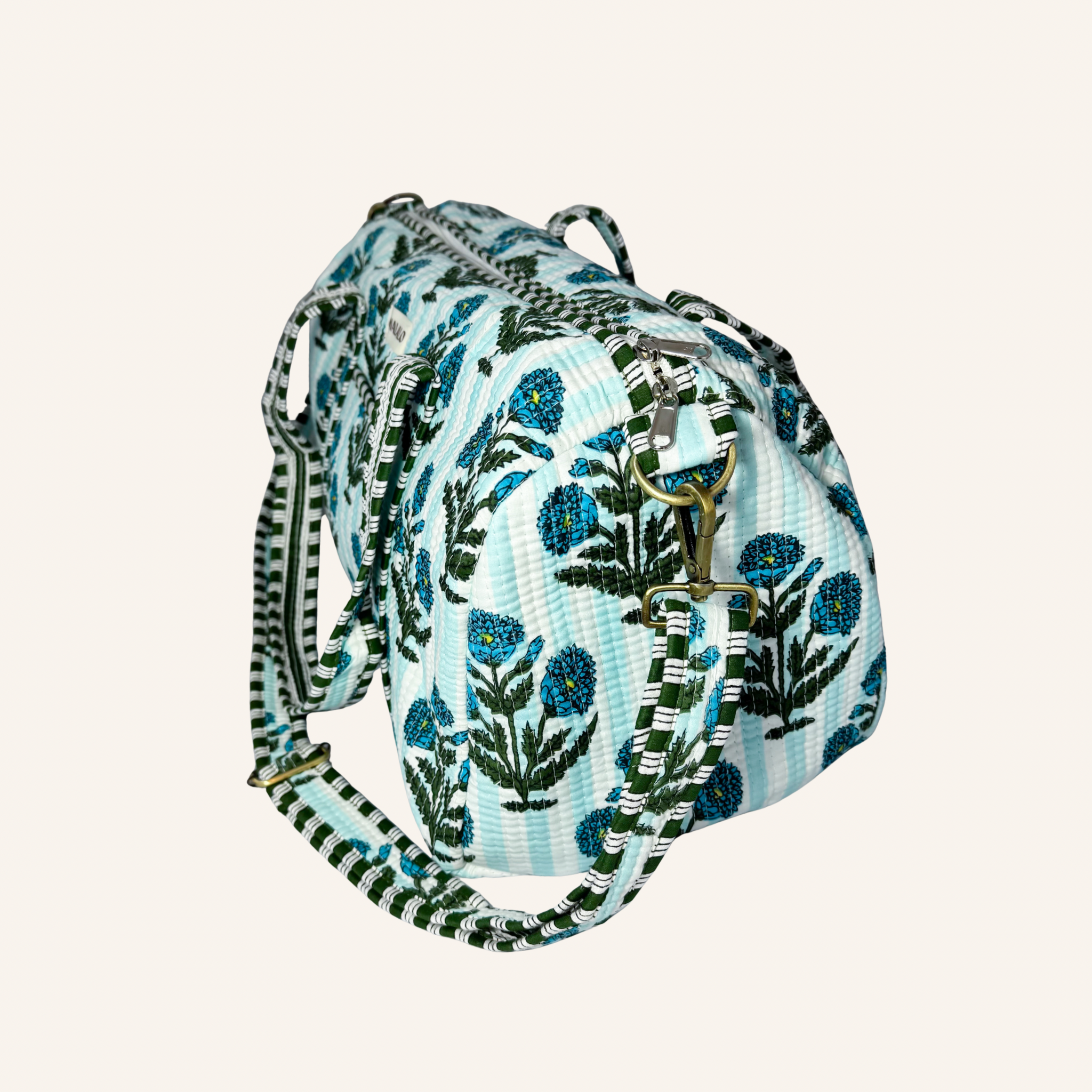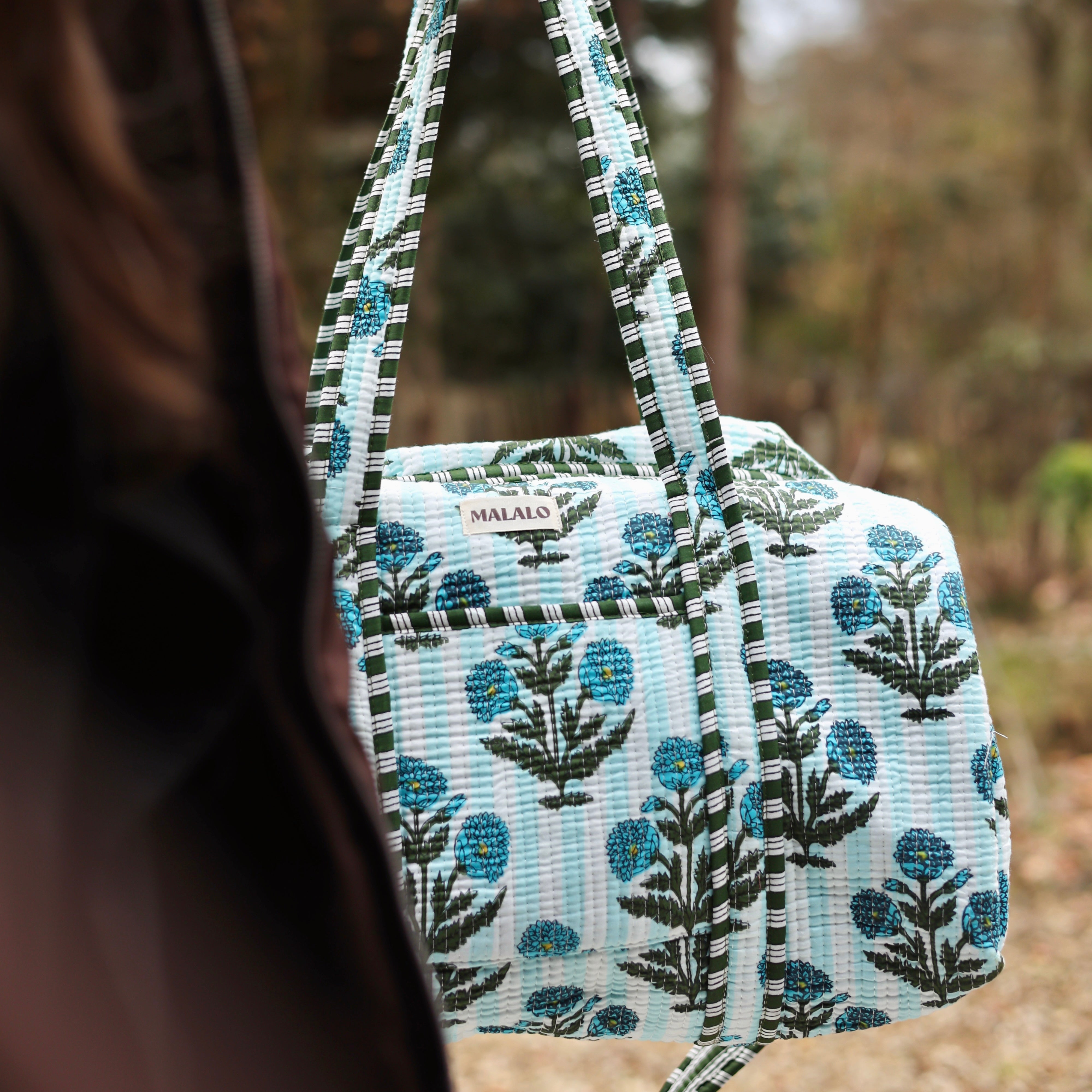 Beschikbaarheid vernieuwenDeze schattige bloemen sporttas met lichtblauwe en witte strepen is een trendy weekendtas met een frisse, natuurlijke vibe. De blauwe bloemen met groene blaadjes maken de tas een subtiele eye-catcher zonder te druk te ogen. De ritssluiting houdt alles netjes bij elkaar en met het verstelbaar hengsel draag je de tas precies zoals jij wilt. Het kleine binnenvakje maakt deze duffle bag ideaal voor een citytrip, sportmoment of weekend weg.