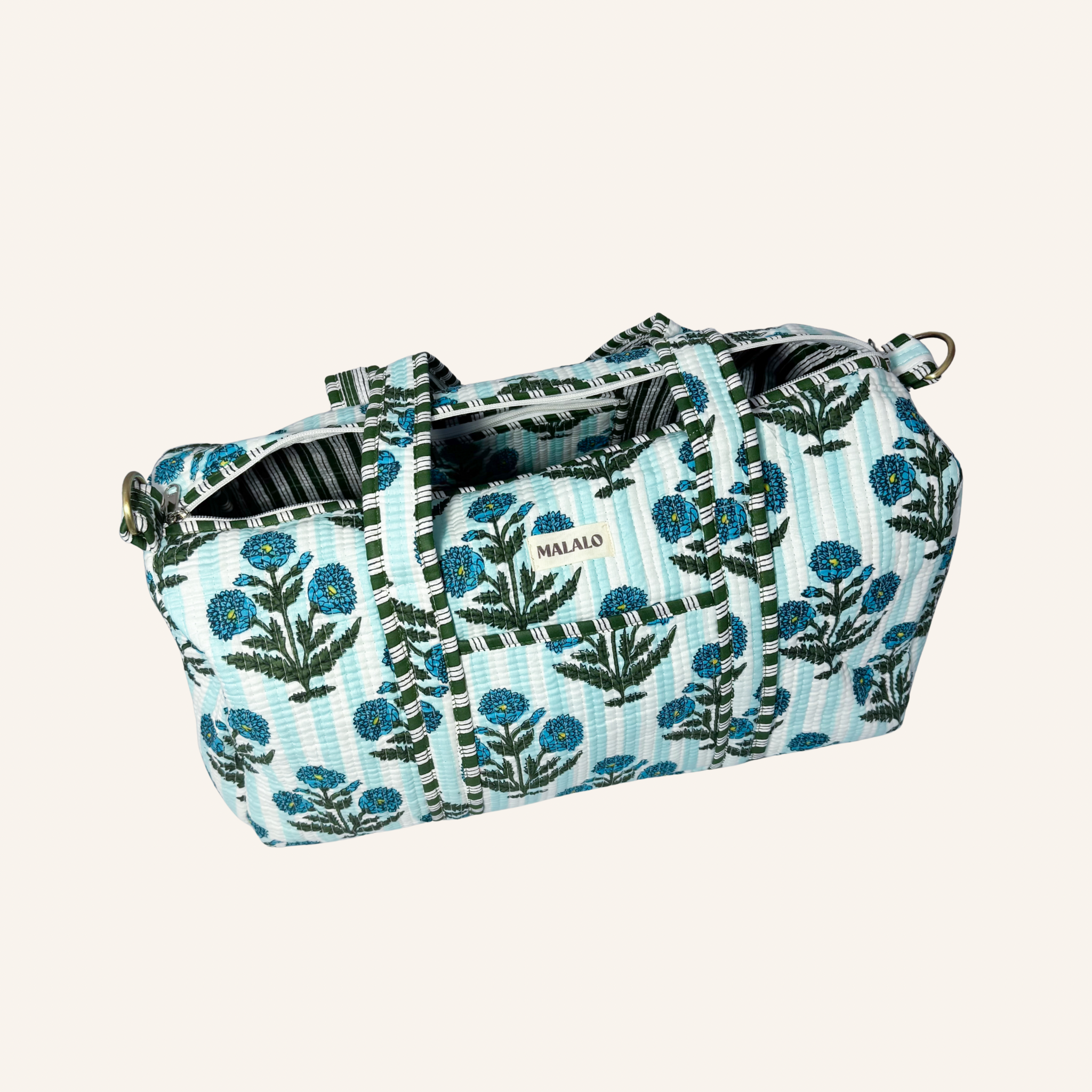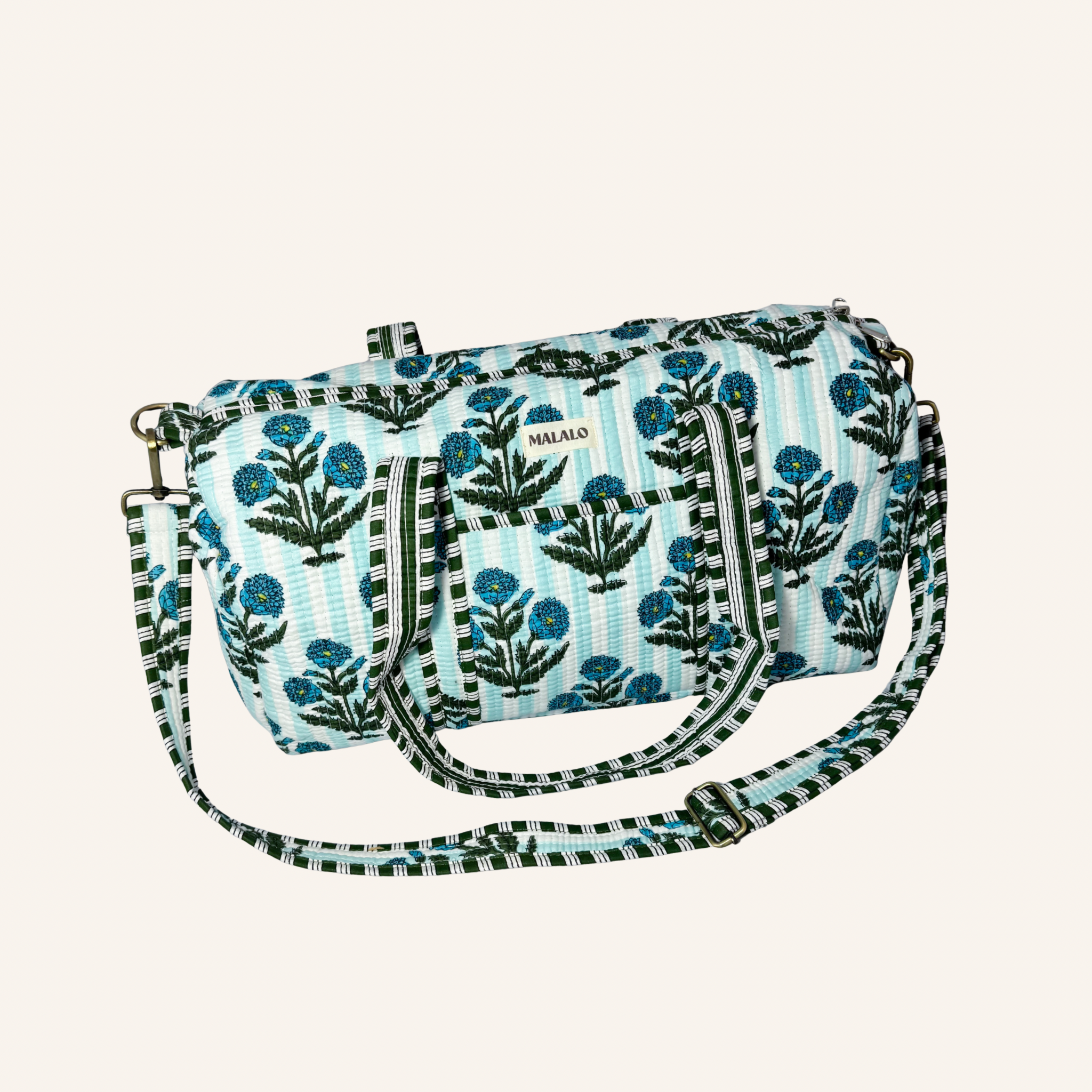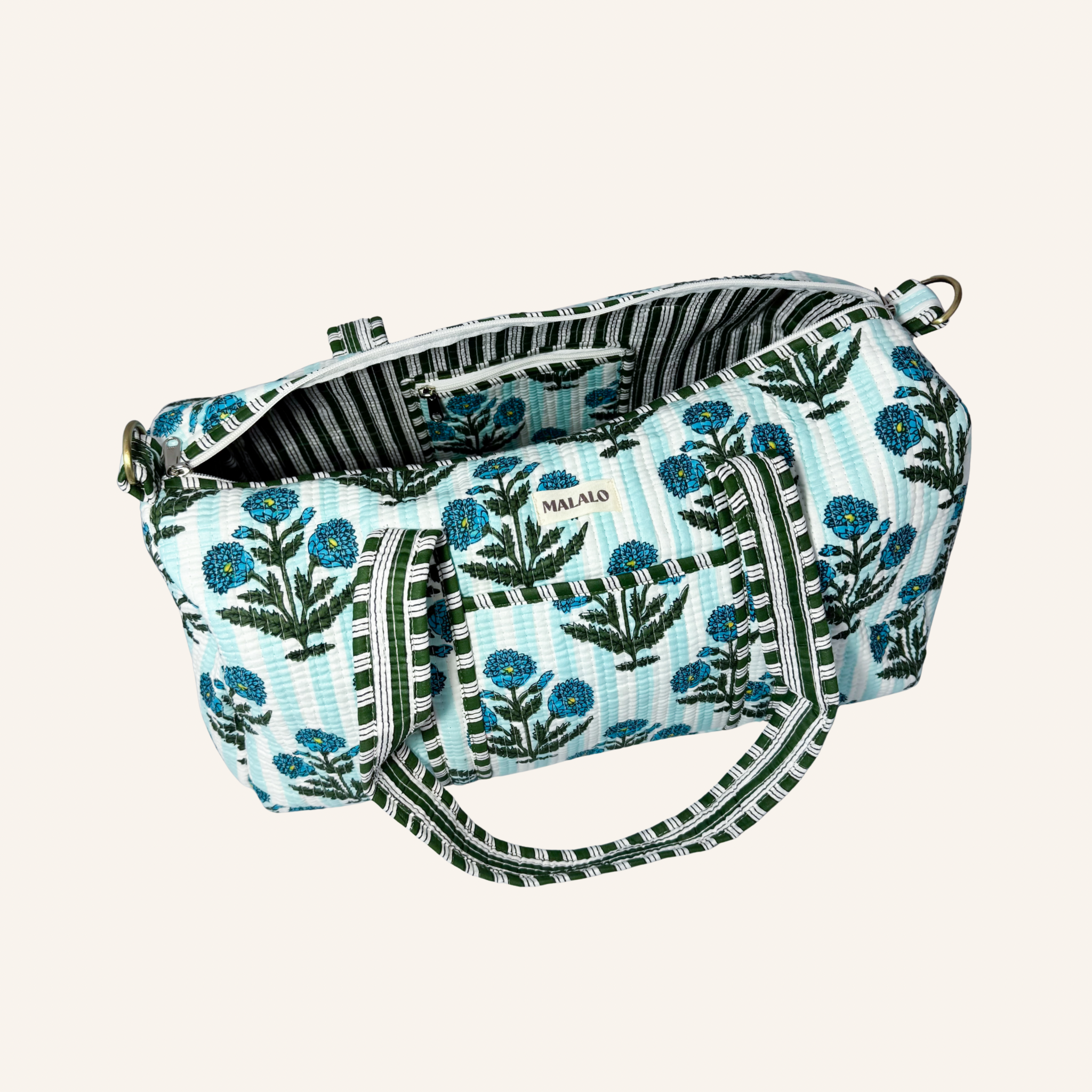 Beschikbaarheid vernieuwenDeze schattige bloemen sporttas met lichtblauwe en witte strepen is een trendy weekendtas met een frisse, natuurlijke vibe. De blauwe bloemen met groene blaadjes maken de tas een subtiele eye-catcher zonder te druk te ogen. De ritssluiting houdt alles netjes bij elkaar en met het verstelbaar hengsel draag je de tas precies zoals jij wilt. Het kleine binnenvakje maakt deze duffle bag ideaal voor een citytrip, sportmoment of weekend weg.