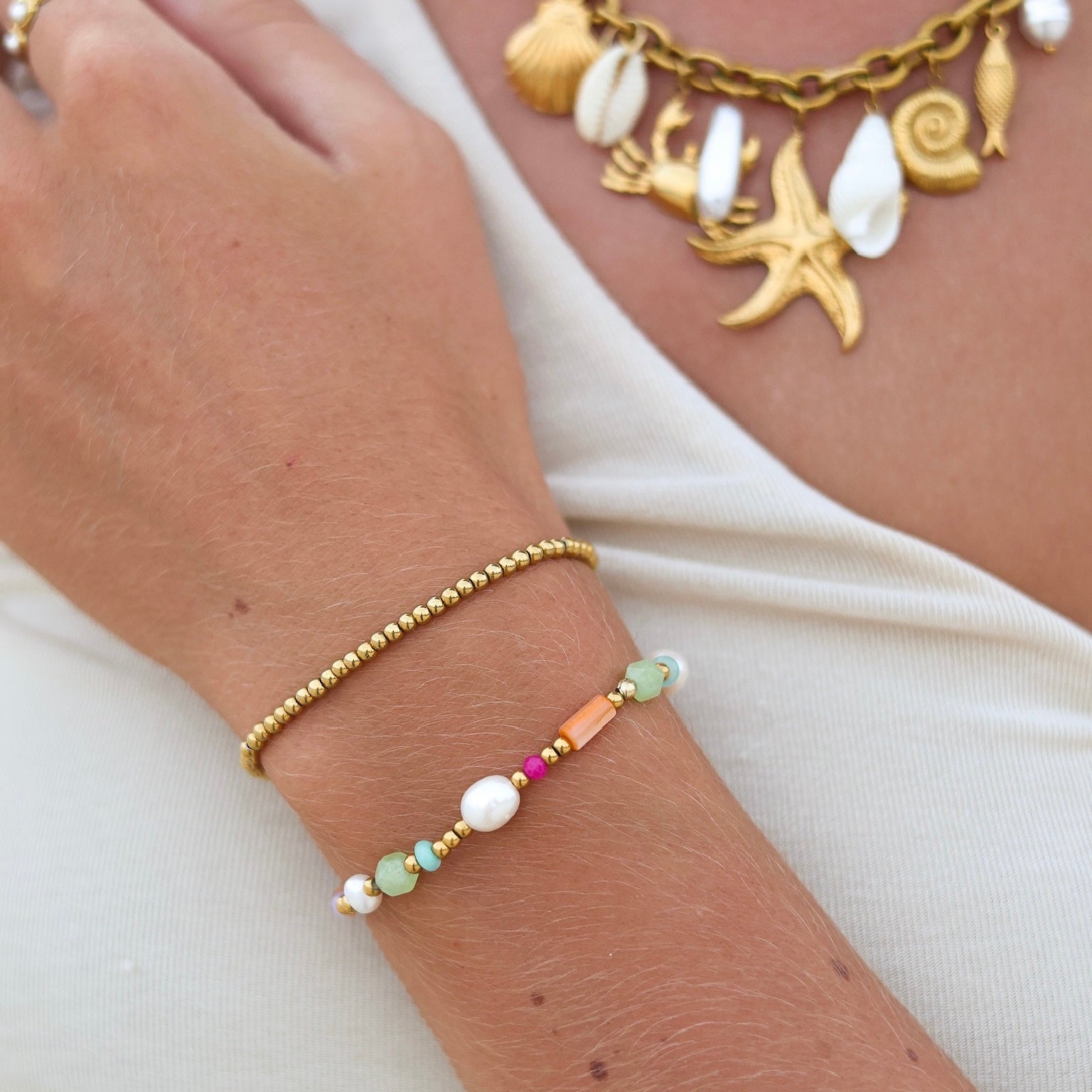 Beschikbaarheid vernieuwenDe Coral Confetti Bracelet is als een feestje om je pols! Een vrolijke mix van gekleurde kraaltjes in lila, groen, blauw, oranje en roze. Gecombineerd met bubble kralen van roestvrij staal in goud of zilver. De elastische pasvorm maakt ’m super comfy en perfect voor elke dag. Elke kraal is net even anders, wat deze armband extra uniek maakt. Perfect om te layeren of solo te dragen. Cute, kleurrijk en ready to shine!