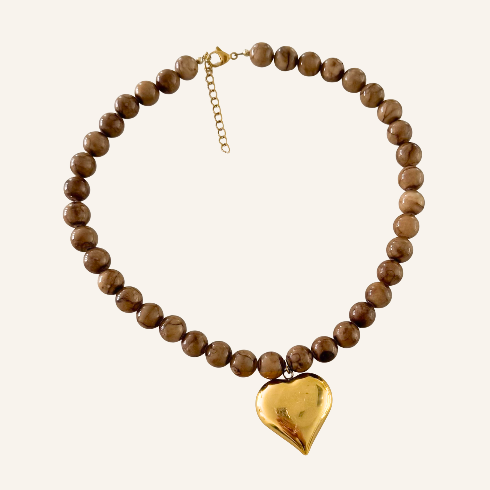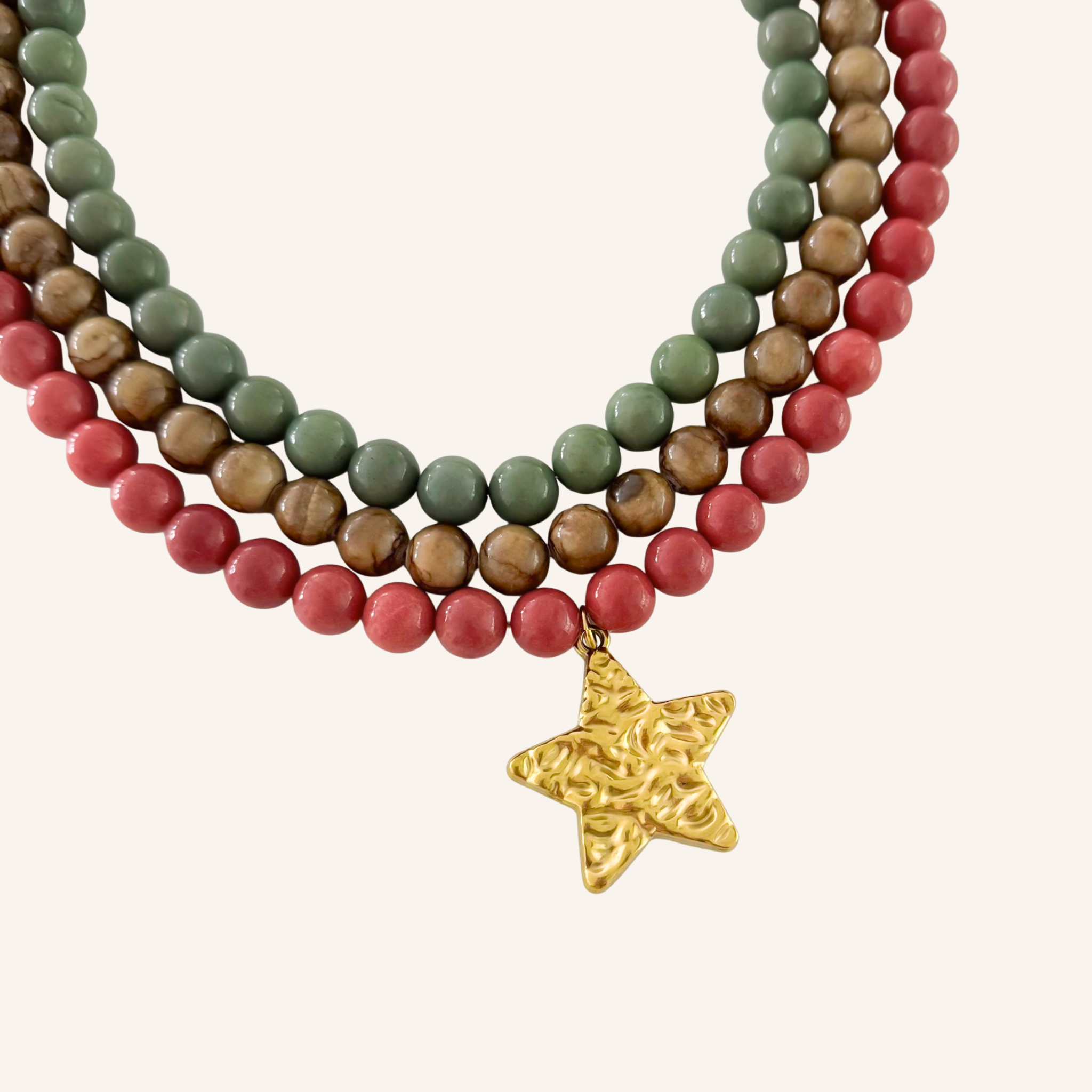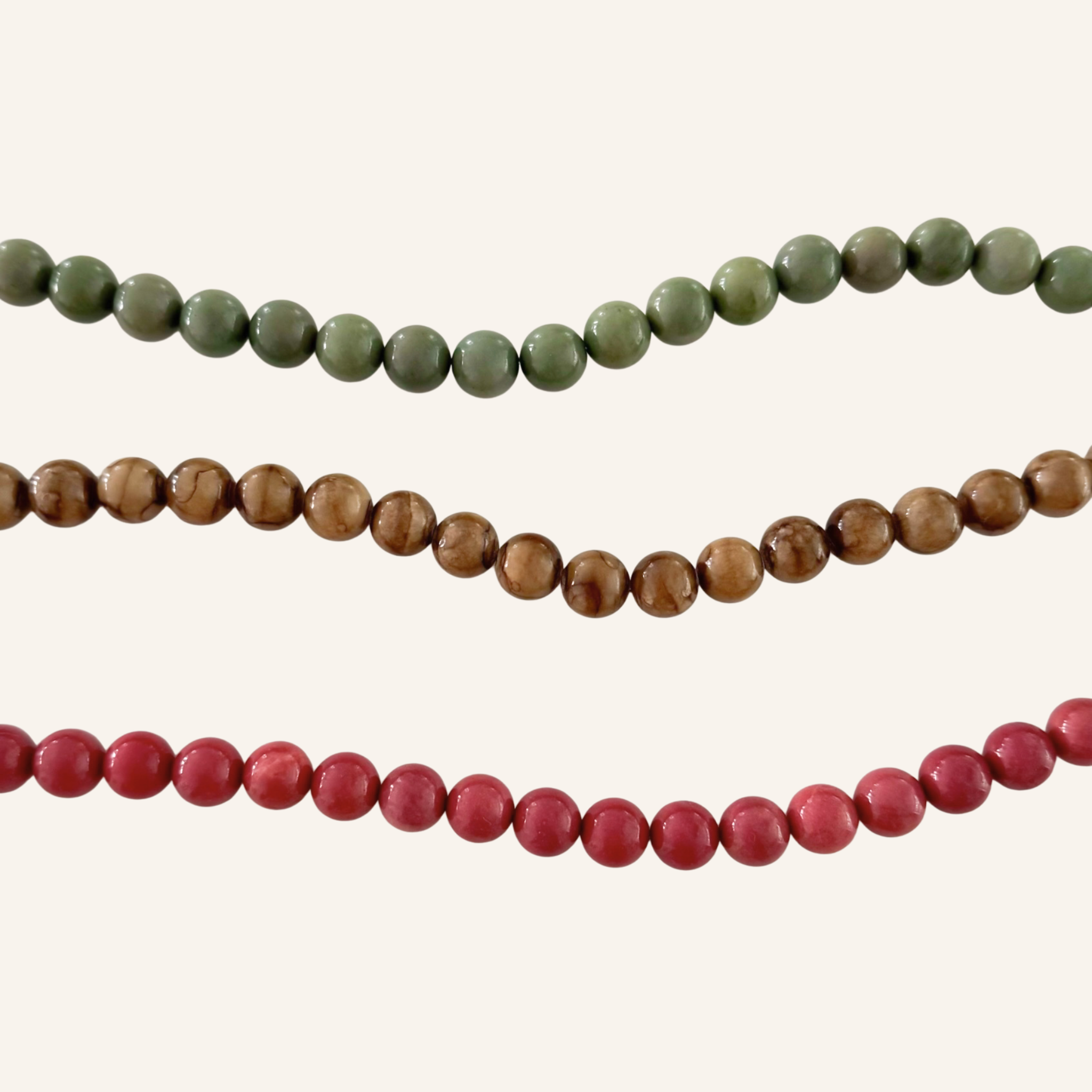 De Cozy Beads Necklace combineert warmte met een vleugje elegantie. De grote ronde natuurstenen kralen in diepe tinten groen, bruin en rood geven een rijke, chique uitstraling. De ketting is afgewerkt met roestvrijstalen details en verkrijgbaar in goud en zilver. Draag haar solo voor een stijlvolle statement look of voeg een bedel toe voor een persoonlijke touch.