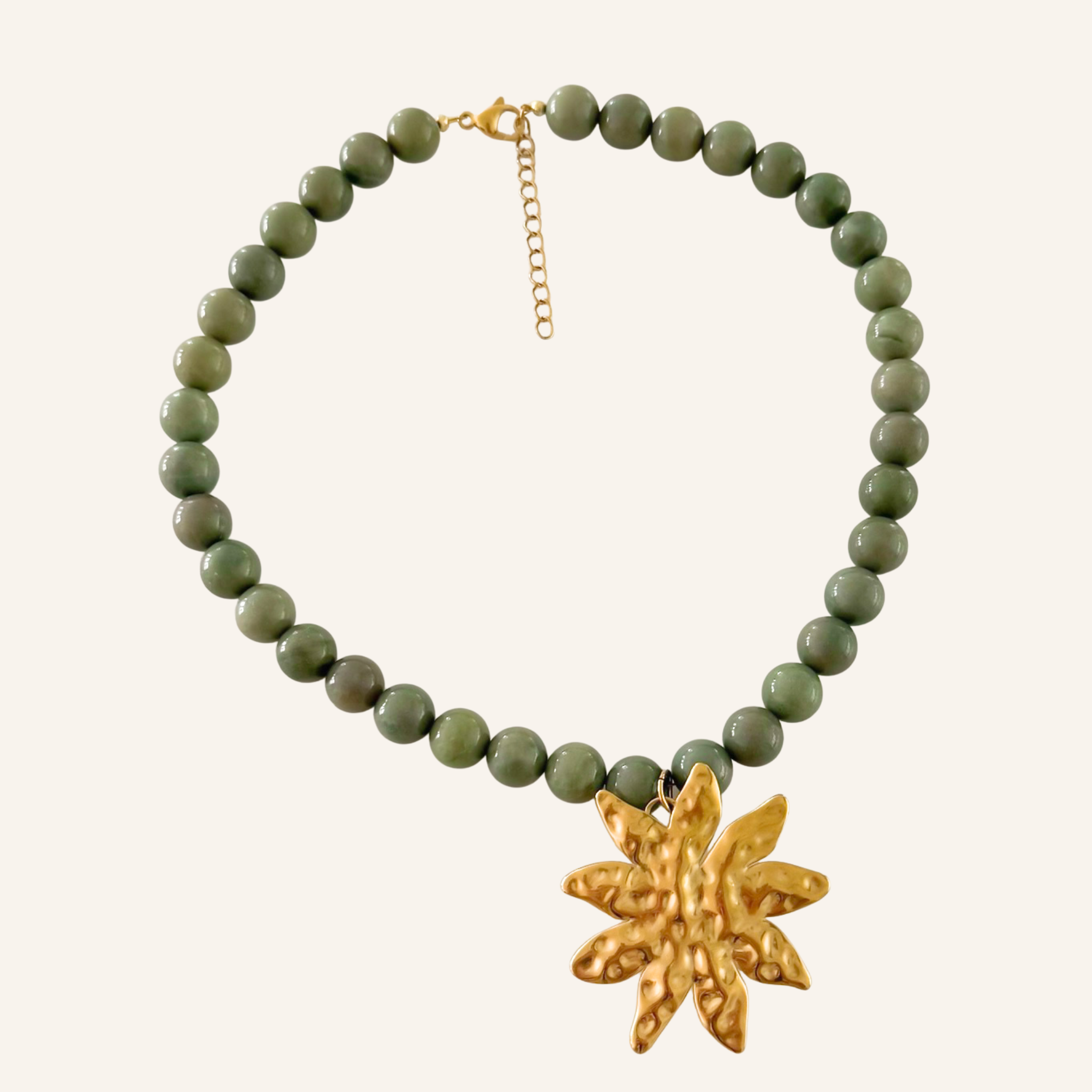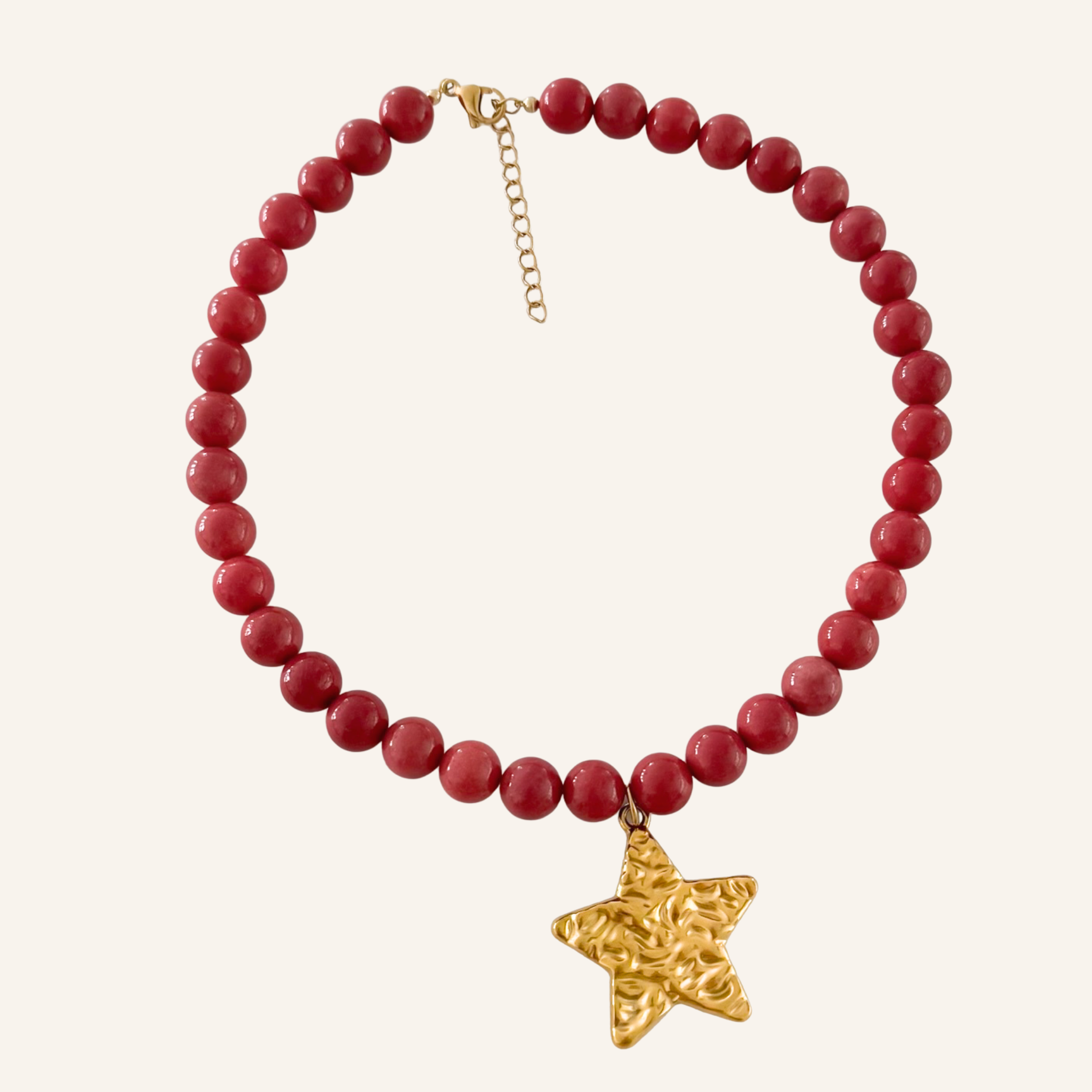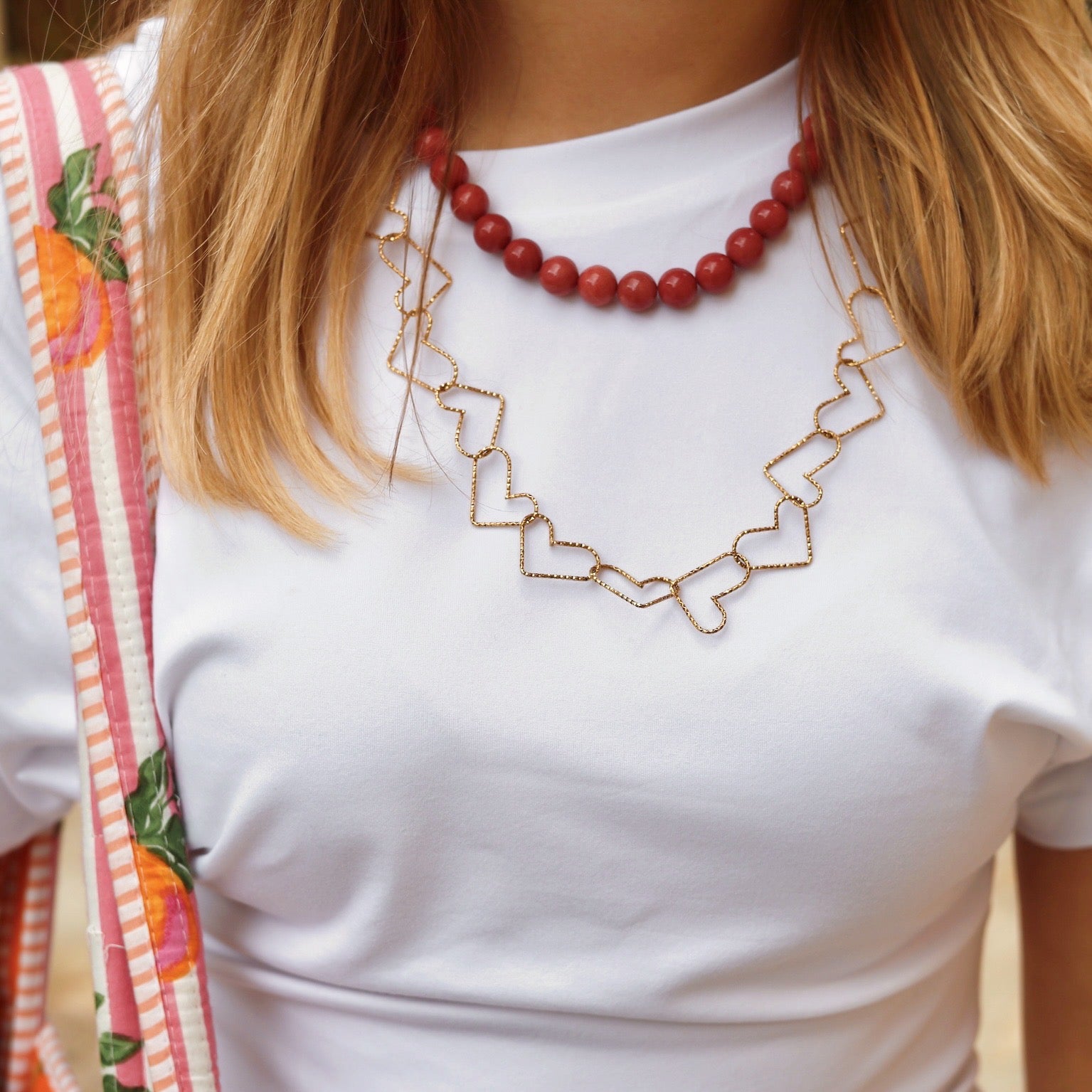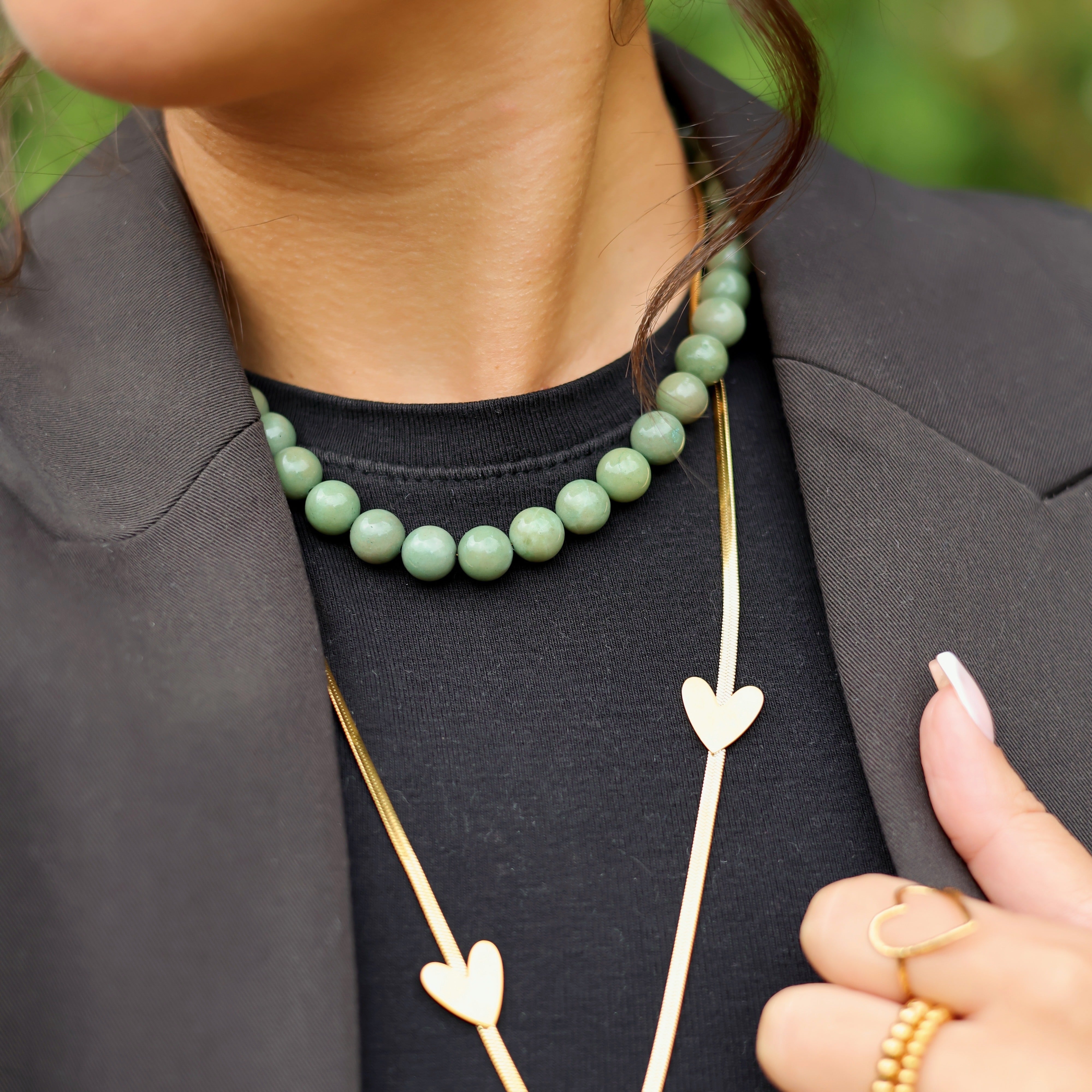 De Cozy Beads Necklace combineert warmte met een vleugje elegantie. De grote ronde natuurstenen kralen in diepe tinten groen, bruin en rood geven een rijke, chique uitstraling. De ketting is afgewerkt met roestvrijstalen details en verkrijgbaar in goud en zilver. Draag haar solo voor een stijlvolle statement look of voeg een bedel toe voor een persoonlijke touch.