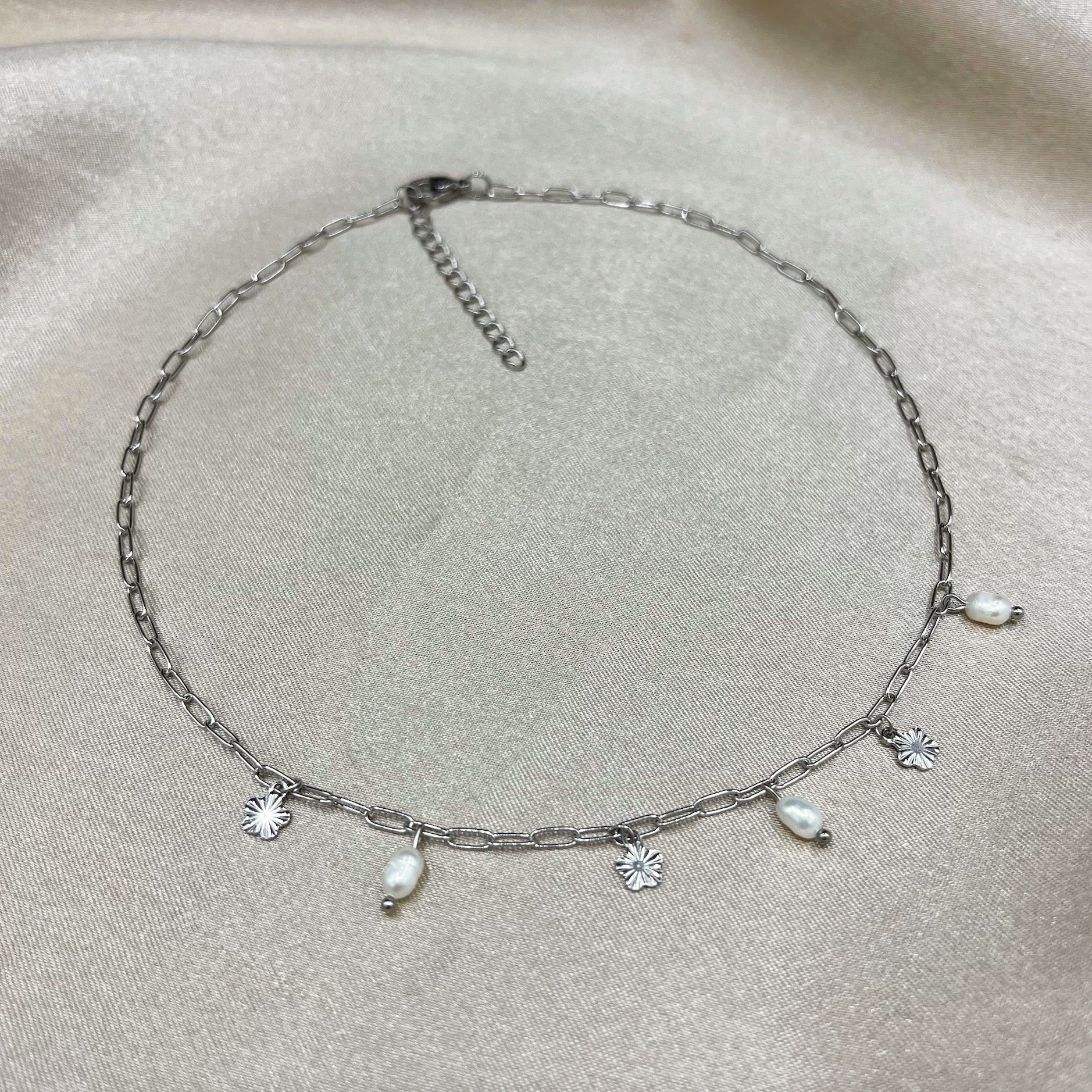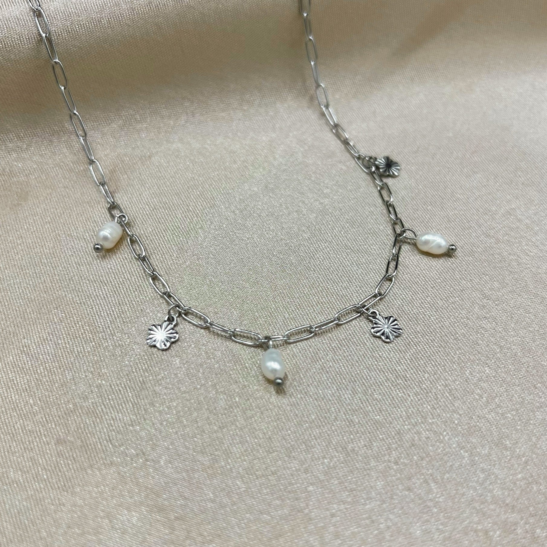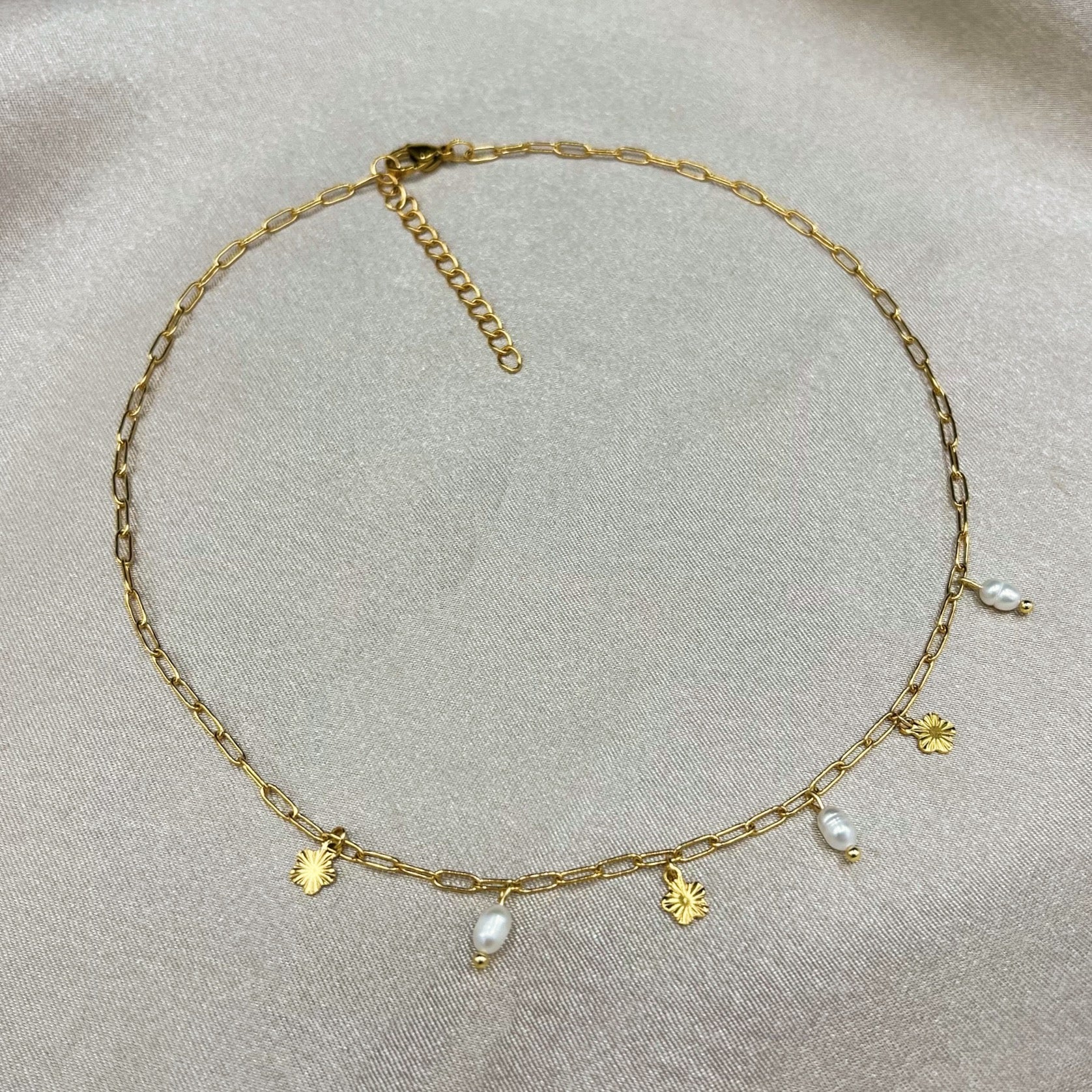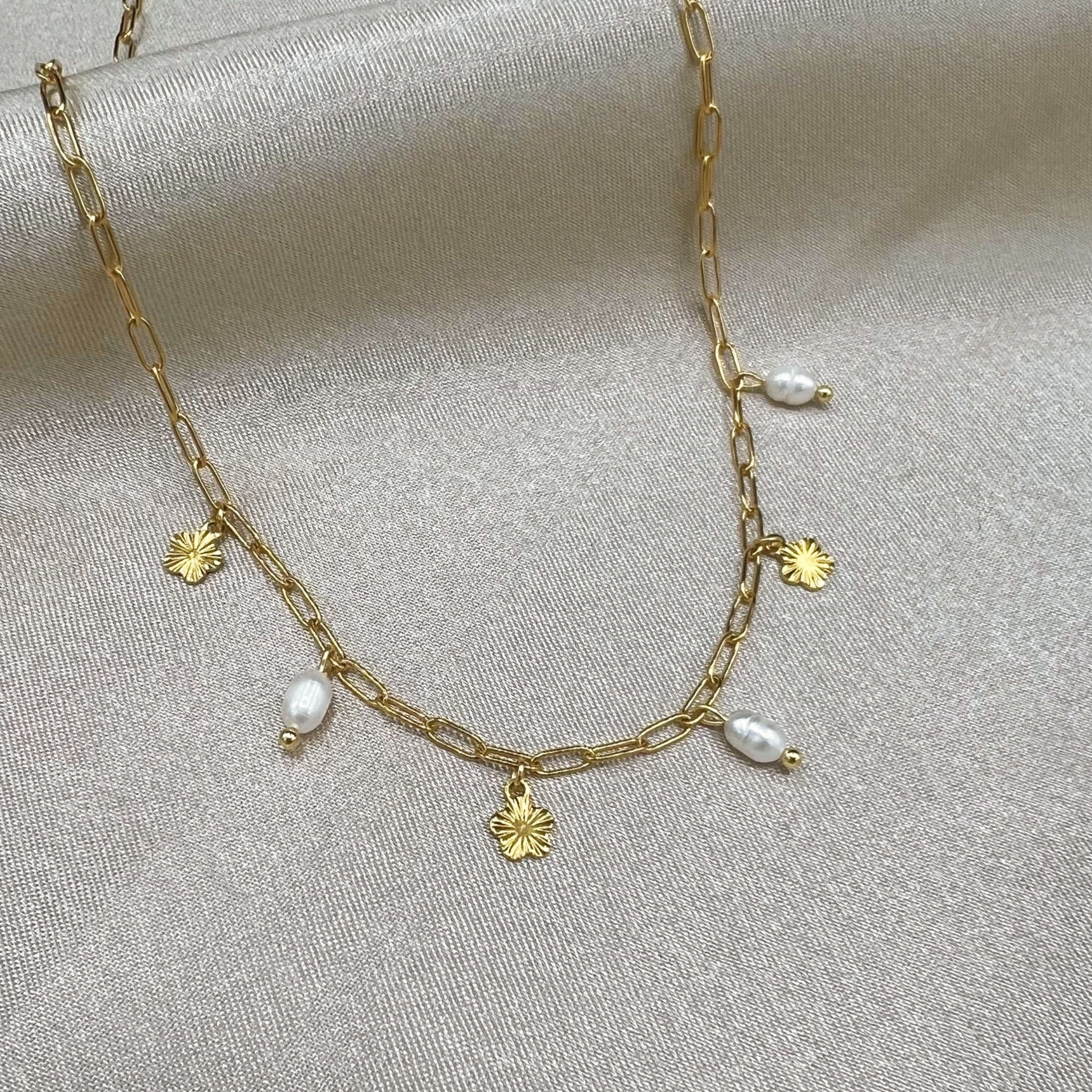 Beschikbaarheid vernieuwenEen subtiele eyecatcher voor elke dag: deze verfijnde ketting van roestvrij staal combineert zoetwaterparels met kleine bloemetjes als bedels – speels en elegant. Dankzij de verstelbare sluiting draag je ‘m precies zoals jij wilt. De Dainty Daisy Necklace is verkrijgbaar in zowel goud als zilver en past moeiteloos bij elke look. Mooi solo, maar ook perfect om te combineren met andere sieraden. Een musthave voor wie houdt van zachte details met een vrouwelijke touch.