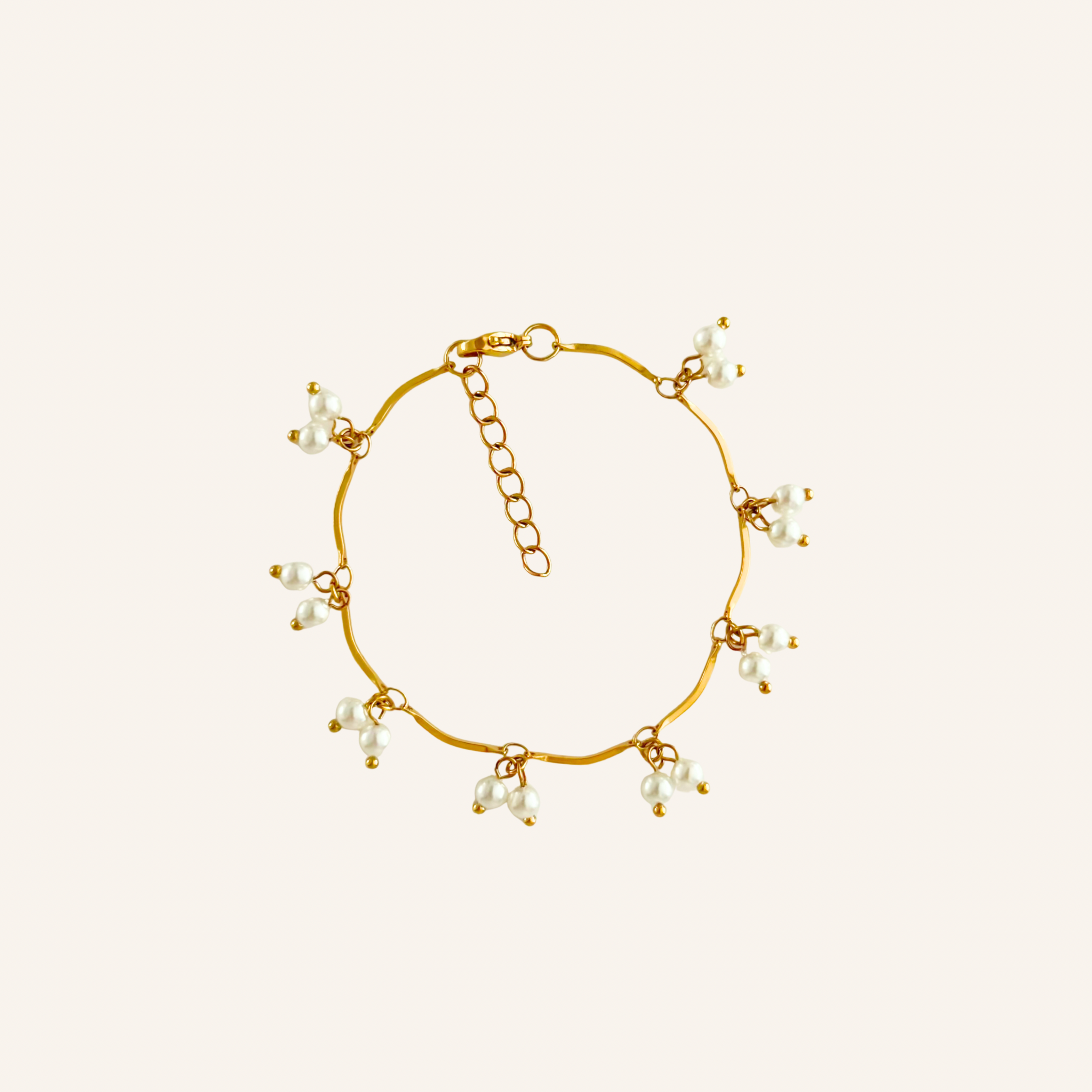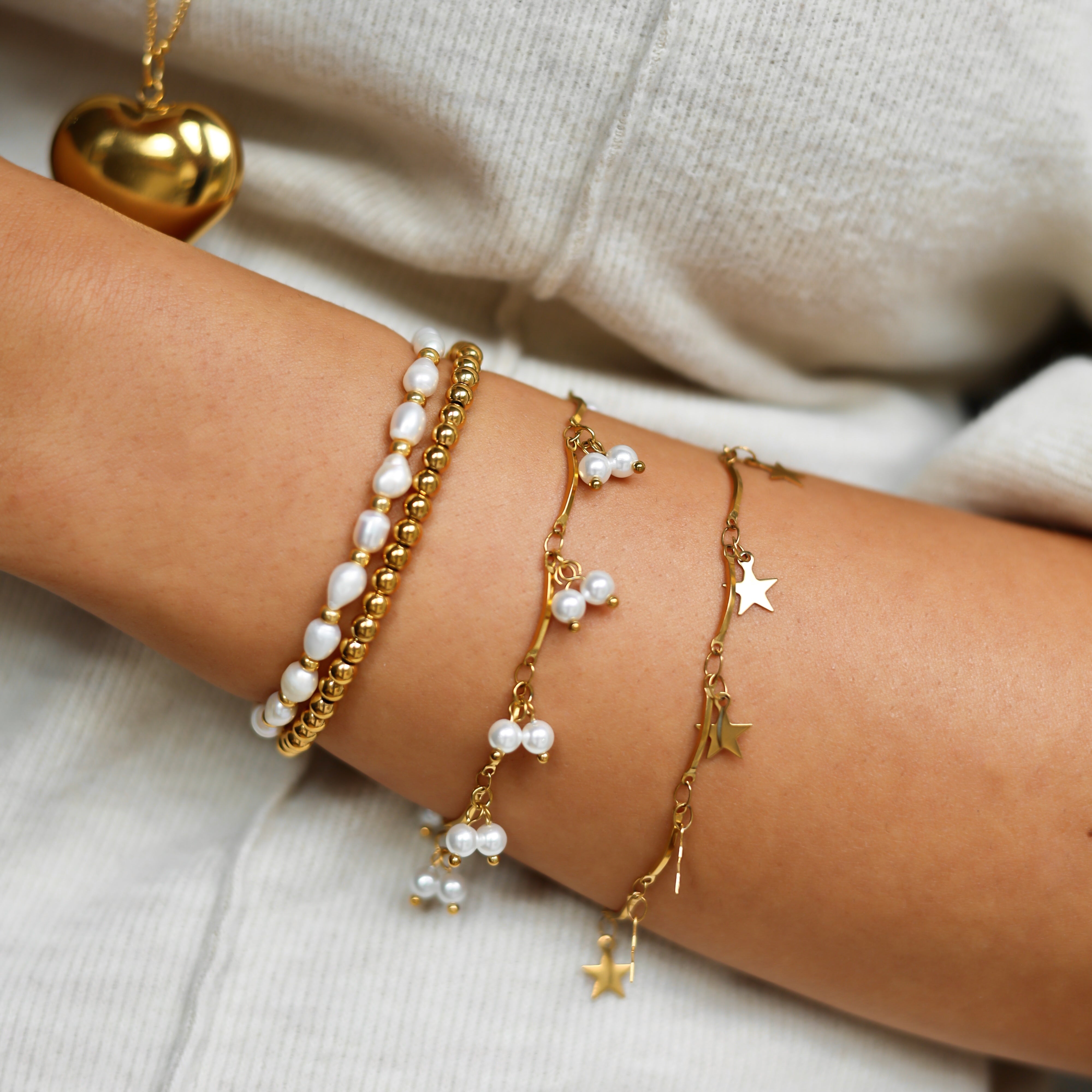 Een gouden armband met kleine pareltjes die bij elke beweging subtiel meebewegen – speels, vrouwelijk en vol charme. De fijne schakels van roestvrij staal geven een elegante basis, terwijl de bungelende parelbedeltjes zorgen voor een vrolijke, chique uitstraling. Perfect om je outfit nét dat beetje extra te geven! Combineer met andere armbanden voor een trendy mix of draag hem solo voor een delicate, glanzende touch.