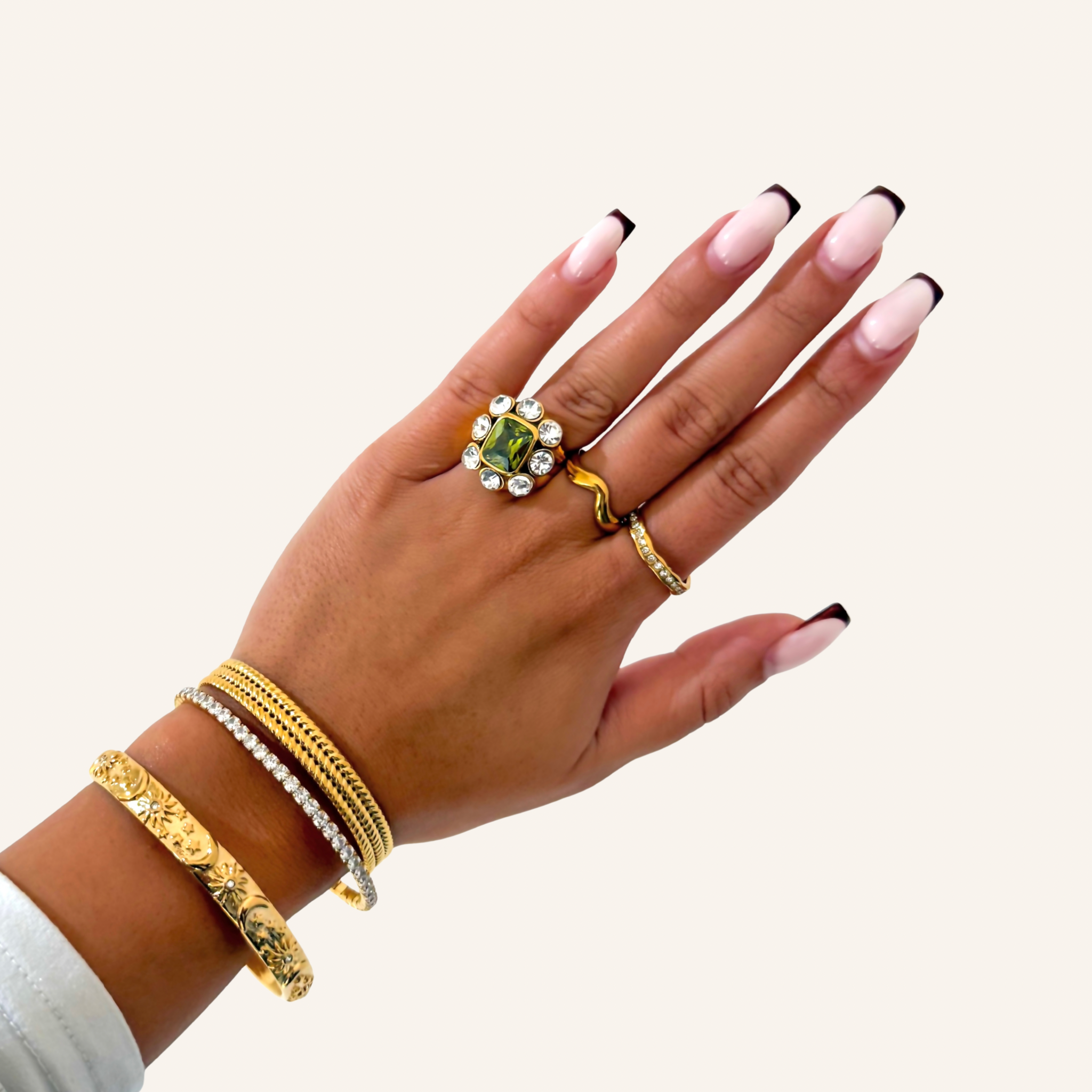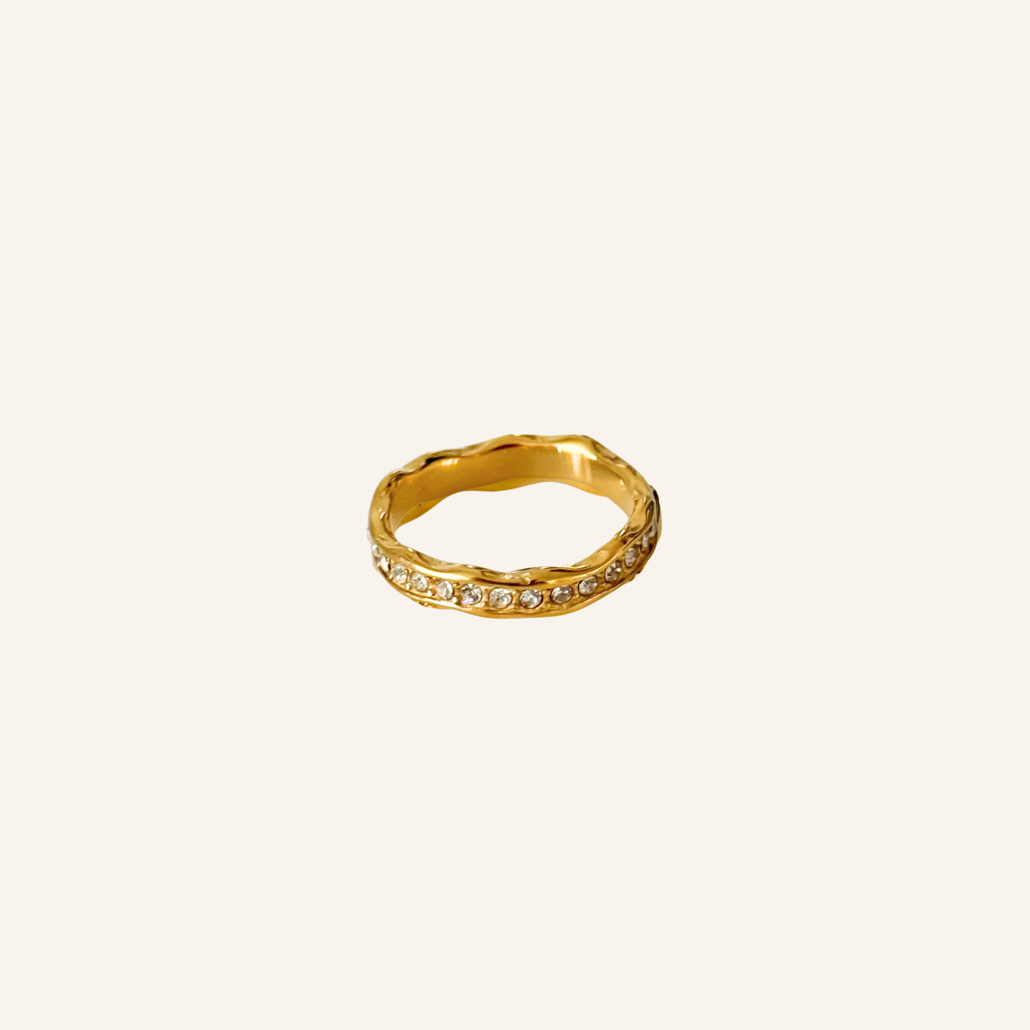 Deze gouden ring van roestvrij staal combineert minimalistische klasse met een subtiele sparkle. Met fonkelende diamantjes die samen één schitterend geheel vormen, is dit ontwerp een elegante blikvanger voor elke dag. Het verfijnde patroon en de gestructureerde afwerking zorgen voor net dat beetje extra, zonder te overdrijven. Draag solo voor een clean look of mix met andere ringen voor een persoonlijke stijl.