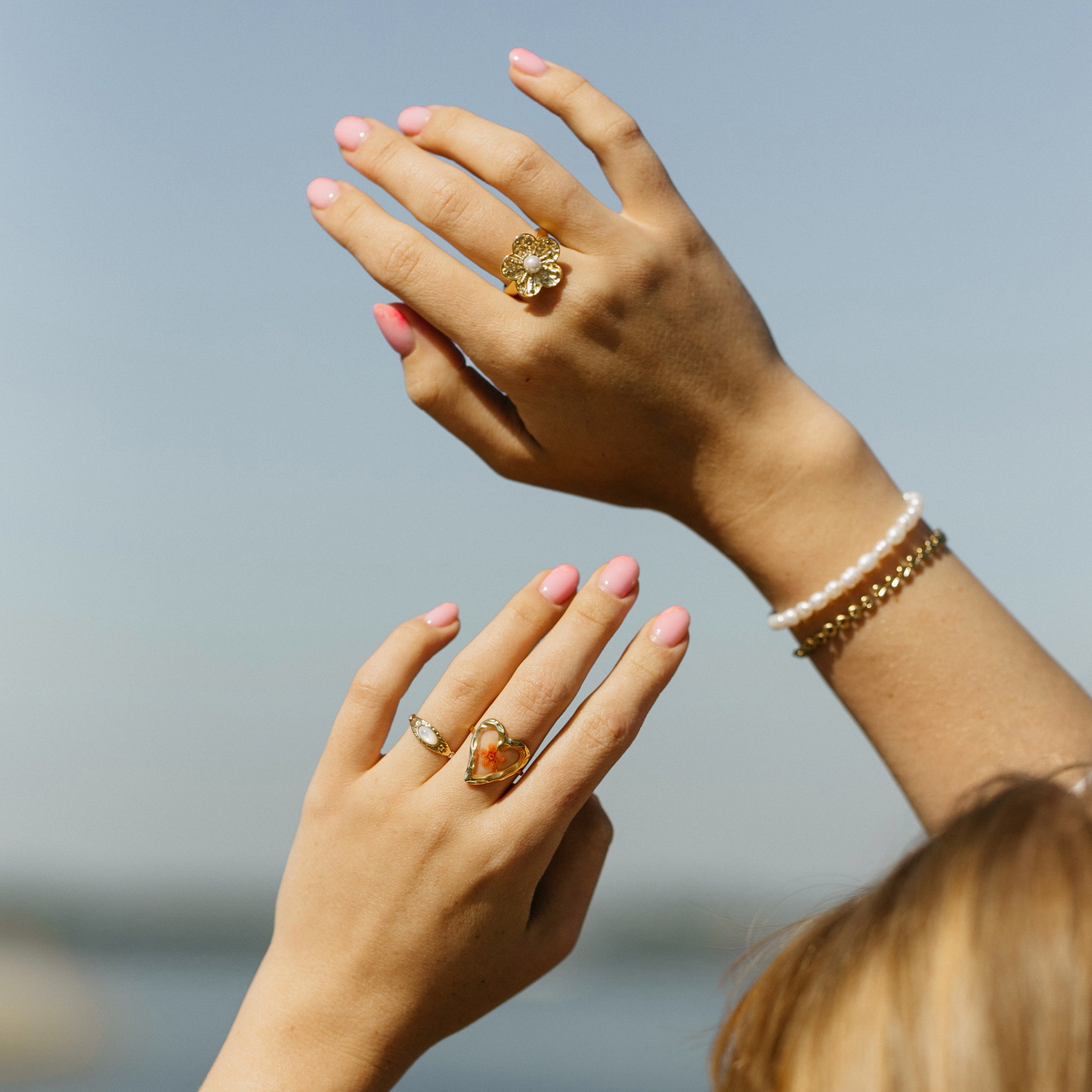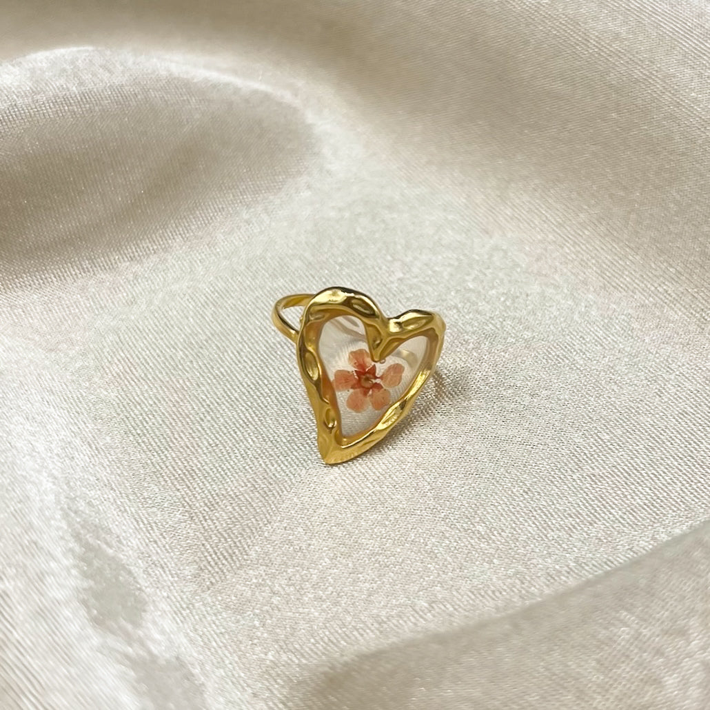 De Floral Affair Ring is een verstelbare ring van roestvrij staal in het goud. Het hartvormige design met een delicate bloem in het midden brengt een romantische, feminine vibe in elke look. Deze ring is de perfecte mix van vintage charme en moderne sparkle — ideaal om te dragen solo of te combineren met andere gouden sieraden voor een dreamy, floral statement.