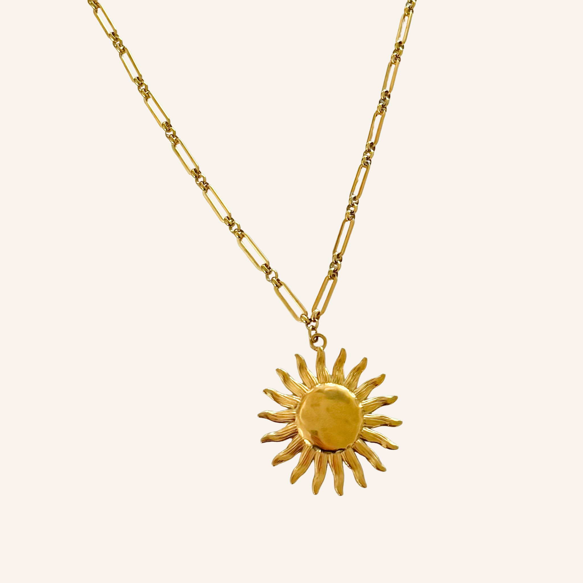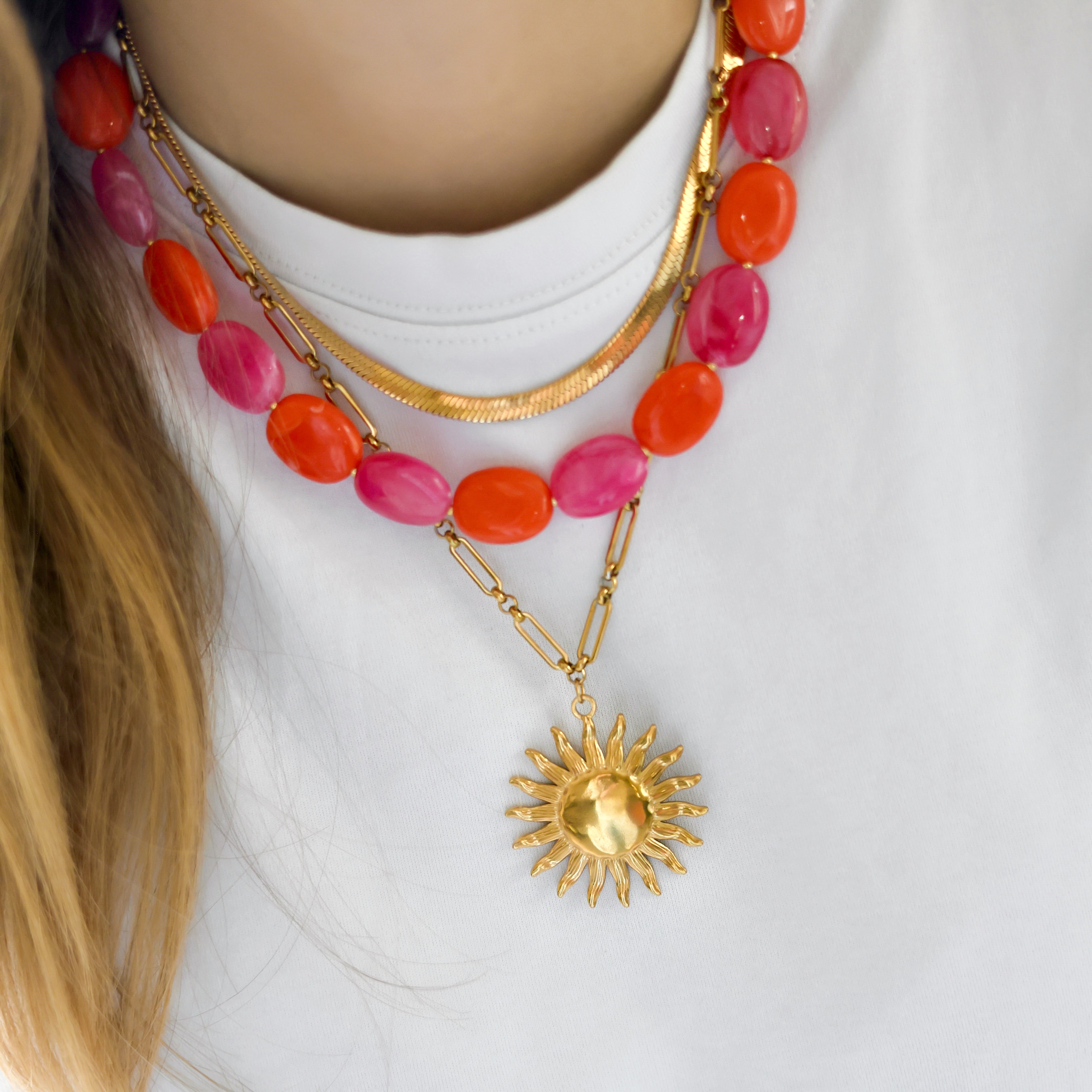 Beschikbaarheid vernieuwenOpvallende schakelketting met langwerpige en kleine ronde schakels, met in het midden een grote zonbedel die een zomerse, warme vibe aan je look geeft. Perfect als bold statement of om te layeren met andere kettingen. Gemaakt van roestvrij staal (stainless steel), verstelbaar en beschikbaar in goud en zilver. Een echte eye-catcher die je outfit meteen extra energie en een sunny touch geeft!Ā