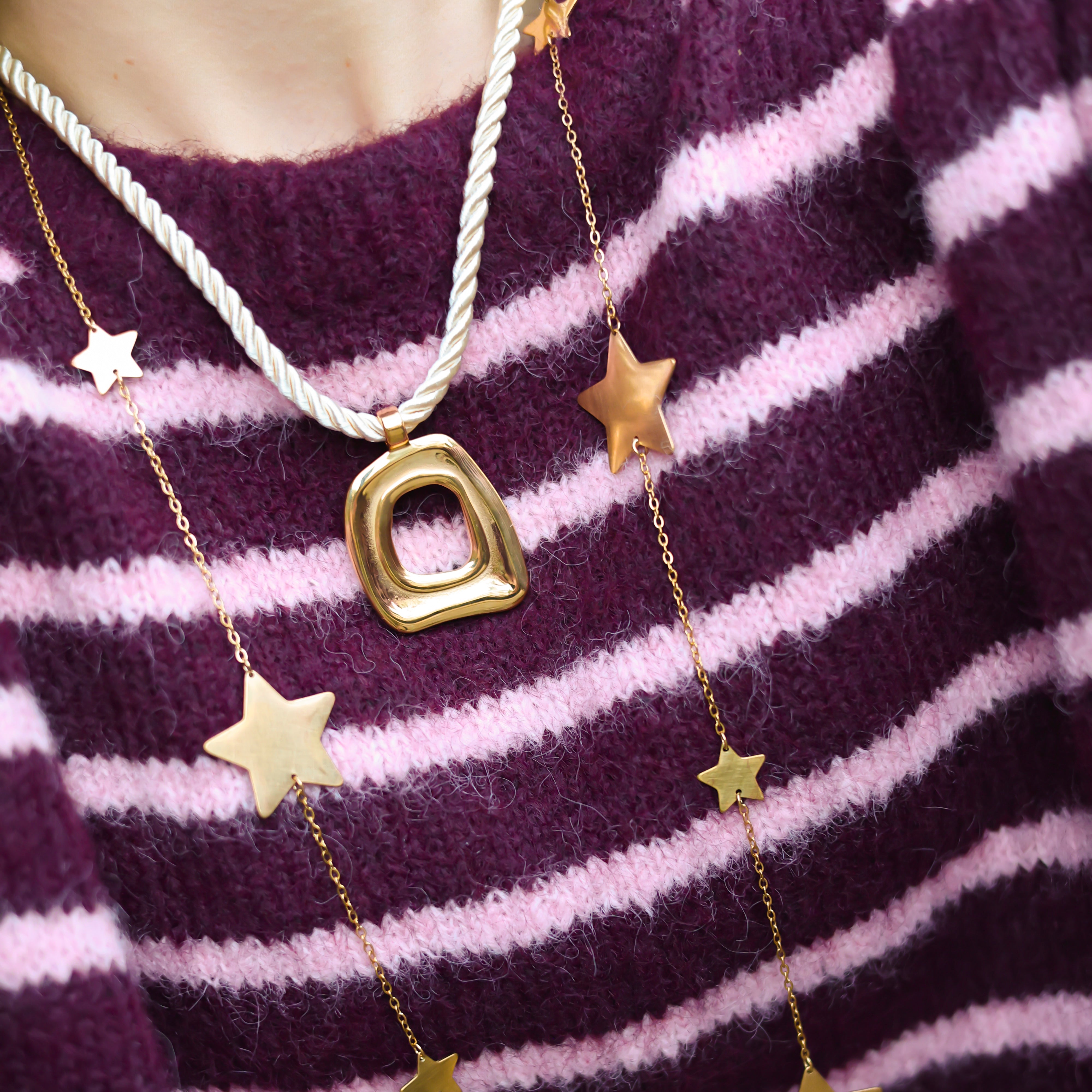 Beschikbaarheid vernieuwenGeef elke look instant It-girl energy met deze statement ketting met chunky touwkoord en een organische, rechthoekige hanger. De bold, sculpturale vorm trekt meteen de aandacht en geeft je outfit een moderne, fashion-forward uitstraling die perfect is voor feestdagen, avondjes uit en iedereen die houdt van opvallende sieraden. Deze roestvrij stalen ketting voelt stoer én chic tegelijk en is ideaal om solo te dragen als dé blikvanger van je look, of te combineren met andere kettingen voor een krachtige layered style.