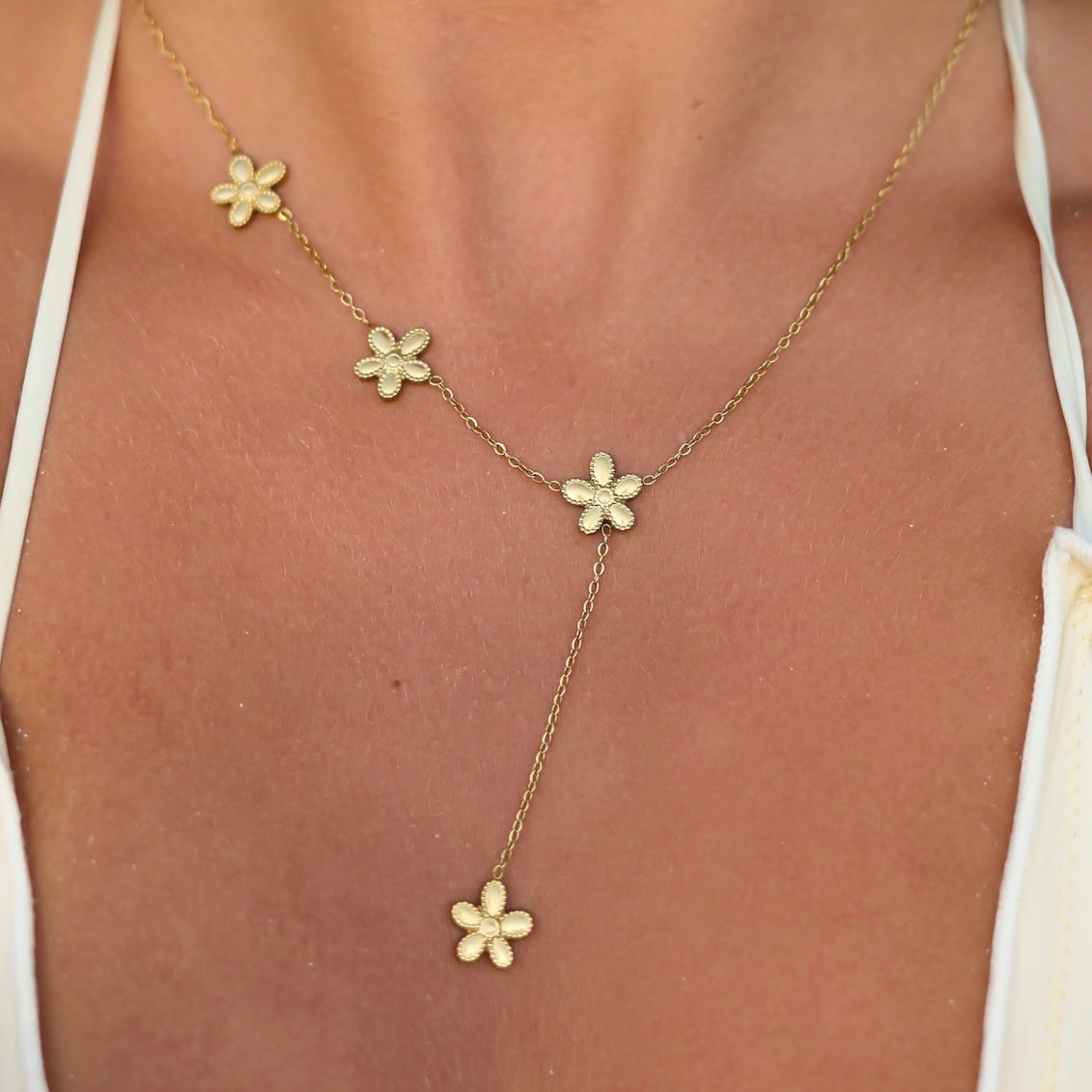 Breng de island vibes naar je sieradencollectie met dit trendy Y-vormige kettinkje in goud. De Island Flower Necklace is gemaakt van roestvrij staal en versierd met kleine bloemetjes voor een zomerse en cute touch. Combineer ‘m met het bijpassende armbandje of mix & match met andere gouden favorieten. Een perfecte eye-catcher voor elke sunny day, of je nu op het strand bent of in de stad.