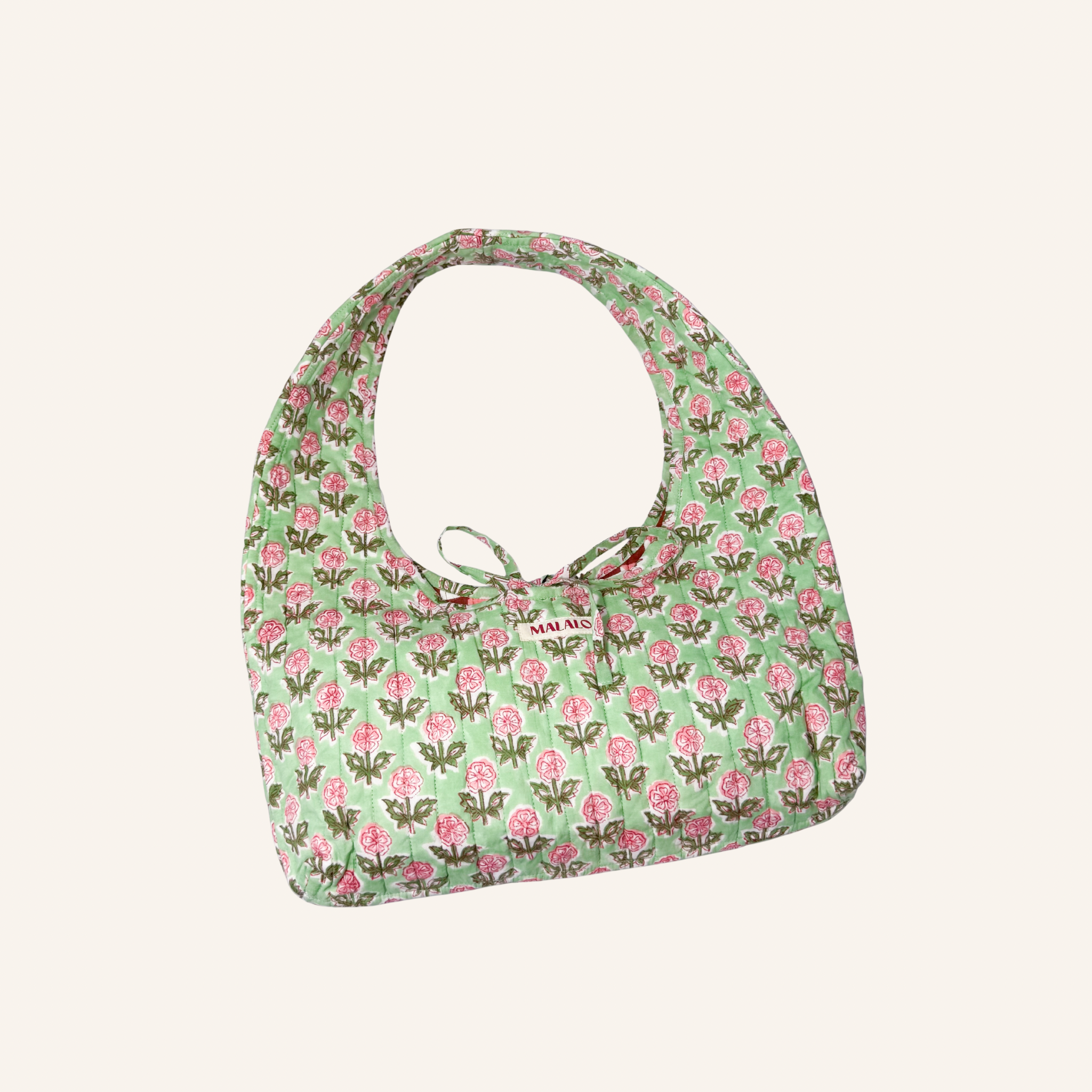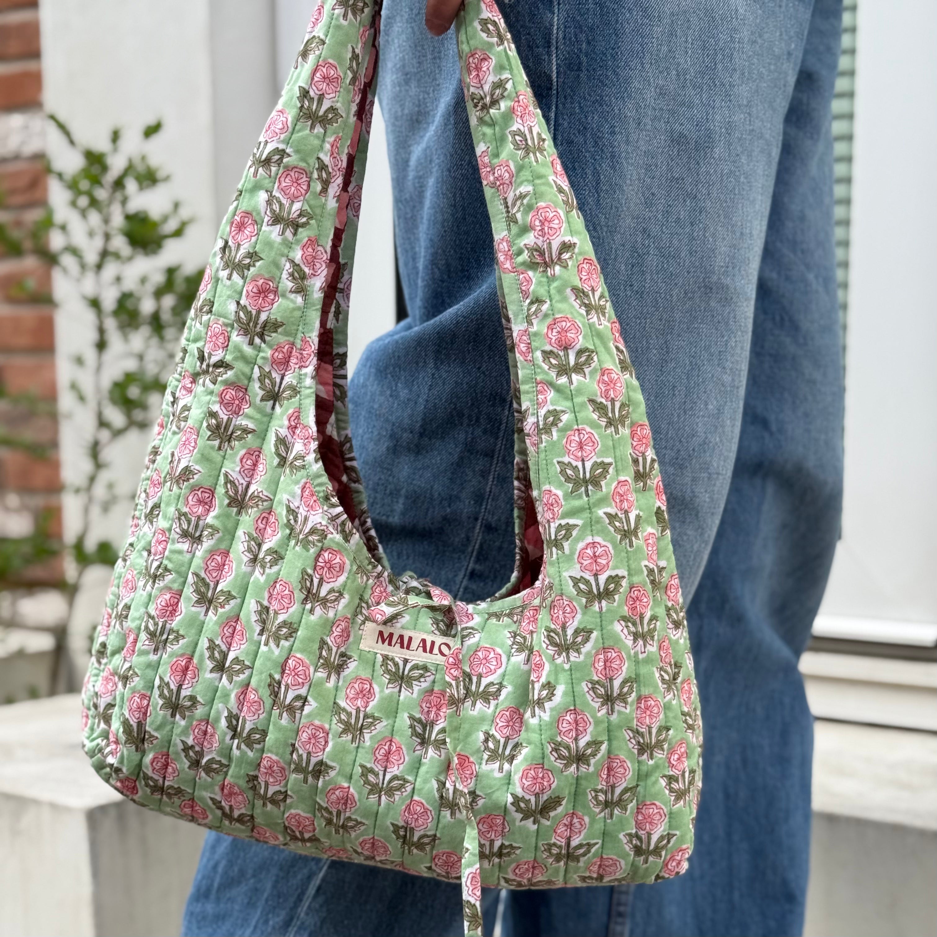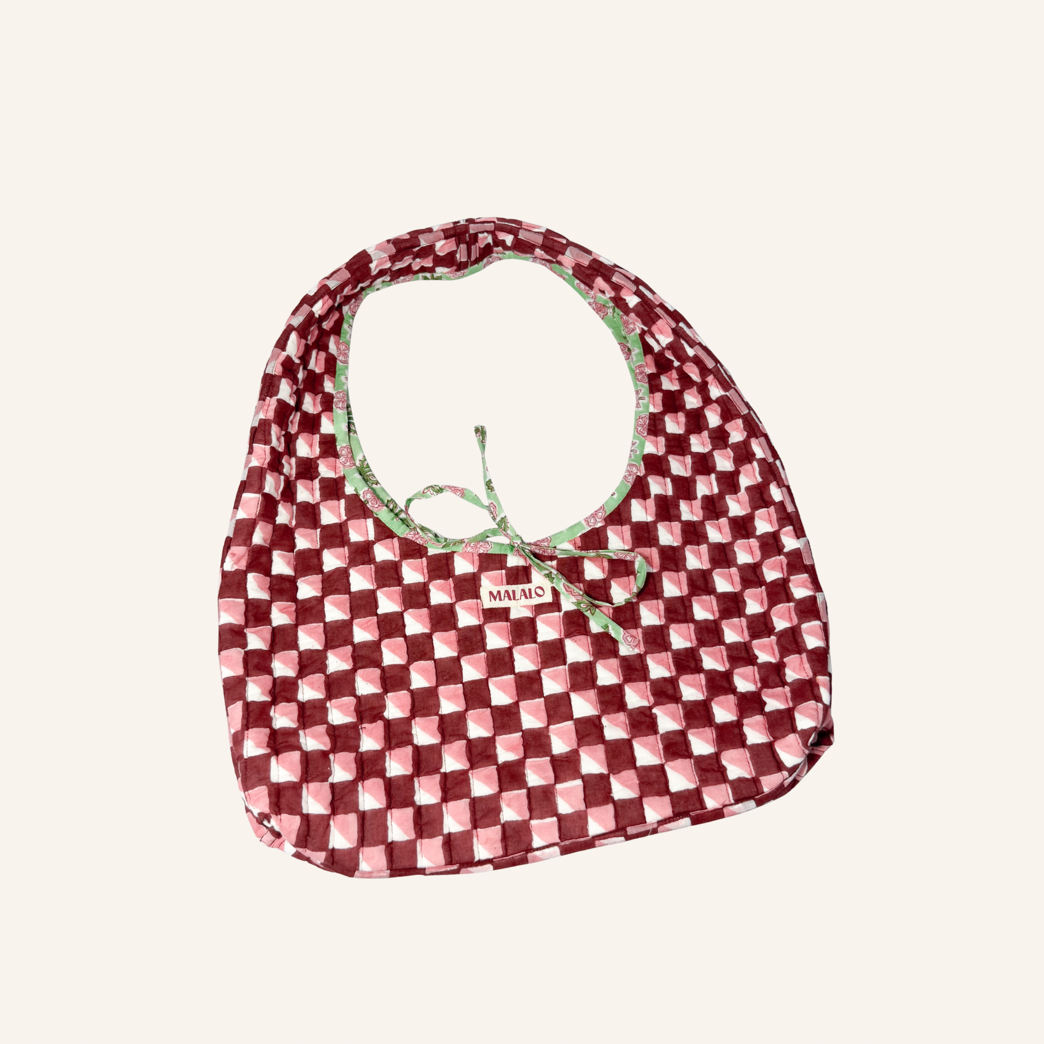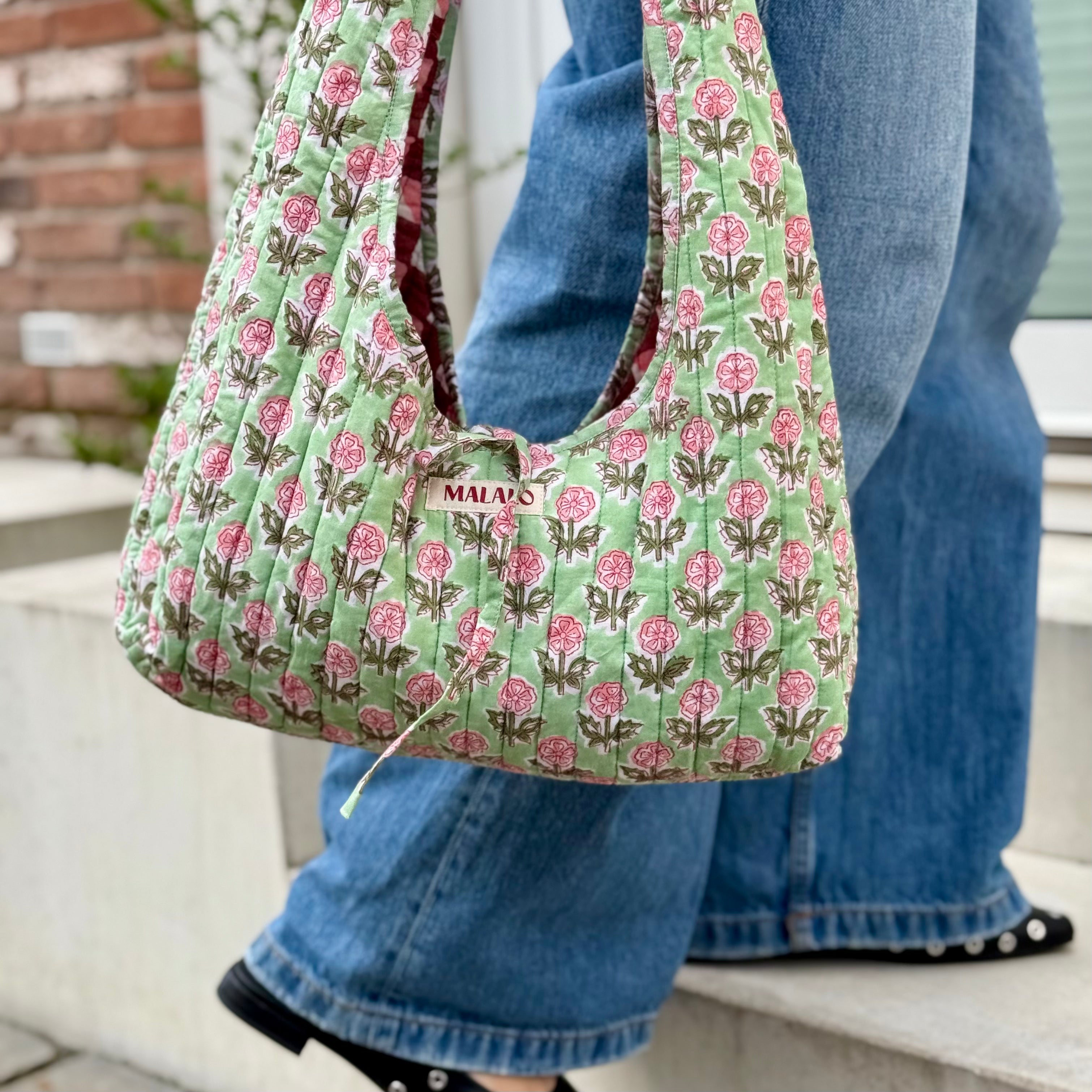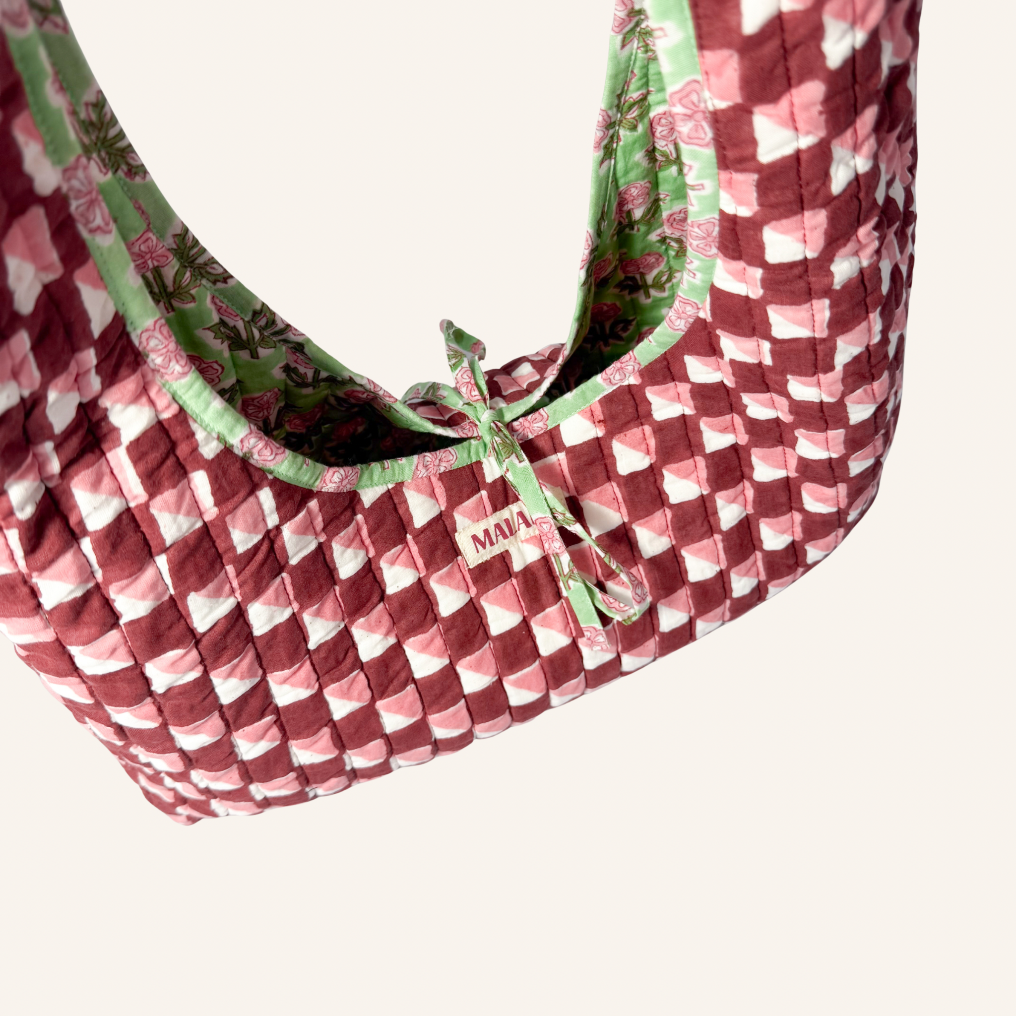 Beschikbaarheid vernieuwenReversible schoudertas van quilted katoen met aan de ene kant een cute lichtgroene bloemenprint en aan de andere kant een speelse ruitjesprint in de kleuren roze, rood en wit. De vorm is helemaal trendy en de striksluiting is een leuk detail. Een kleurrijke eye-catcher die je outfit direct een upgrade geeft en perfect is voor je alledaagse essentials.