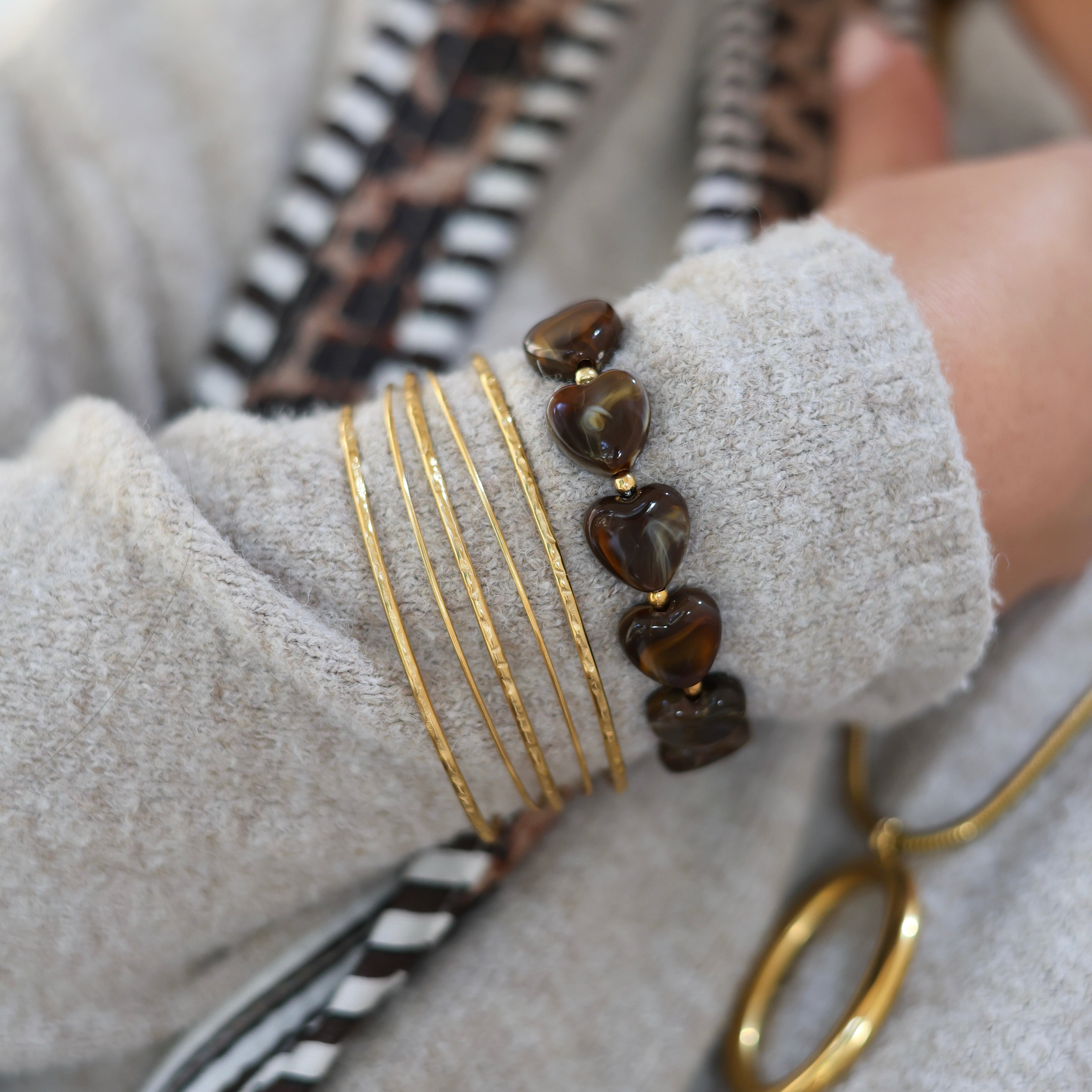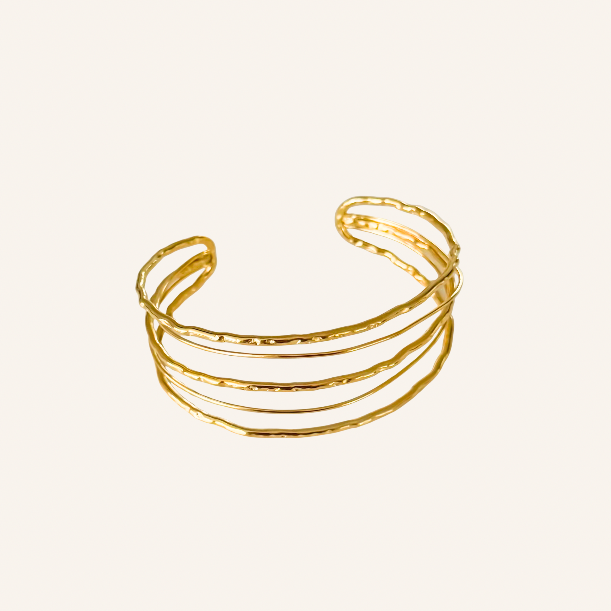 Deze verstelbare bangle armband met een wire design is perfect voor een elegante, moderne look. Deze brede roestvrij stalen armband in goud of zilver bestaat uit vijf draden die samen een subtiel maar opvallend geheel vormen. De afwisseling tussen gladde en gestructureerde draden geeft de armband extra diepte. Makkelijk om te doen en ideaal voor wie houdt van een classy accessoire dat moeiteloos met elke outfit te combineren is!