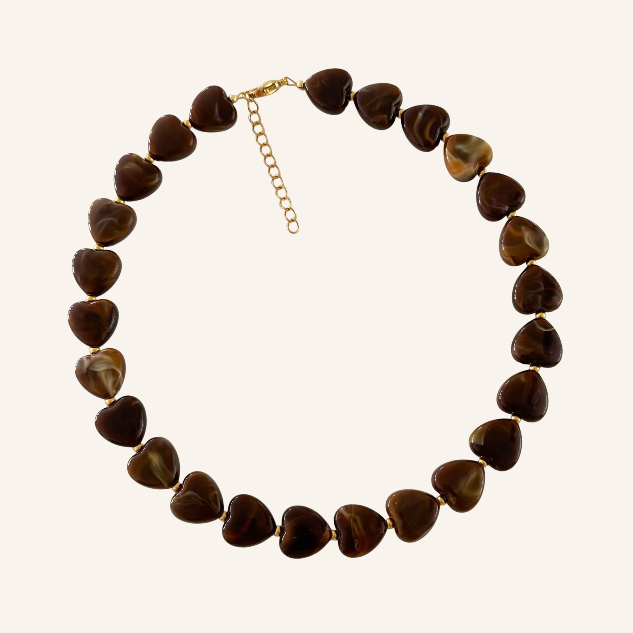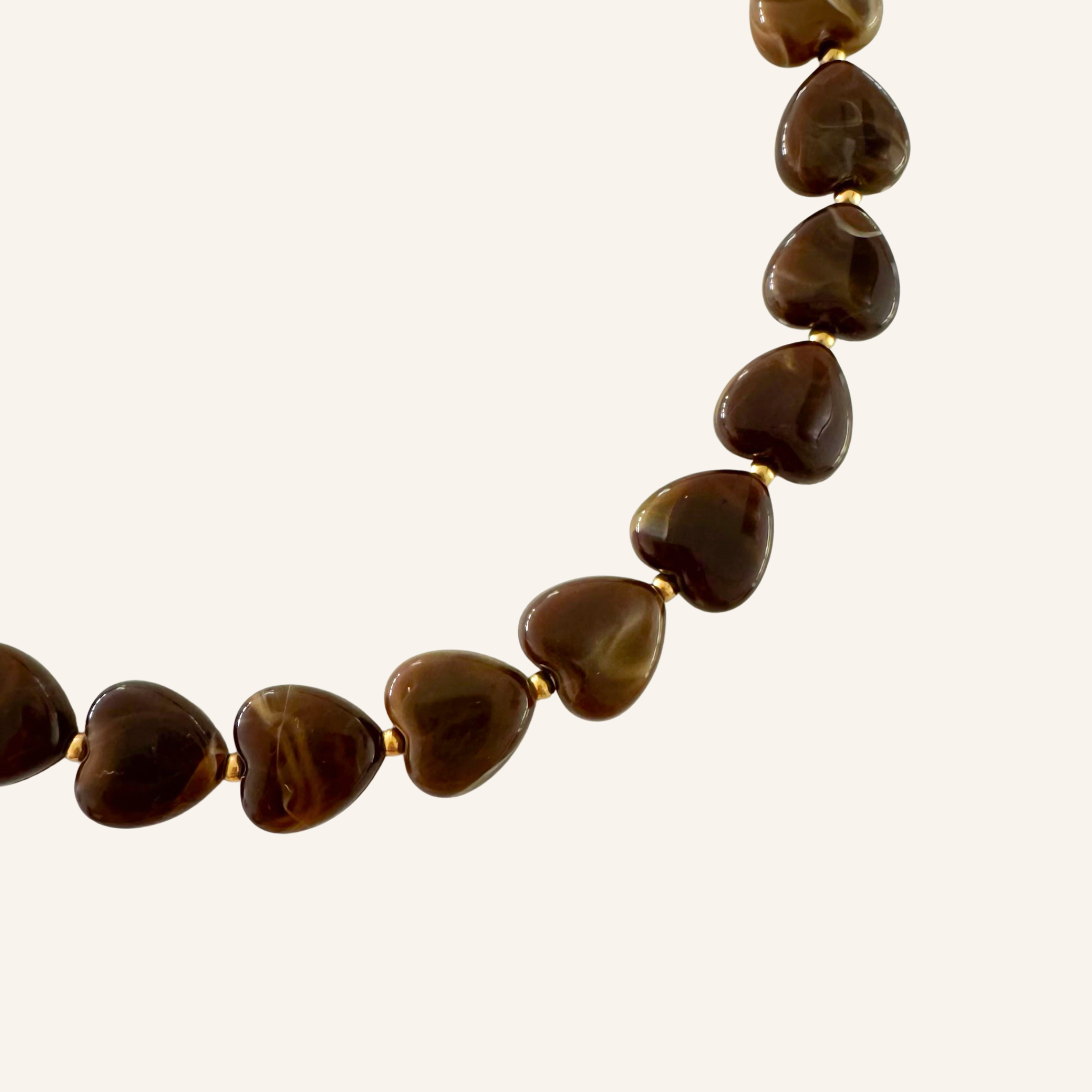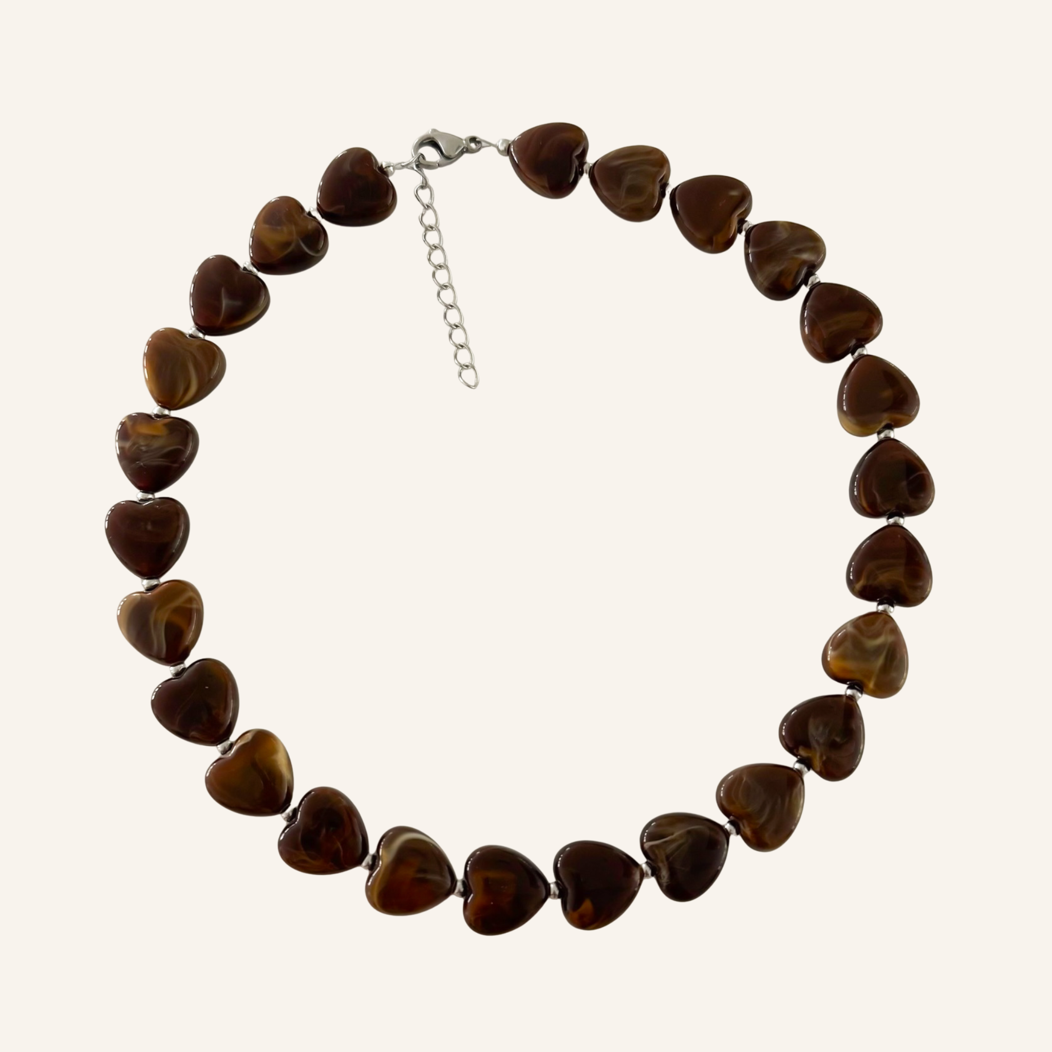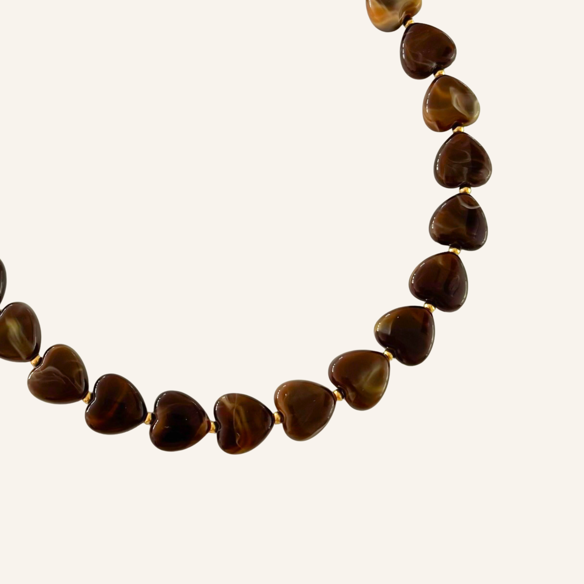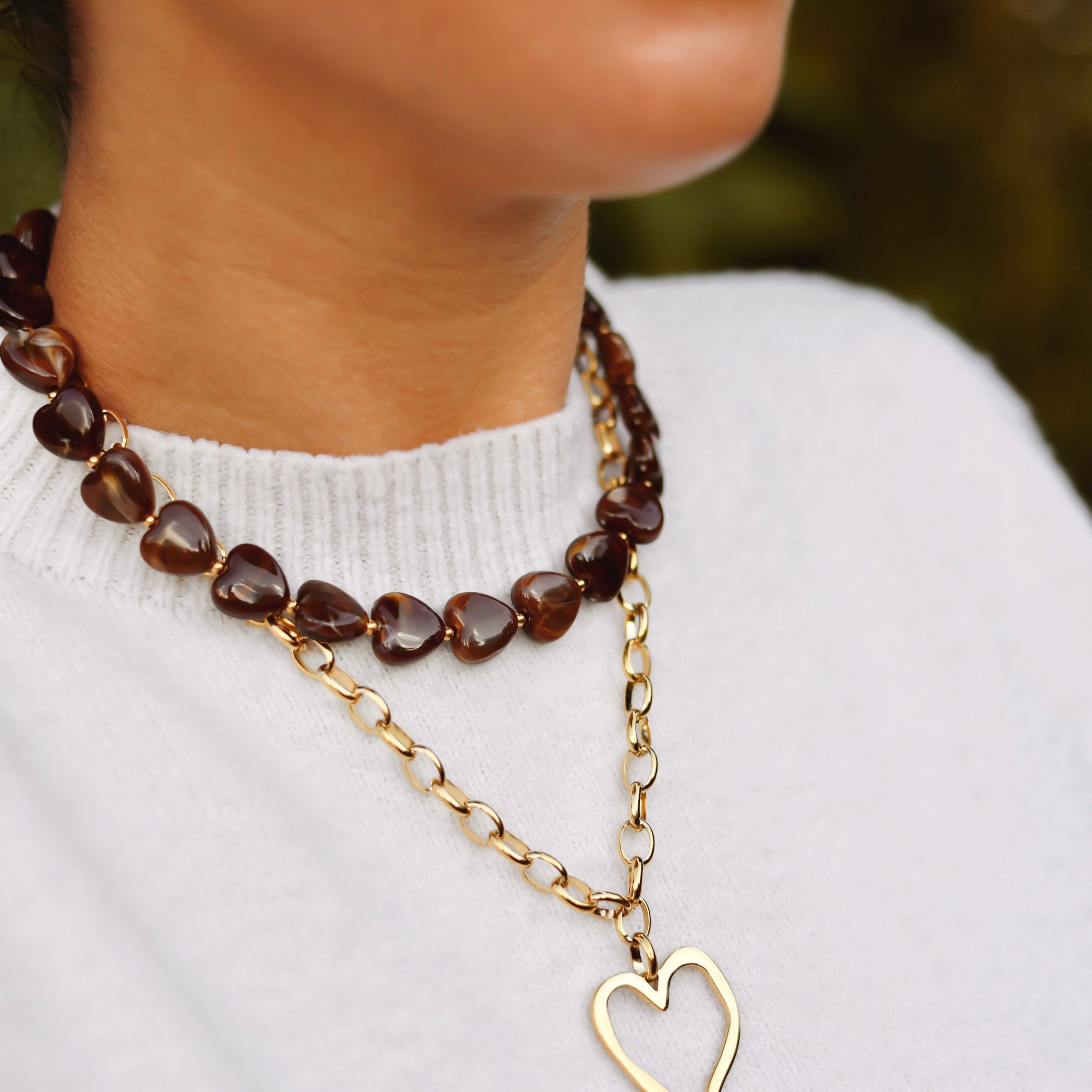 Met de glanzende bruine hartkralen en subtiele roestvrijstalen details is de Love Roast Necklace een tijdloze favoriet. De warme tinten voegen elegantie toe aan elke outfit. Draag haar los voor een verfijnde look of samen met andere sieraden voor een stijlvolle, gelaagde touch.
