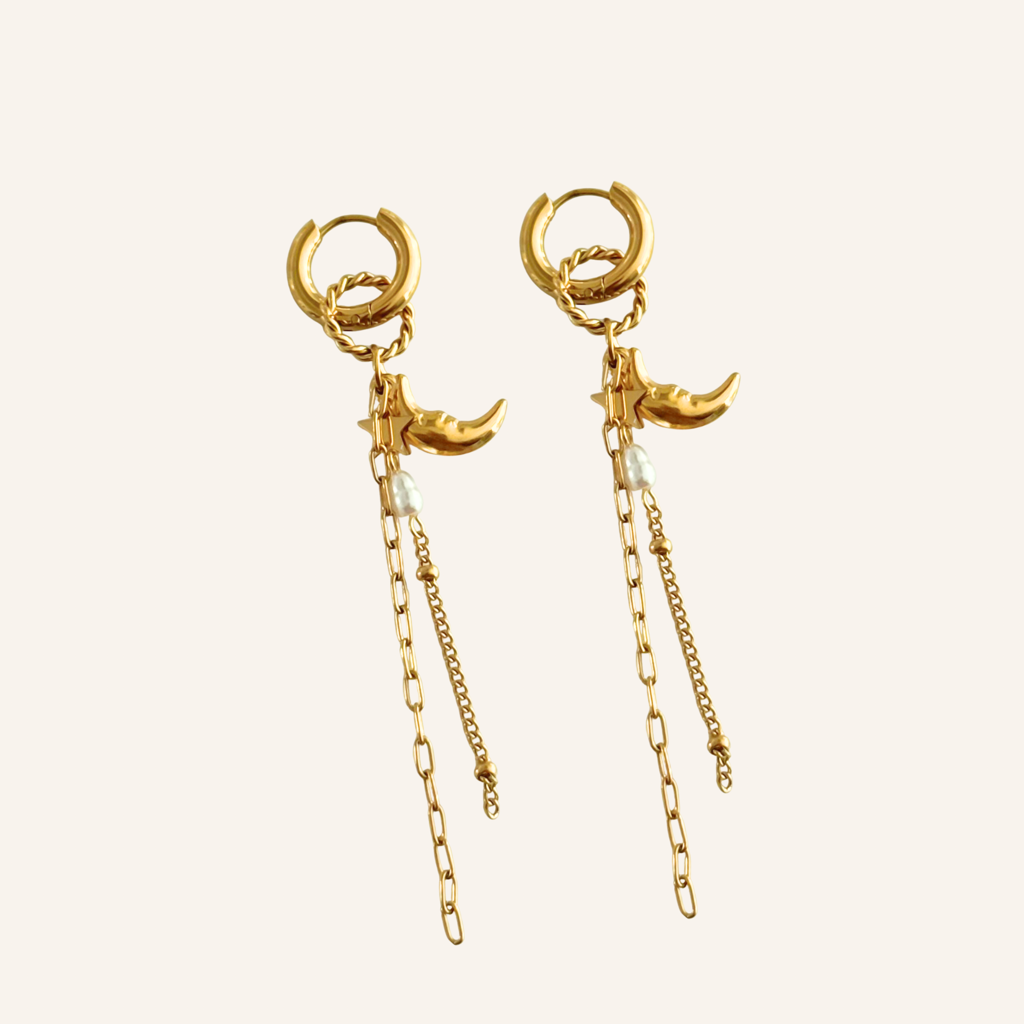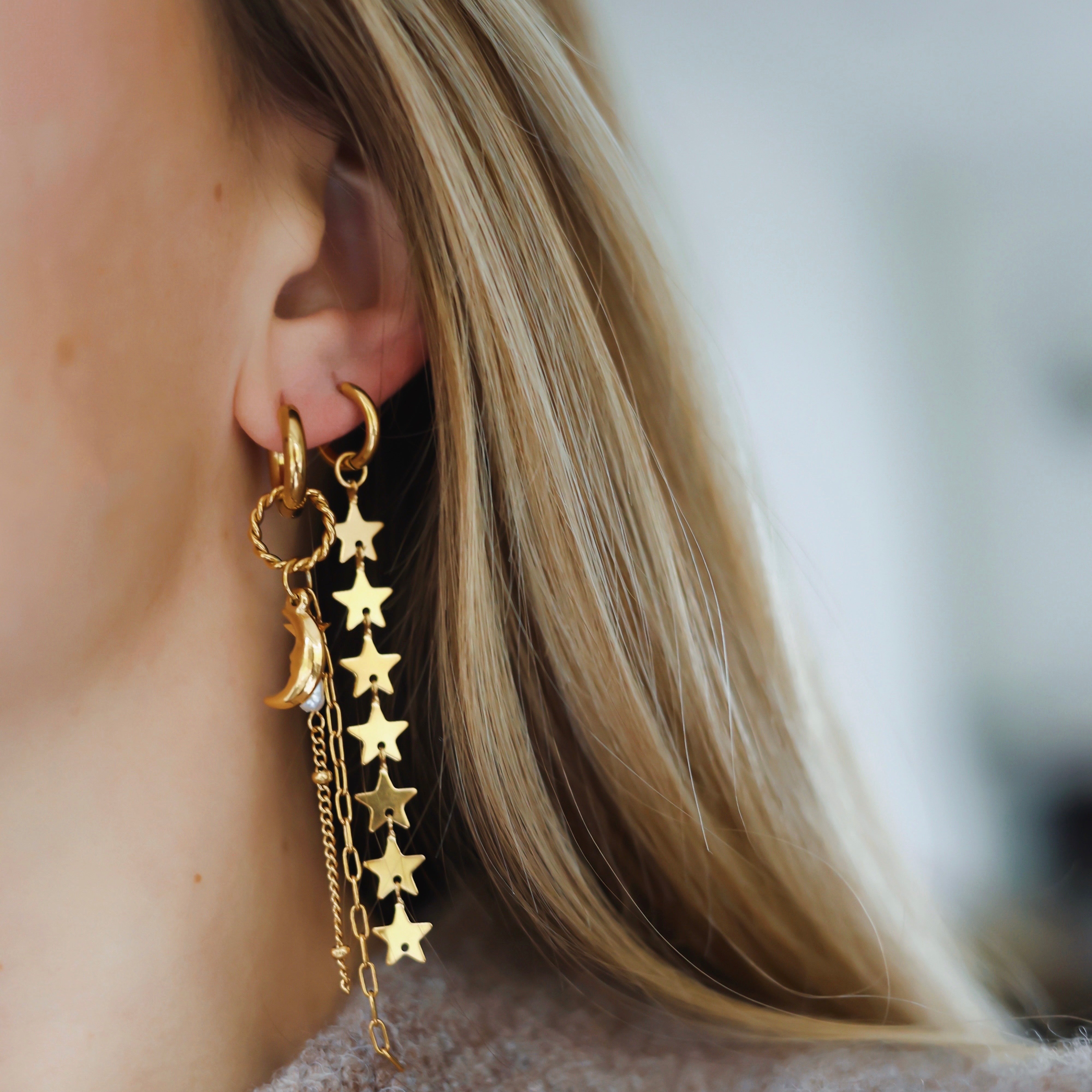 Beschikbaarheid vernieuwenReady to glow? Deze lange oorbellen met maan- en sterbedels zijn een echte eyecatcher voor elke gelegenheid. Gemaakt van roestvrij staal en afgewerkt met pareltjes en fijne kettinkjes die sierlijk meebewegen bij elke stap. De mix van glans, speelsheid en subtiele beweging geeft deze oorbellen een dromerige, maar toch moderne uitstraling. Verkrijgbaar in goud en zilver, zodat je ze perfect kunt afstemmen op jouw stijl. Ideaal om te dragen bij een avond uit, een feestje of gewoon wanneer je zin hebt om te stralen – deze oorbellen brengen instant sparkle in je look.