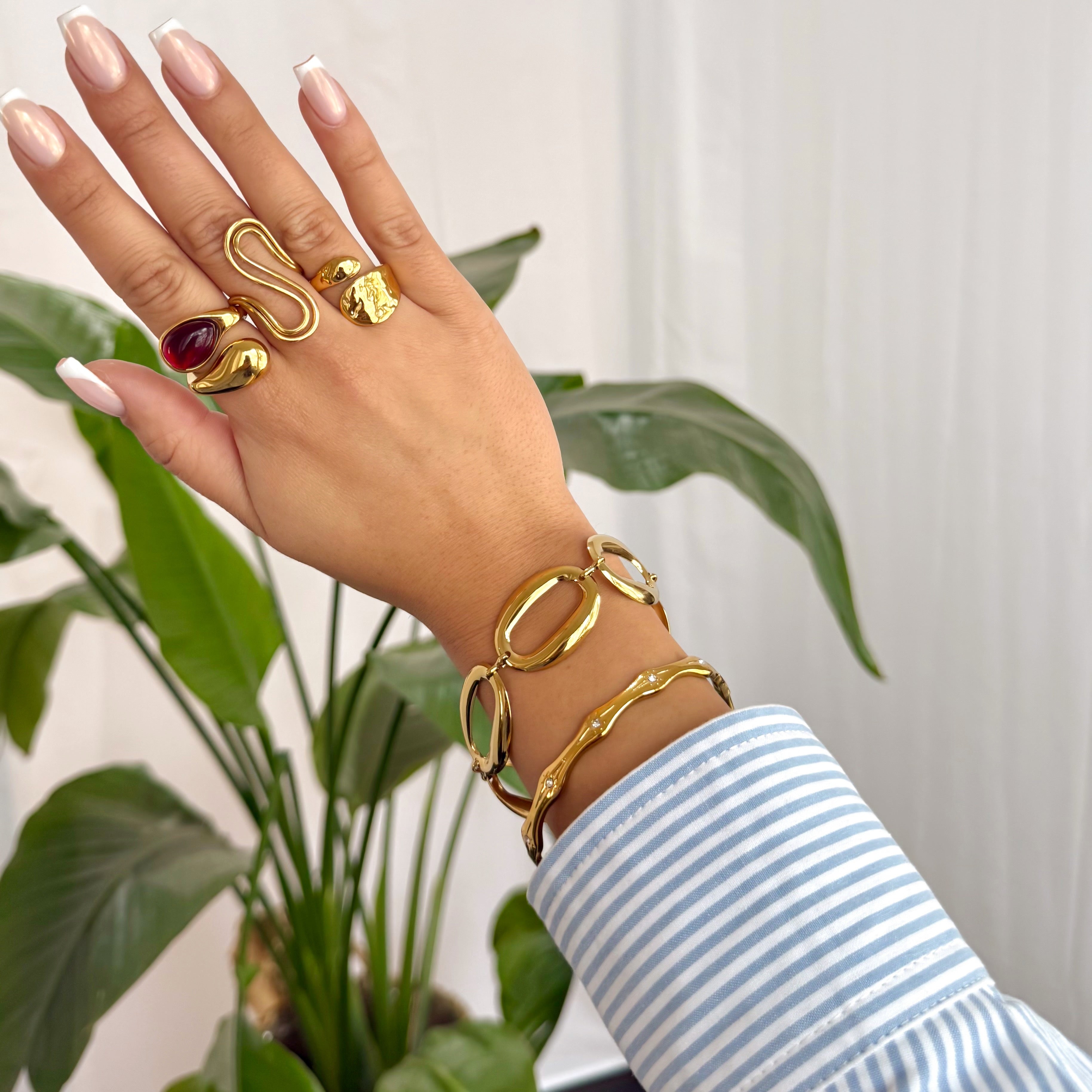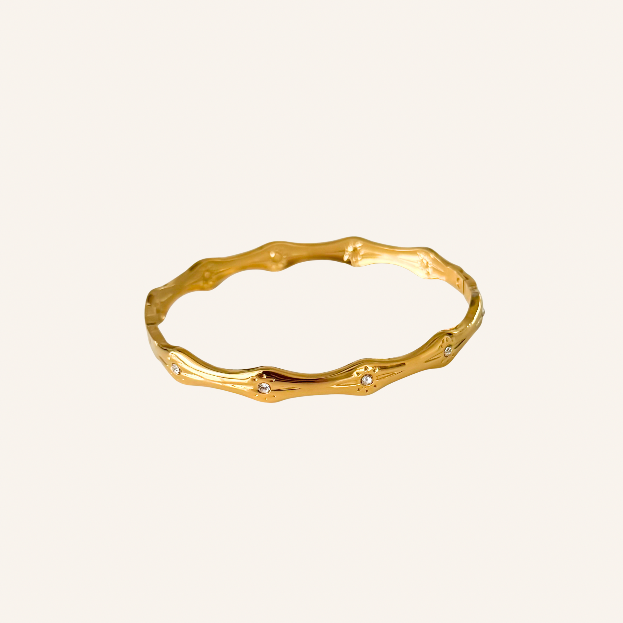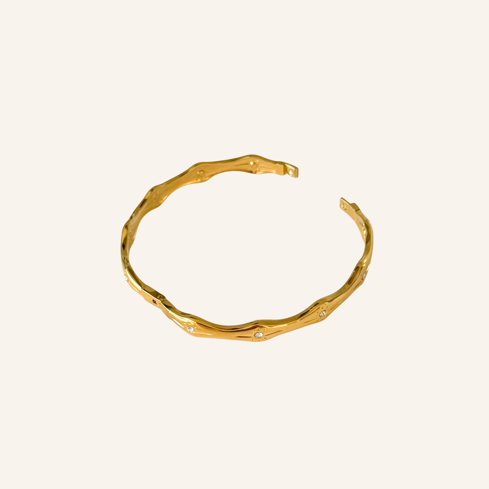 Deze gouden stainless steel bangle armband met vloeiende wave vorm en sprankelende sterretjes met zirconia steentjes is een echte trend piece! Ze geven de armband een shiny, bijna ocean-inspired glimmer. De stevige vorm en praktische scharniersluiting maken ’m ideaal voor dagelijks dragen. Combineer ‘m met de Ocean Spark Ring voor een stijlvolle en perfect afgestemde set!