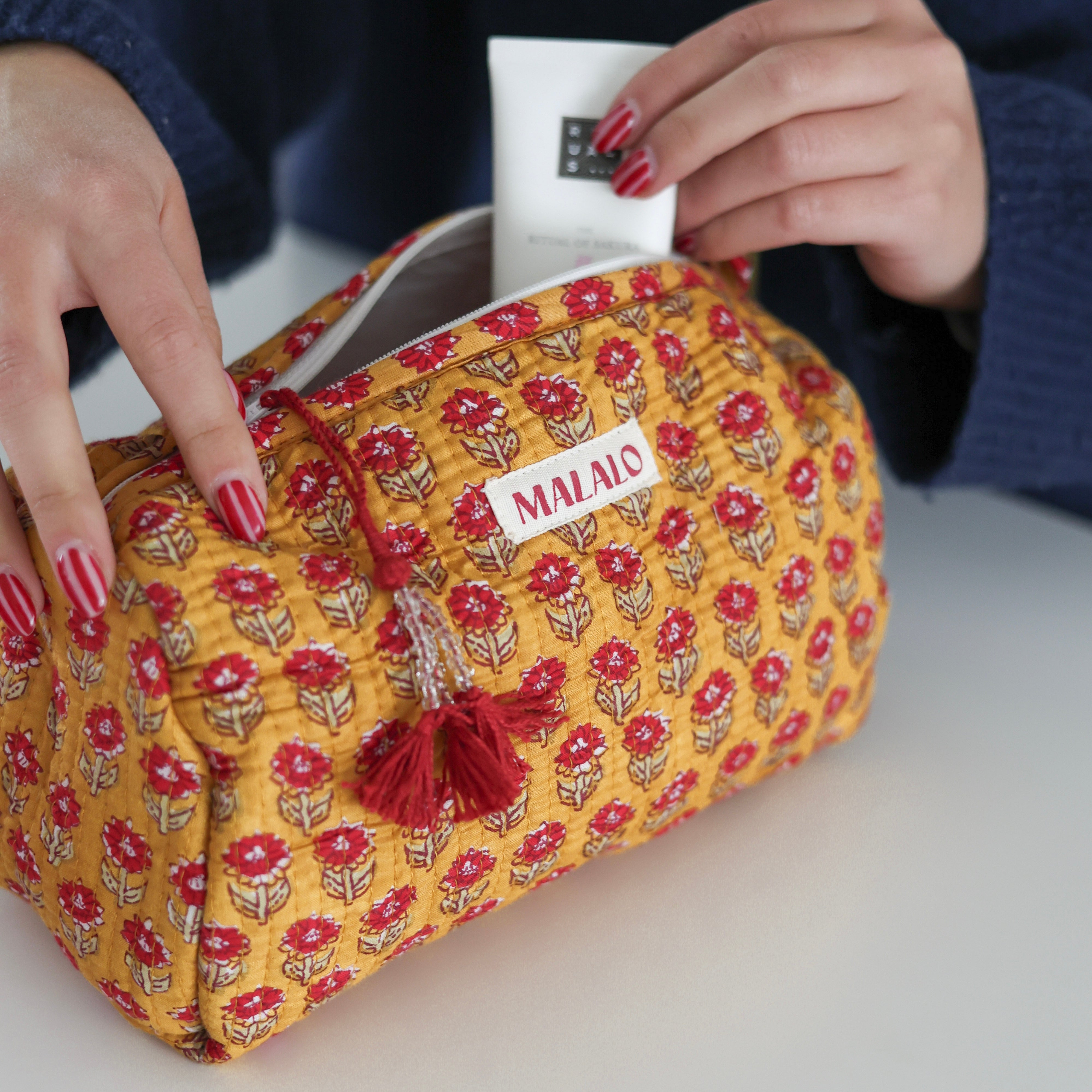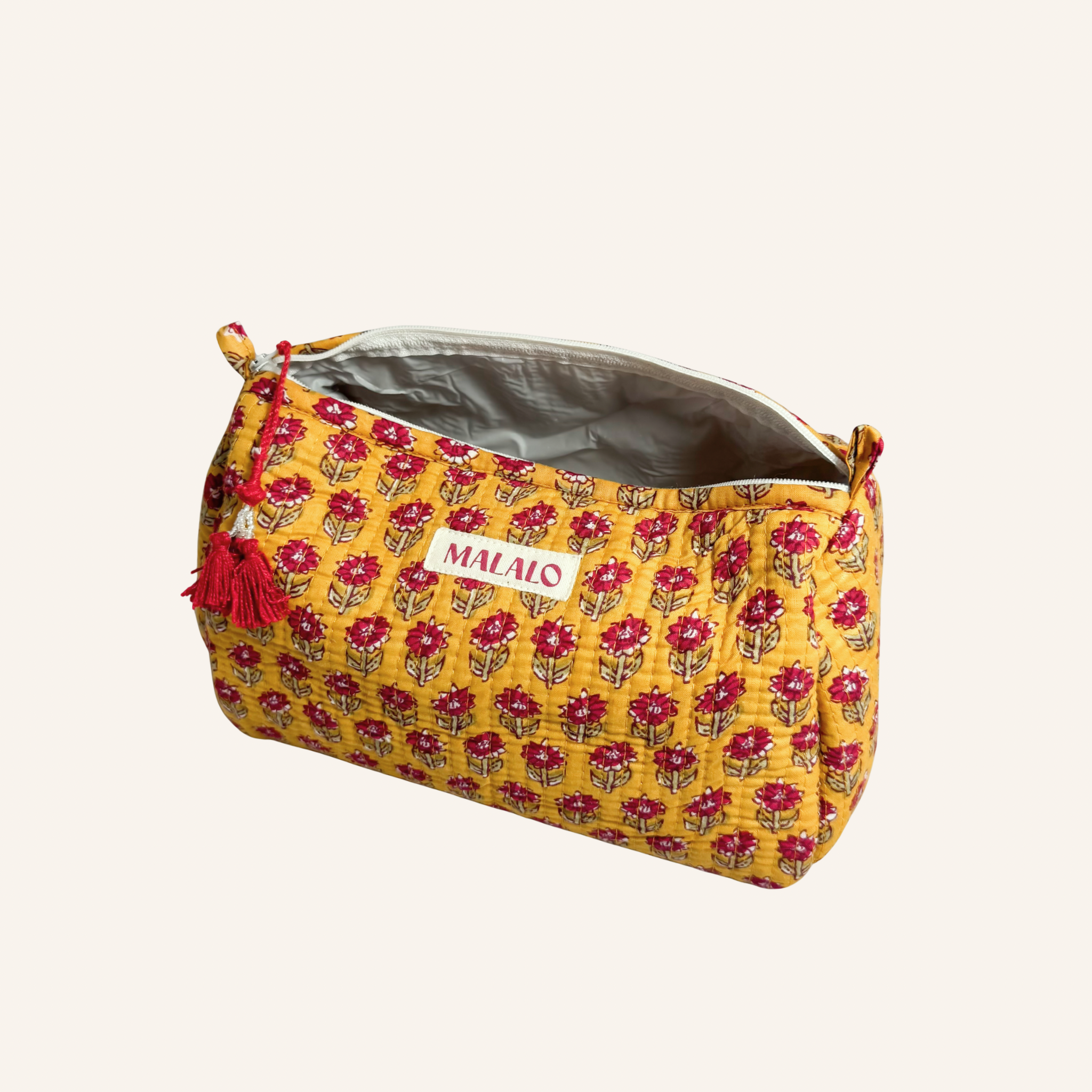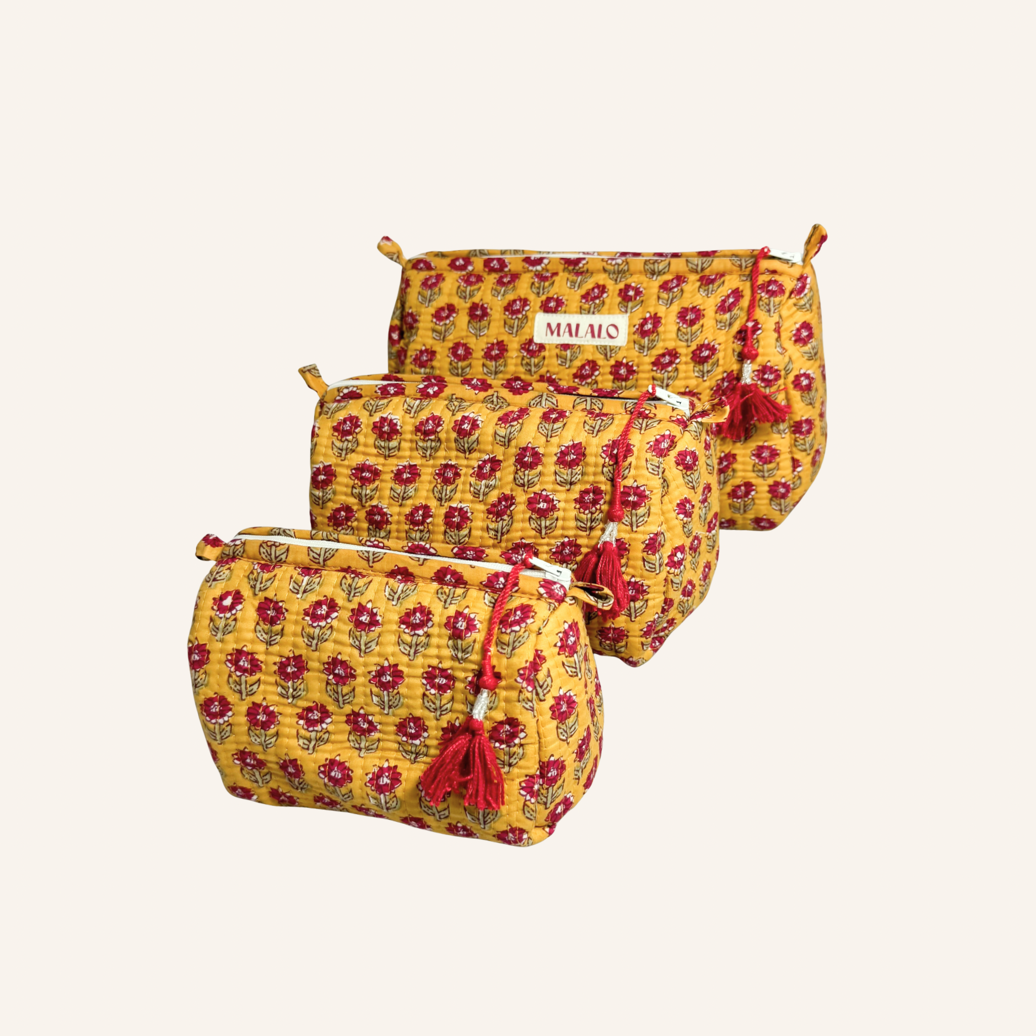 Beschikbaarheid vernieuwenOkergele toilettas met kleine rode bloemetjes, ritssluiting en 2 binnenvakjes: helemaal vrolijk met door de warme kleuren. De kleine, herhalende bloemenprint geeft deze toilettas een trendy en tijdloze uitstraling. Verkrijgbaar in 3 maten (klein, middel, groot), zodat je altijd de juiste hoeveelheid essentials meeneemt. Een stijlvolle must-have voor op vakantie of dagelijks gebruik.Ā