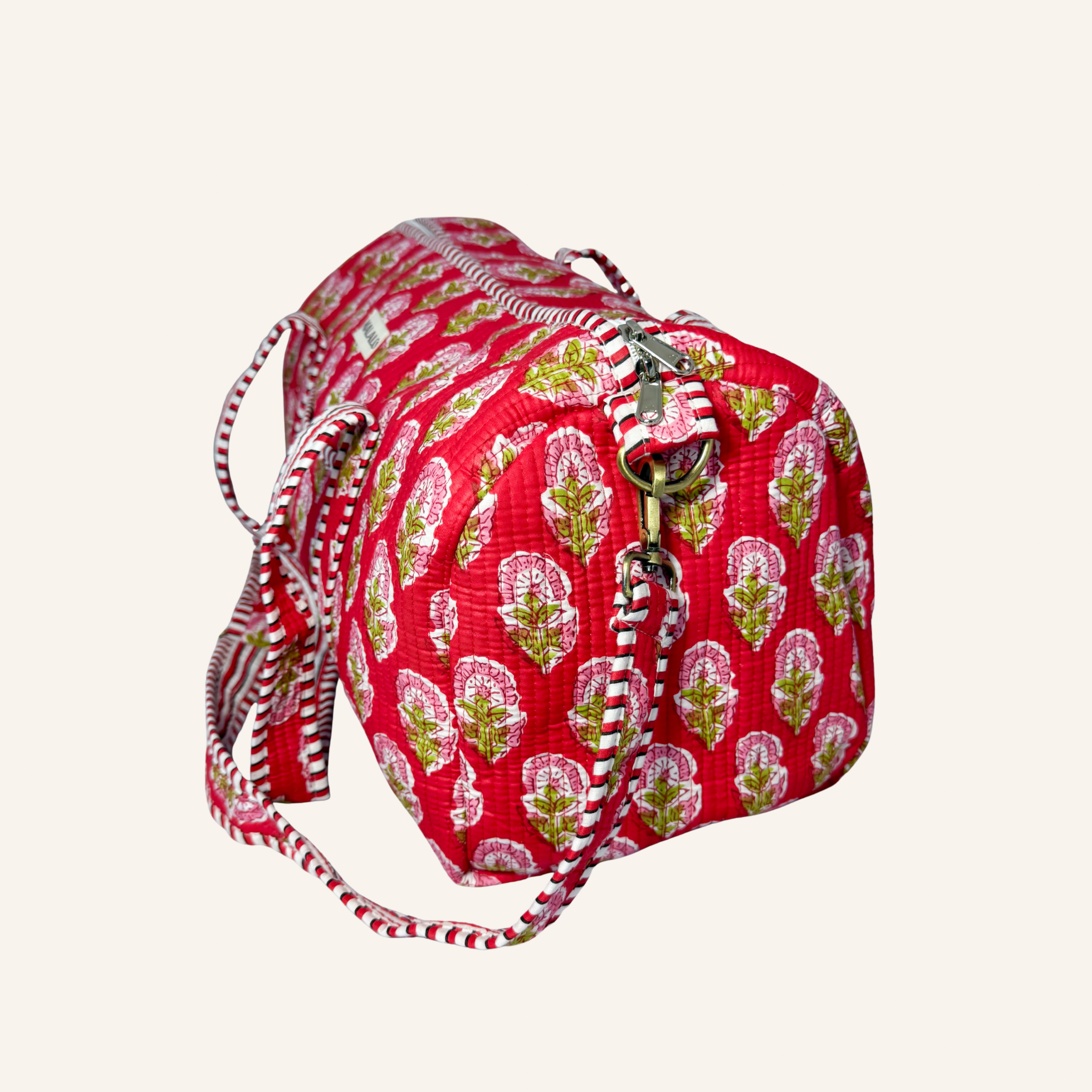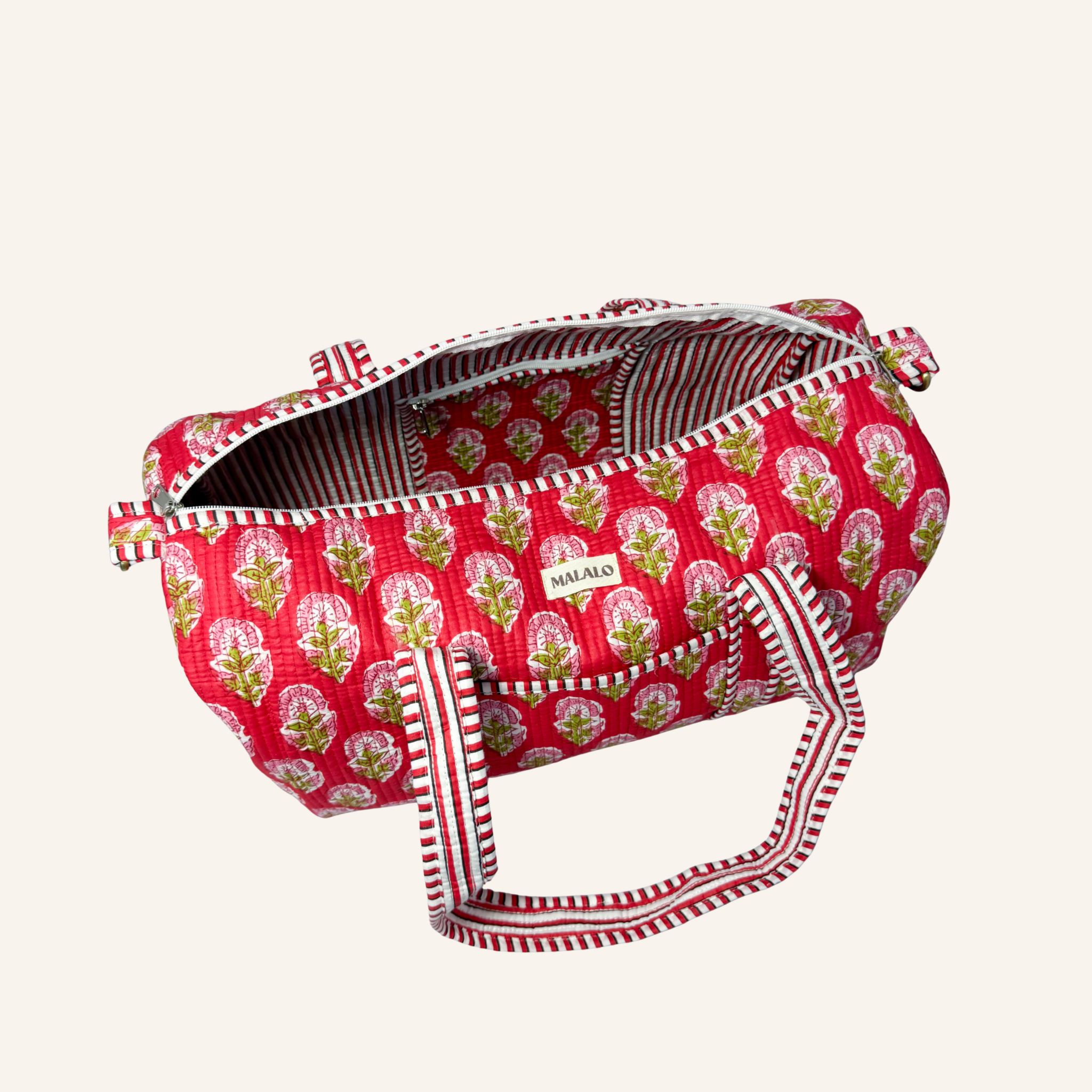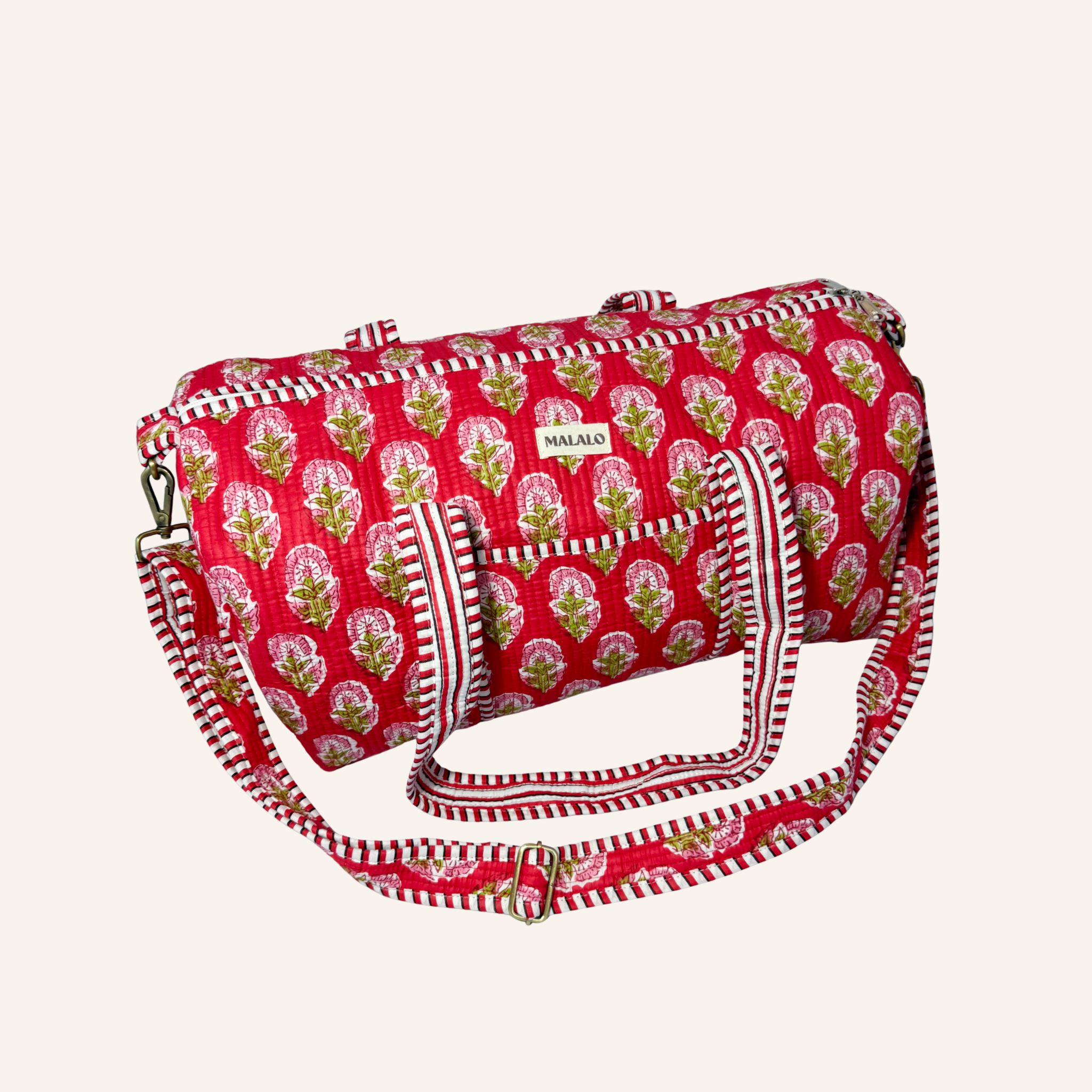Beschikbaarheid vernieuwenDeze rode duffle bag met bloemenprint is een praktische en kleurrijke weekendtas die ook perfect werkt als sporttas. De rode basis met roze bloemen zorgt voor een opvallende, vrolijke look. Dankzij de ritssluiting blijven je spullen veilig opgeborgen. Je draagt de tas in de hand of comfortabel over de schouder met het verstelbare en afneembare hengsel. Het kleine binnenvakje en het extra buitenvak maken deze tas ideaal voor dagelijks gebruik of korte trips.