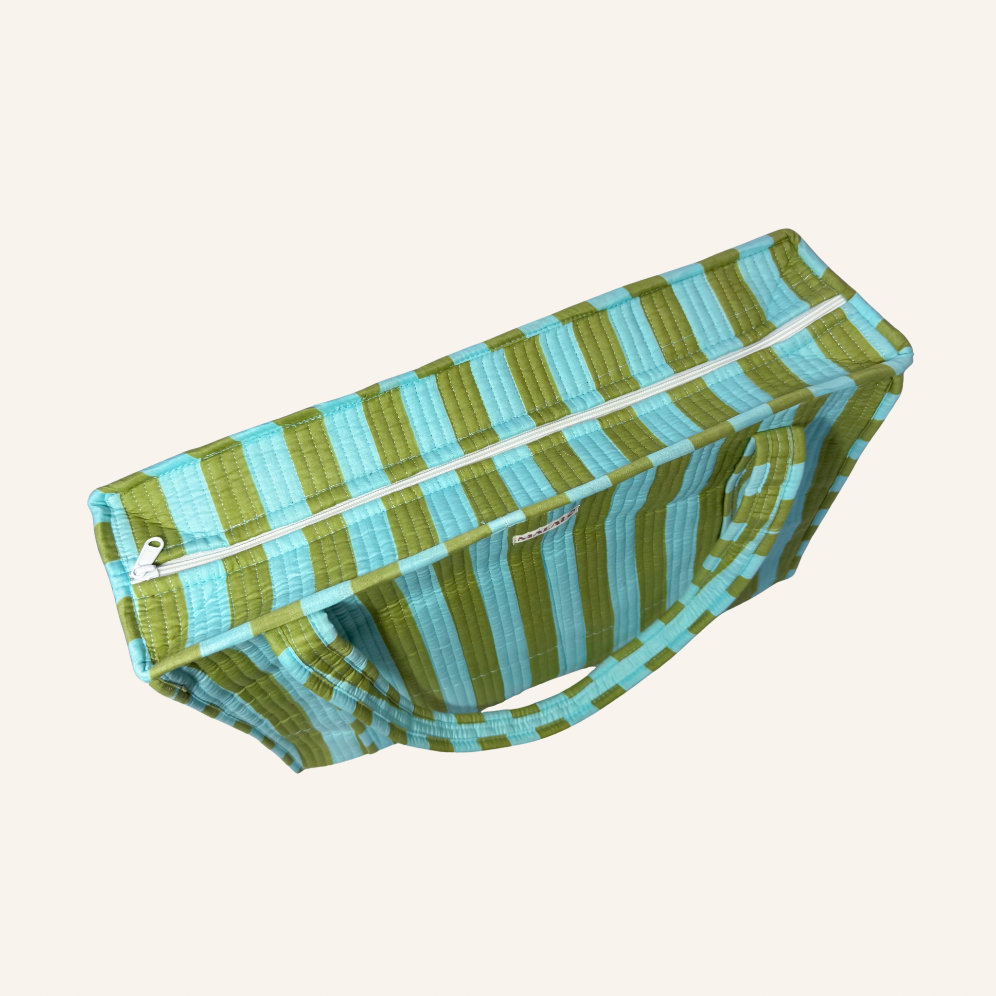 Beschikbaarheid vernieuwenDeze blauw-groene gestreepte tas is een ruime shopper tas en stijlvolle damestas voor dagelijks gebruik. De quilted tas van katoen heeft een frisse uitstraling en is perfect als grote tas voor een dagje stad, werk of boodschappen. Dankzij de ritssluiting blijven je spullen veilig opgeborgen en met drie handige binnenvakjes organiseer je eenvoudig je telefoon, sleutels en andere essentials. De stevige handvatten en het ruime formaat maken deze gestreepte shopper comfortabel om de hele dag te dragen!