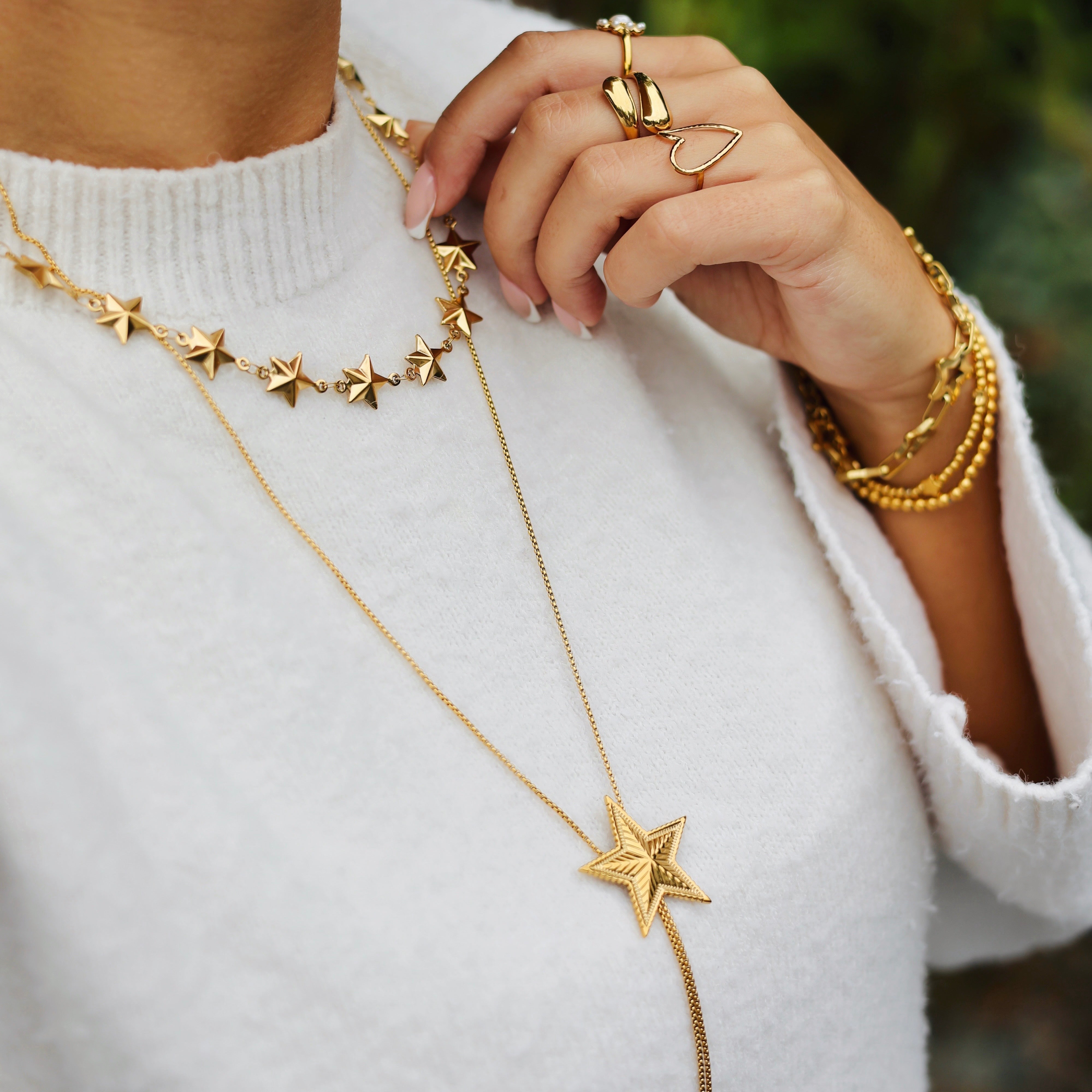 Beschikbaarheid vernieuwenEen elegante lange ketting in Y-vorm met een verschuifbare sterhanger die je hoger of lager kunt dragen voor de perfecte look. Gemaakt van roestvrij staal, met een glanzende ster die je outfit een stijlvolle, speelse touch geeft. De slanke vorm maakt hem ideaal om solo te dragen of te combineren met andere kettingen voor een gelaagde look. Een tijdloos accessoire dat elke dag een subtiele sparkle toevoegt.