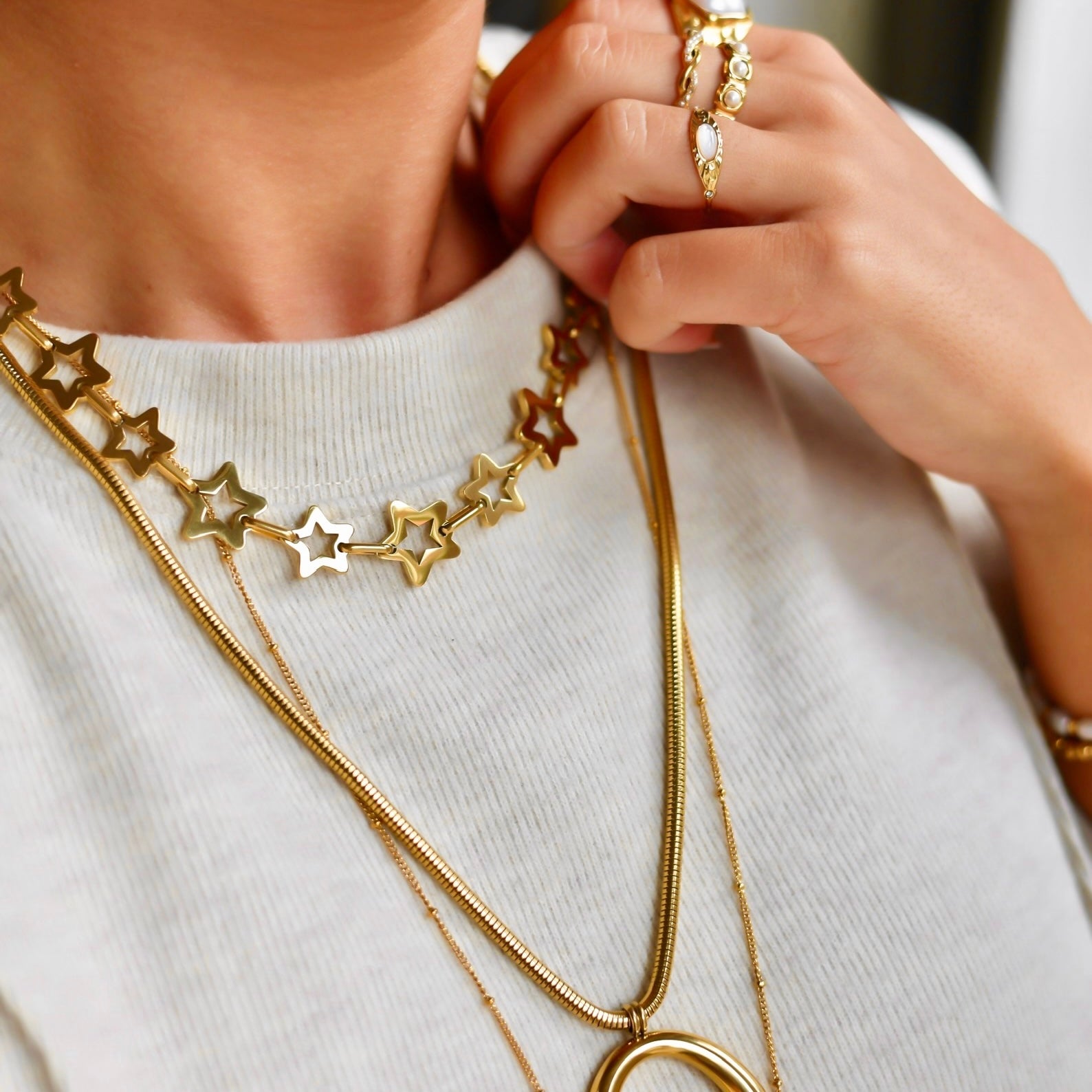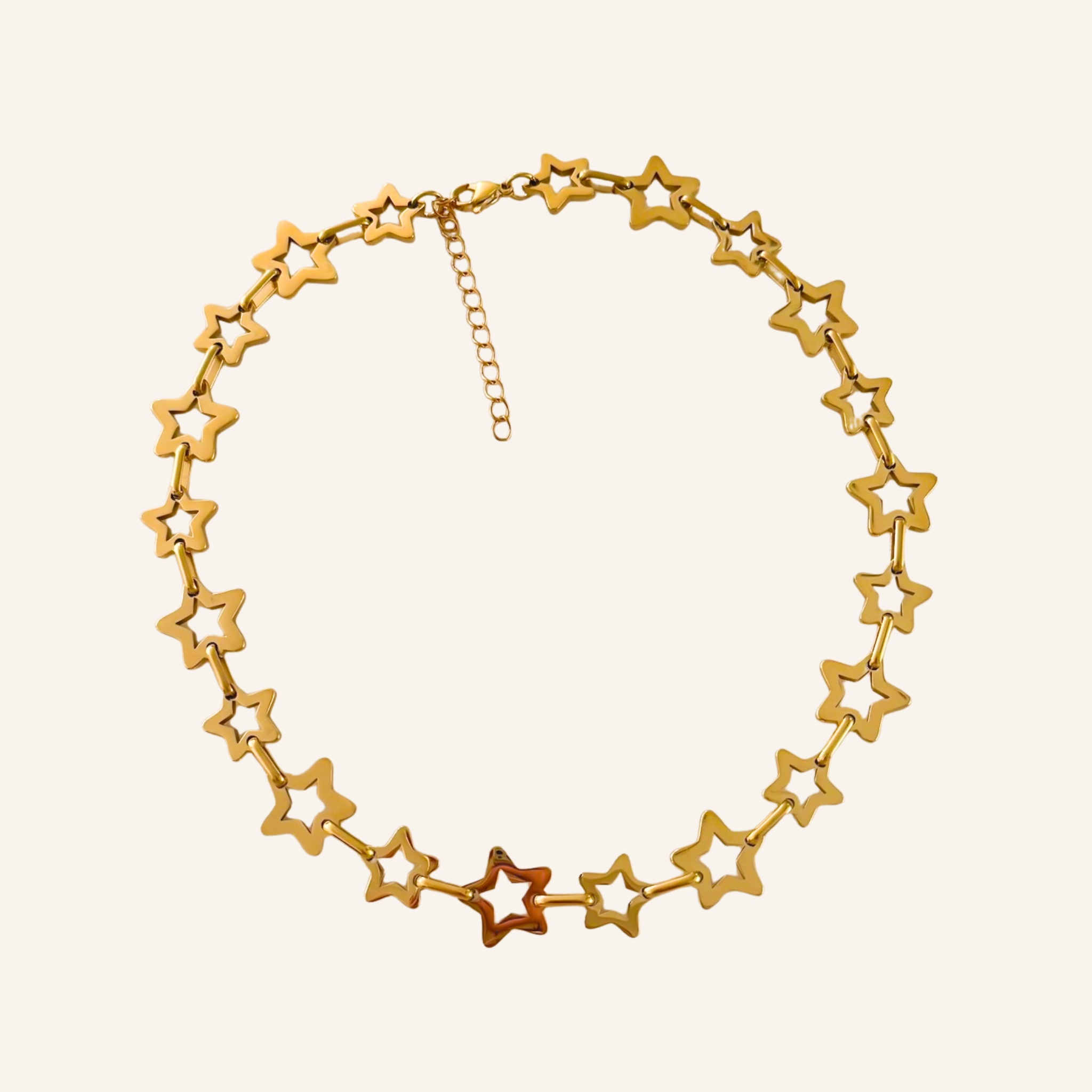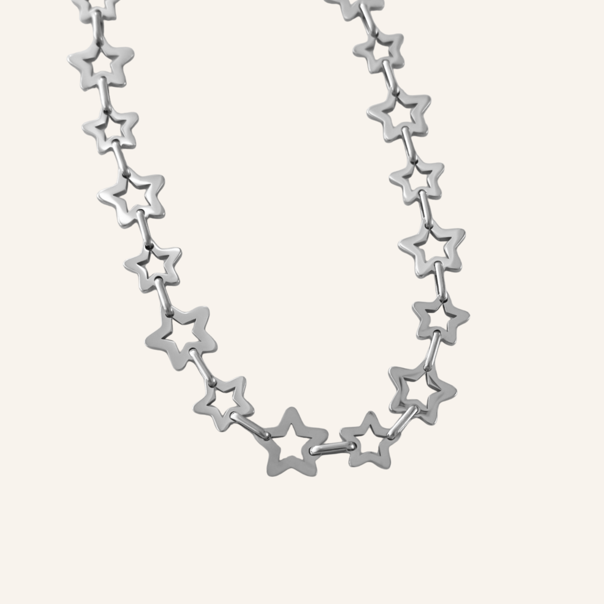 Beschikbaarheid vernieuwenShine bright met deze sterren ketting van roestvrij staal! De open ster schakels geven een speelse, glanzende look die direct opvalt en elke outfit iets extra’s geeft. Draag haar solo als statement piece of combineer met andere langere kettingen voor een stijlvolle layered look. Extra leuk: match met de bijpassende Starflow Bracelet voor een complete sterrencombinatie. Verkrijgbaar in goud en zilver, zodat je hem perfect kunt afstemmen op jouw eigen stijl. Of je nu gaat voor casual of full glam: deze ketting laat je altijd stralen.