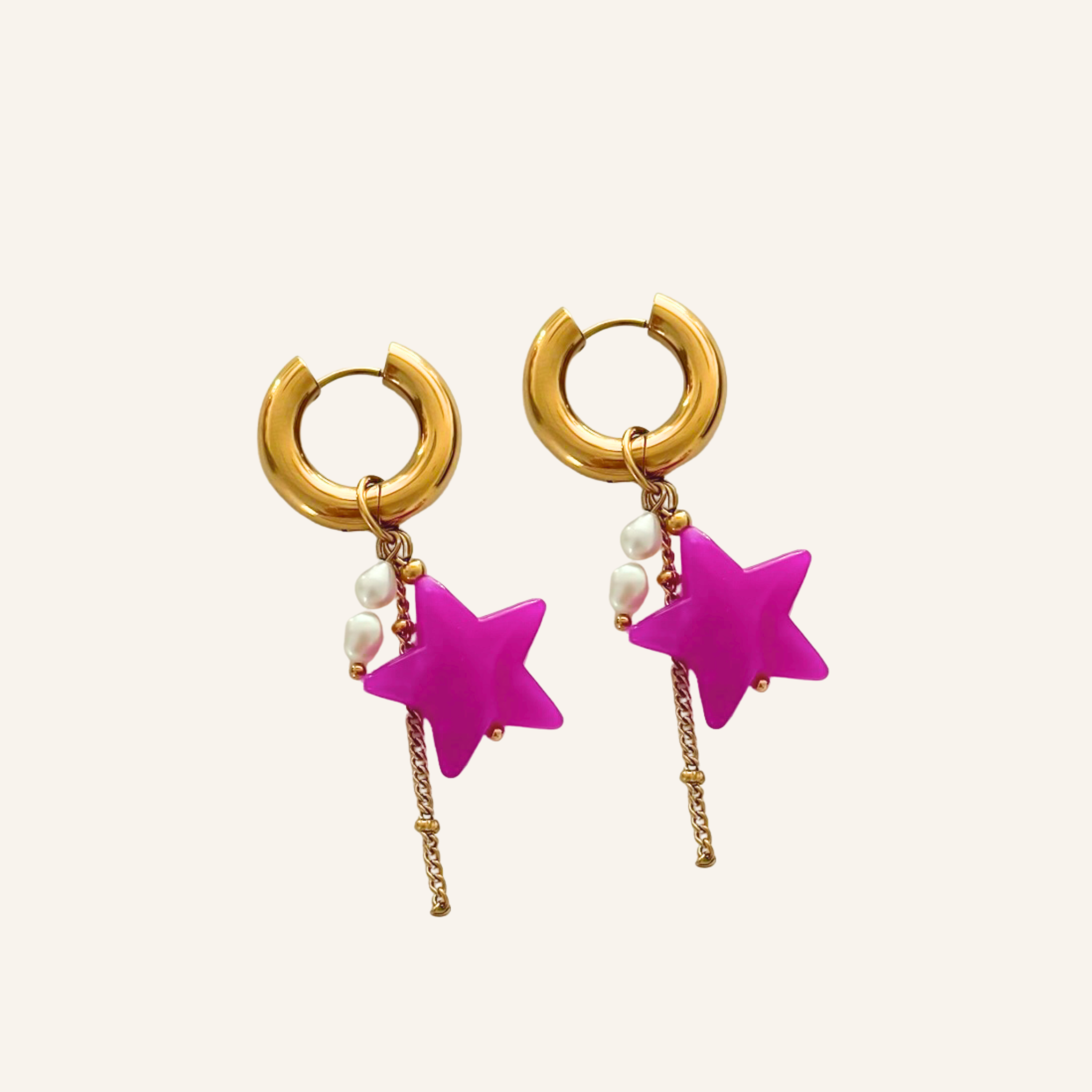 Deze stainless-steel hoops brengen een mix van een opvallende roze ster, parels en een speels kettinkje. De kleurrijke details geven elke outfit een funky, trendy twist. Perfect voor party nights, festivals of als playful touch bij je dagelijkse stijl. Combineer ze met onze Supernova bracelet of necklace voor een complete starry look.