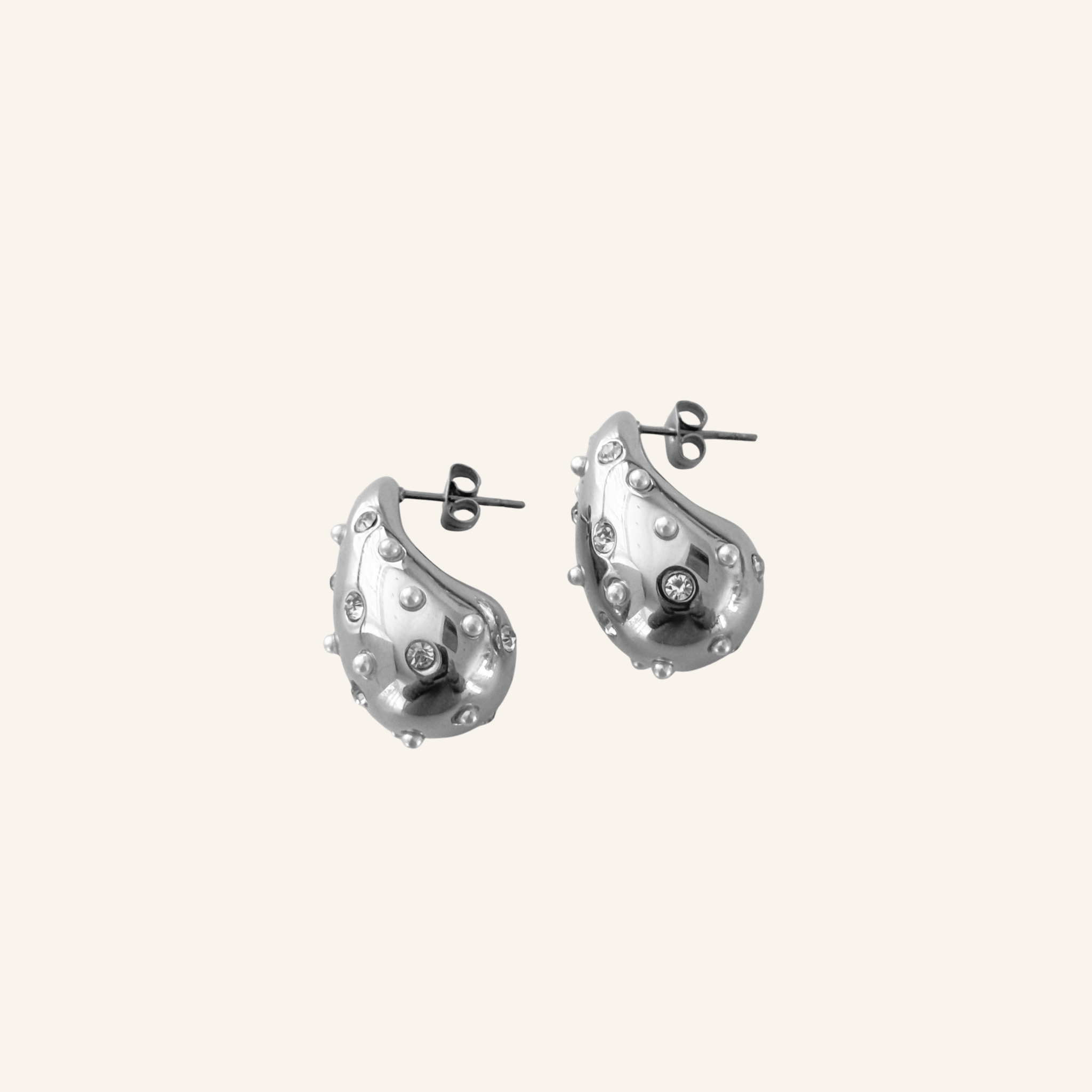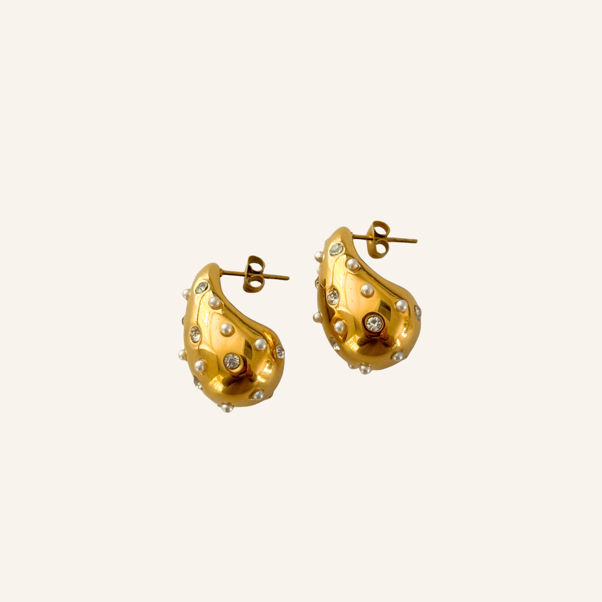 Op zoek naar statement oorbellen met een unieke twist? Deze druppelvormige stud oorbellen van roestvrij staal zijn versierd met sprankelende strass steentjes en subtiele pareldetails die het licht prachtig vangen. De combinatie van zachte rondingen en glanzende accenten geeft ze een moderne, luxueuze uitstraling. Verkrijgbaar in goud en zilver ā perfect om elke look een vleugje glamour te geven, van dinner date tot night out. Met deze eyecatchers steel je gegarandeerd de show!